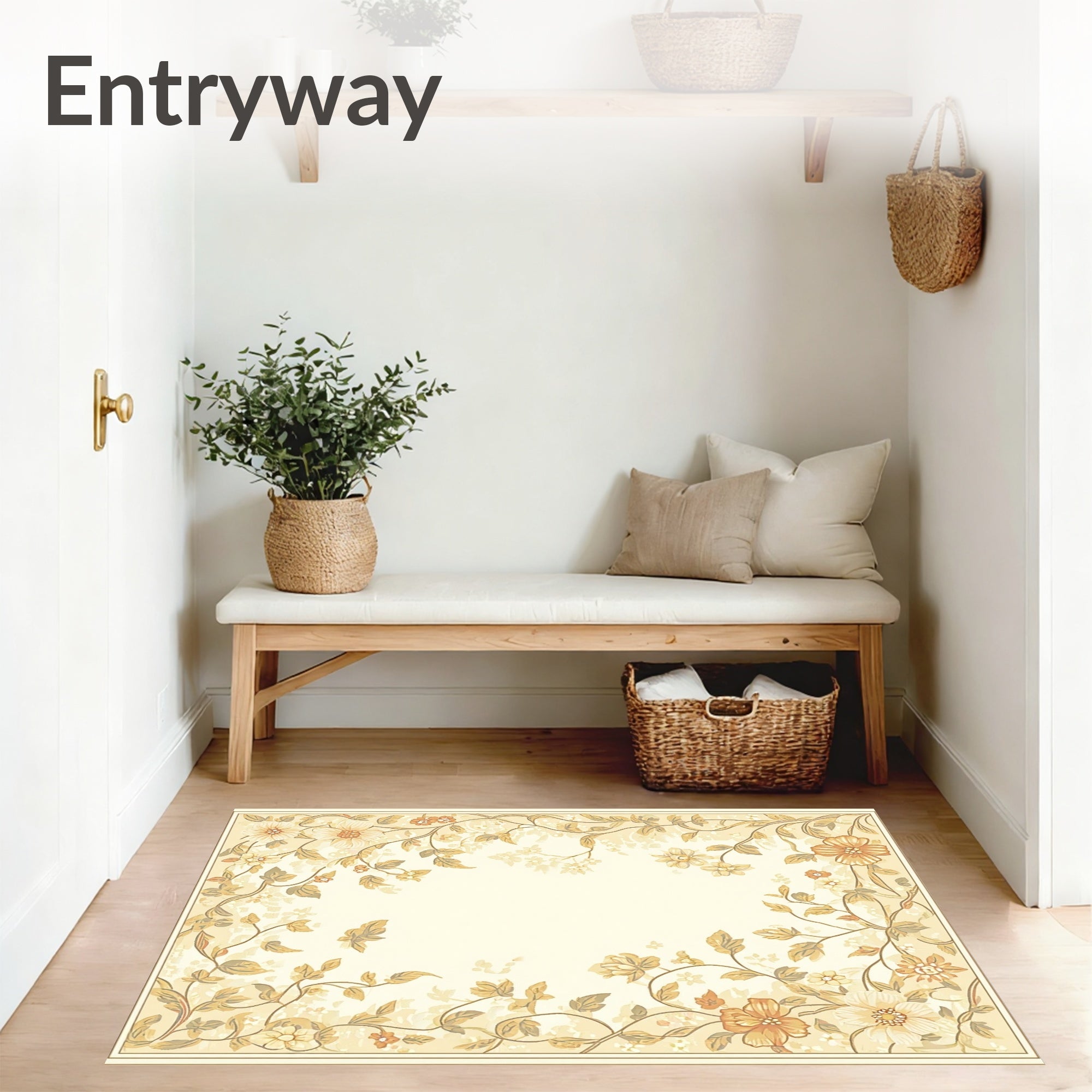 Flatwoven High Traffic Area Rug, Sophisticated Ornamental Botanical Print in Warm Cream and Beige, Non Slip, Stain Resistant, Washable Area Rugs for Living Room, Bedroom (Beige) Overview: