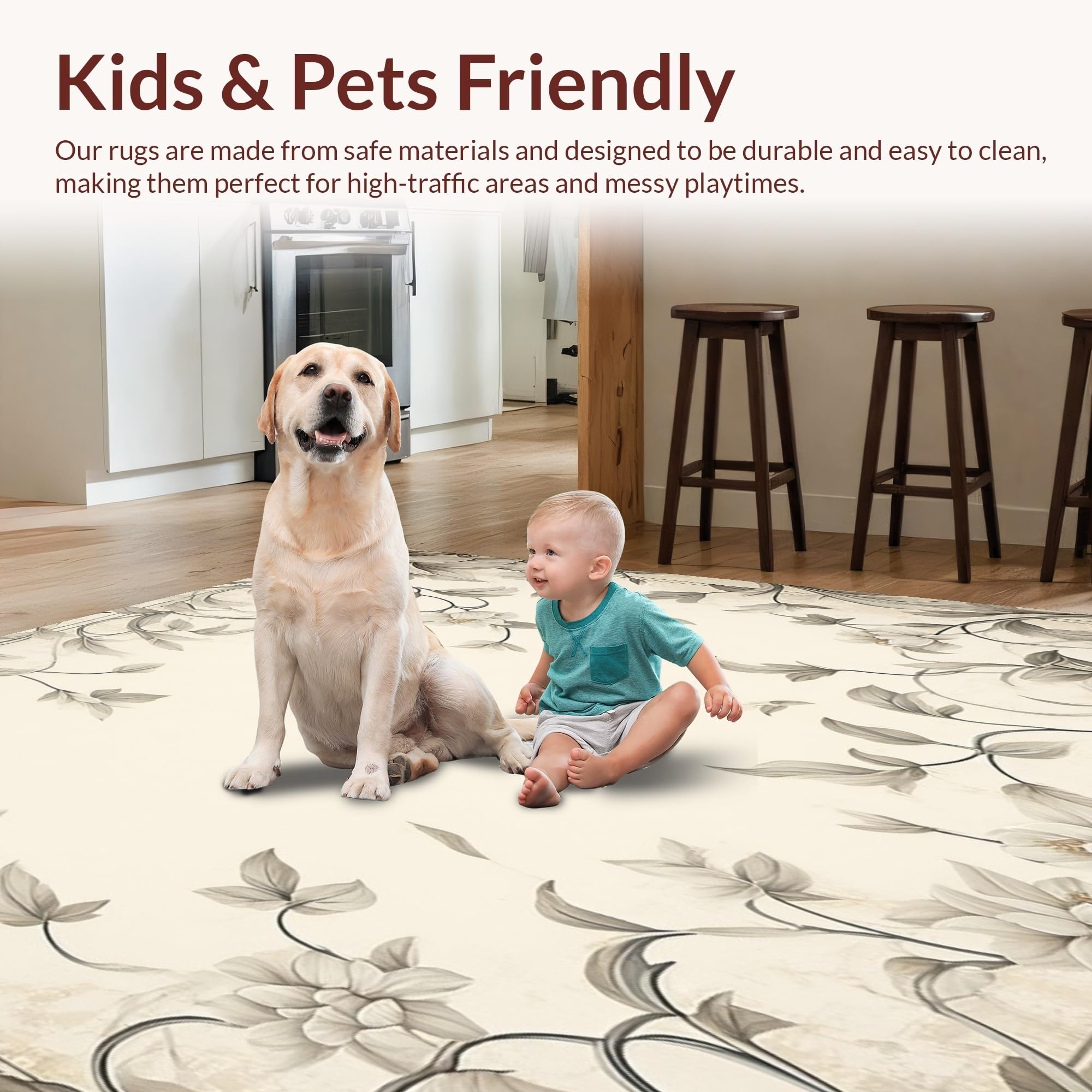 Ultra Soft Area Rug, Non Slip, Stain Resistant, Washable Area Rugs for Living Room, Bedroom, Sophisticated Beige with Smoke Floral Embellishments and Leaf(Beige) Overview: