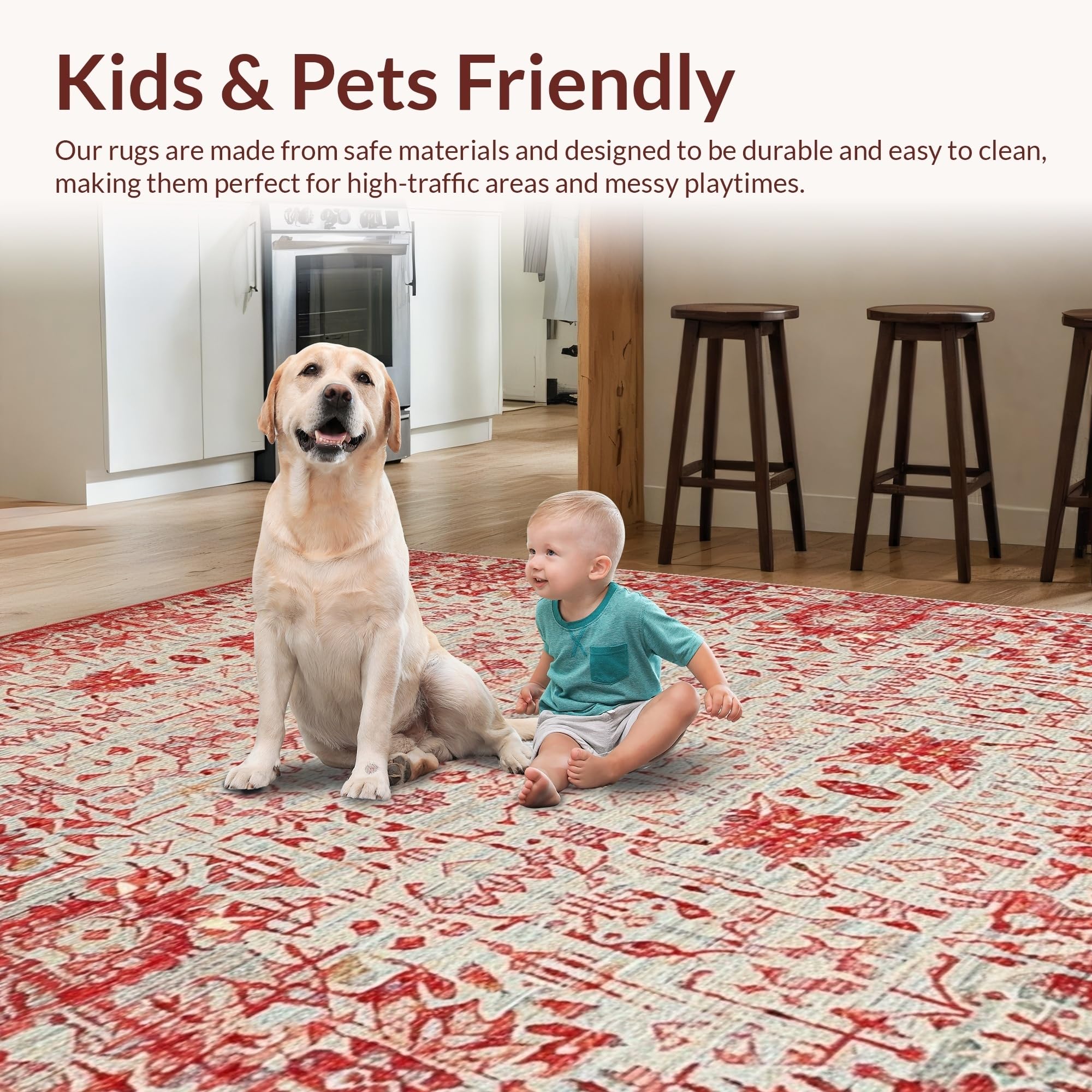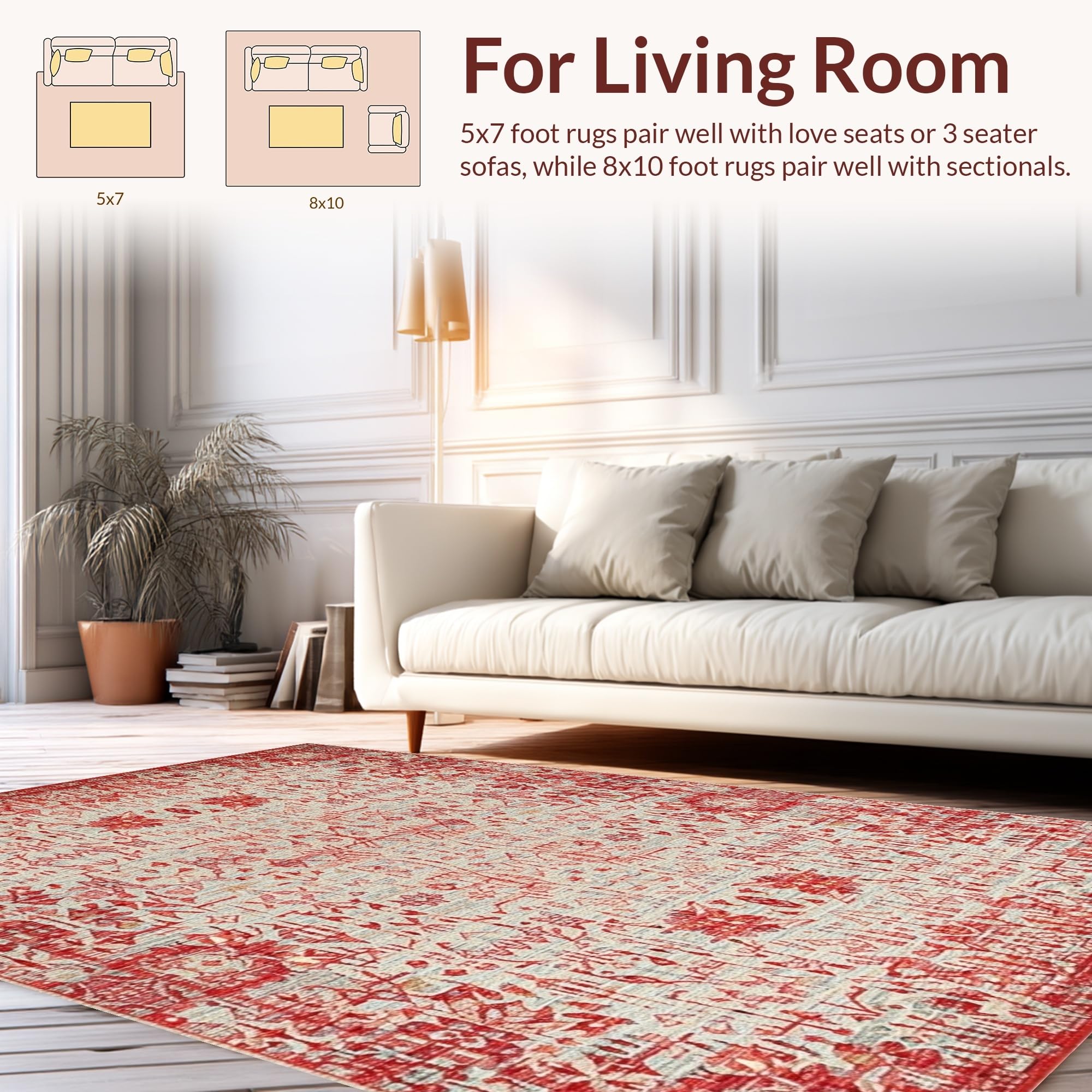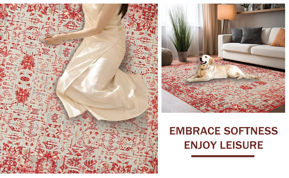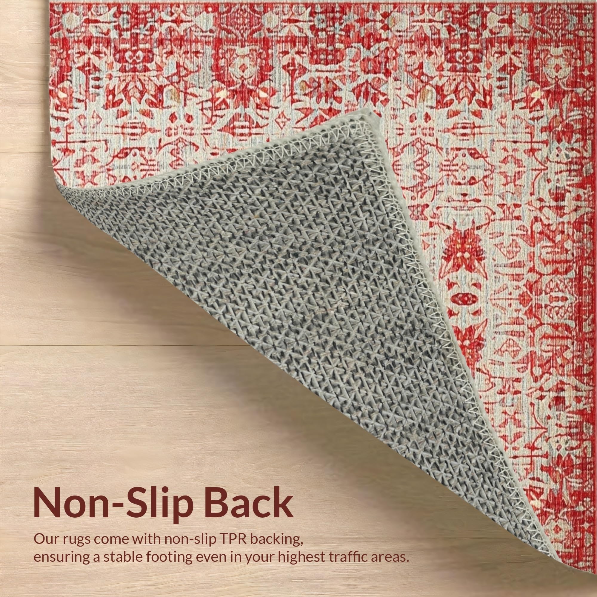 Ultra Soft Area Rug, Non Slip, Stain Resistant, Washable Area Rugs for Living Room, Bedroom, Sophisticated Circular Floral Accents(Red) Overview: