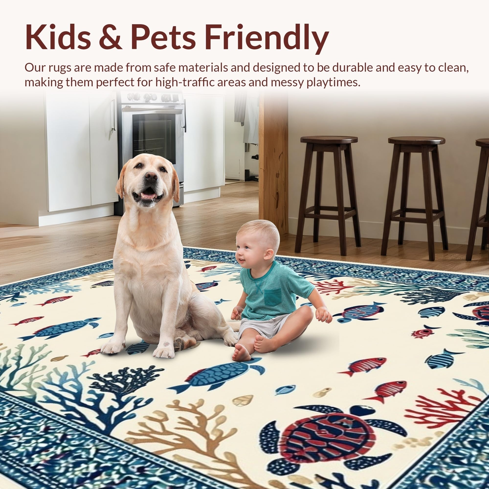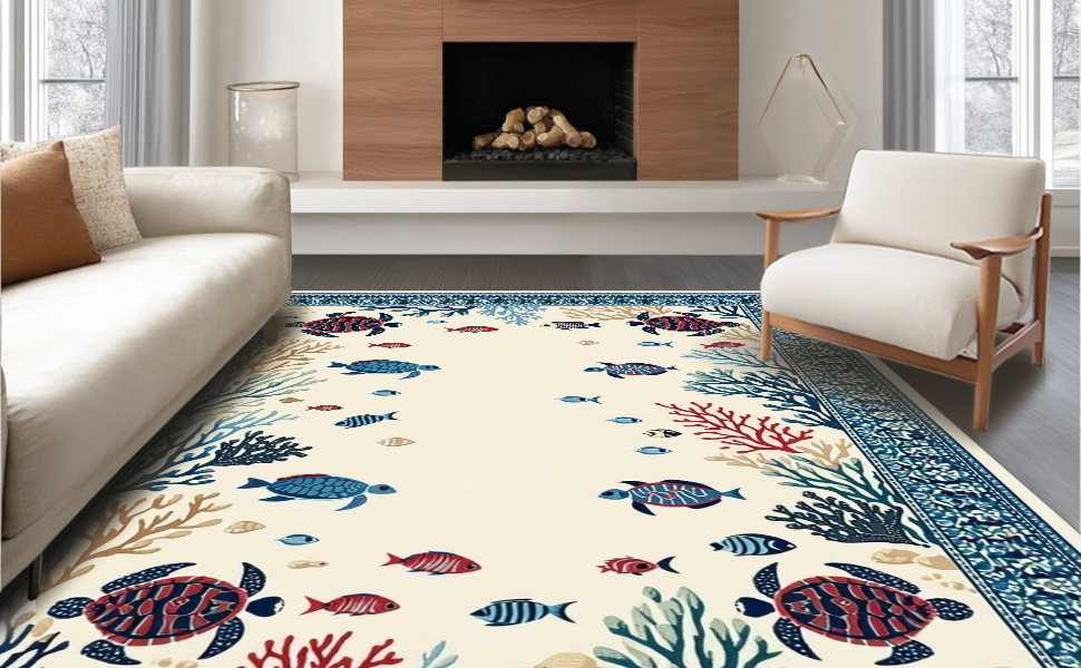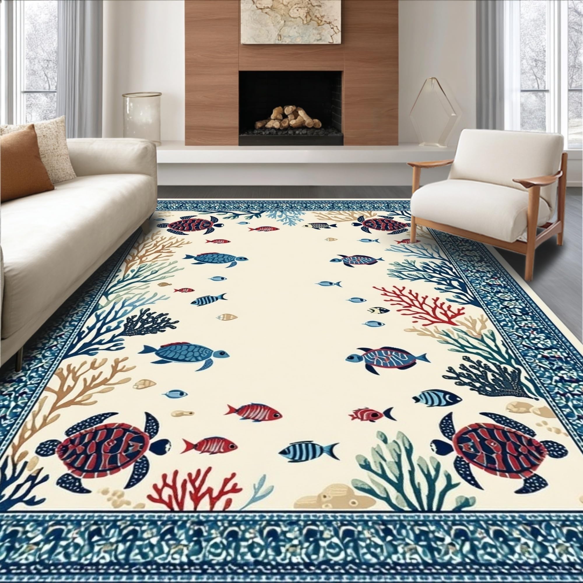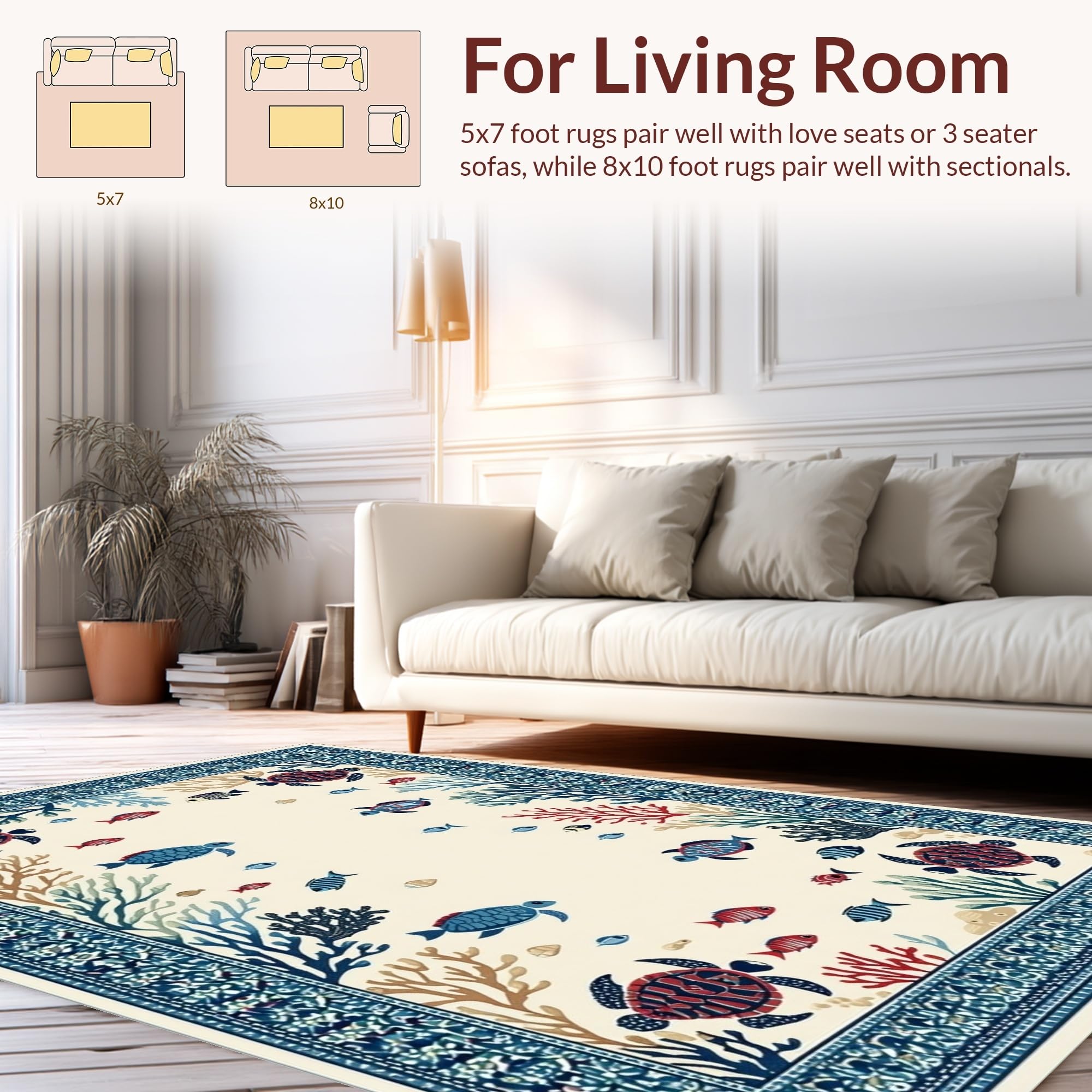 Ultra Soft Area Rug, Non Slip, Stain Resistant, Washable Area Rugs for Living Room, Bedroom, Sophisticated Marine Life Representation(Beige) Overview: