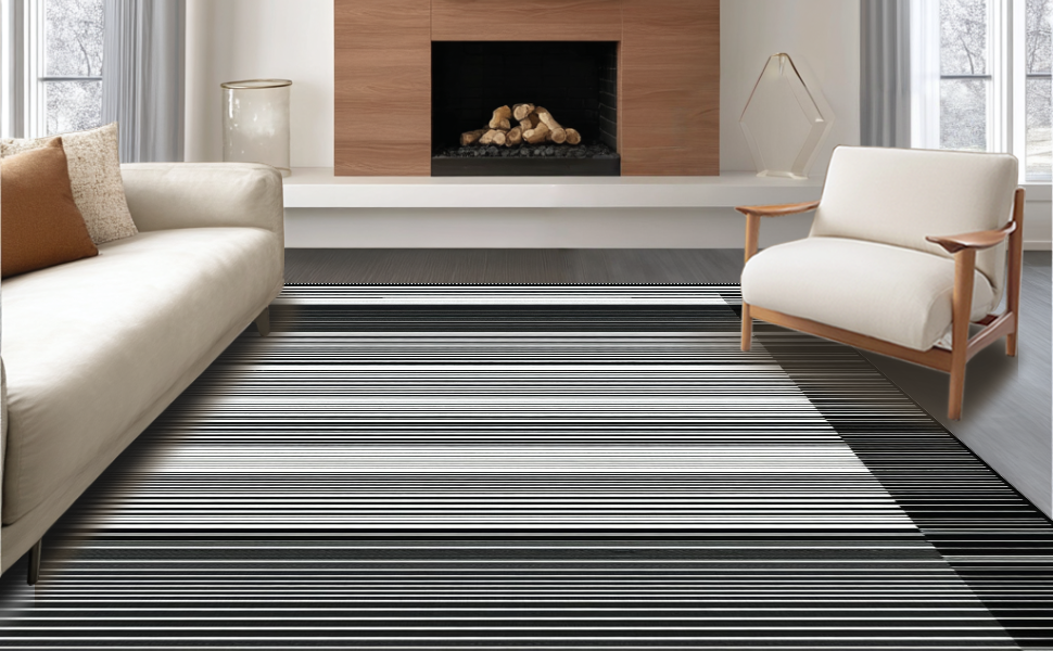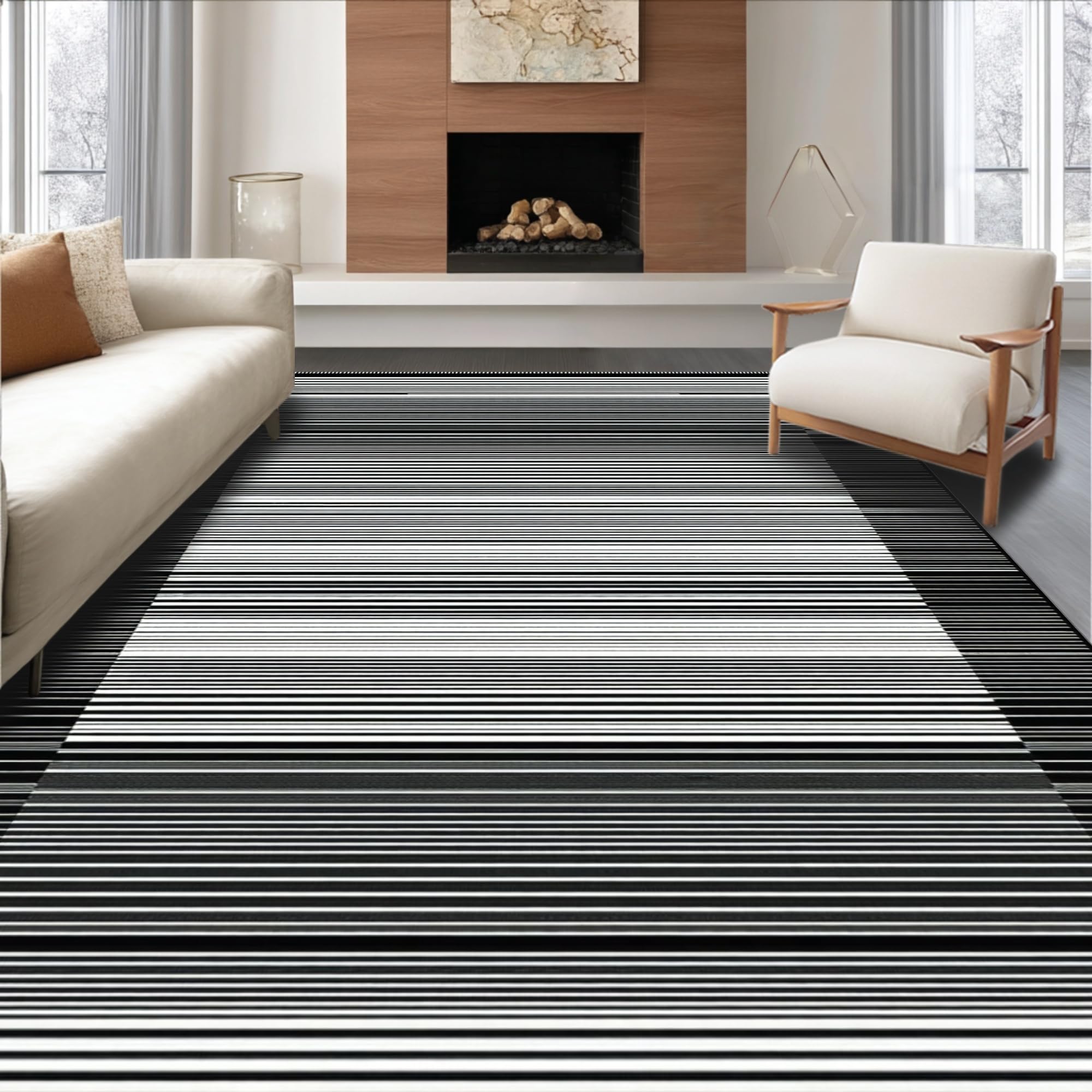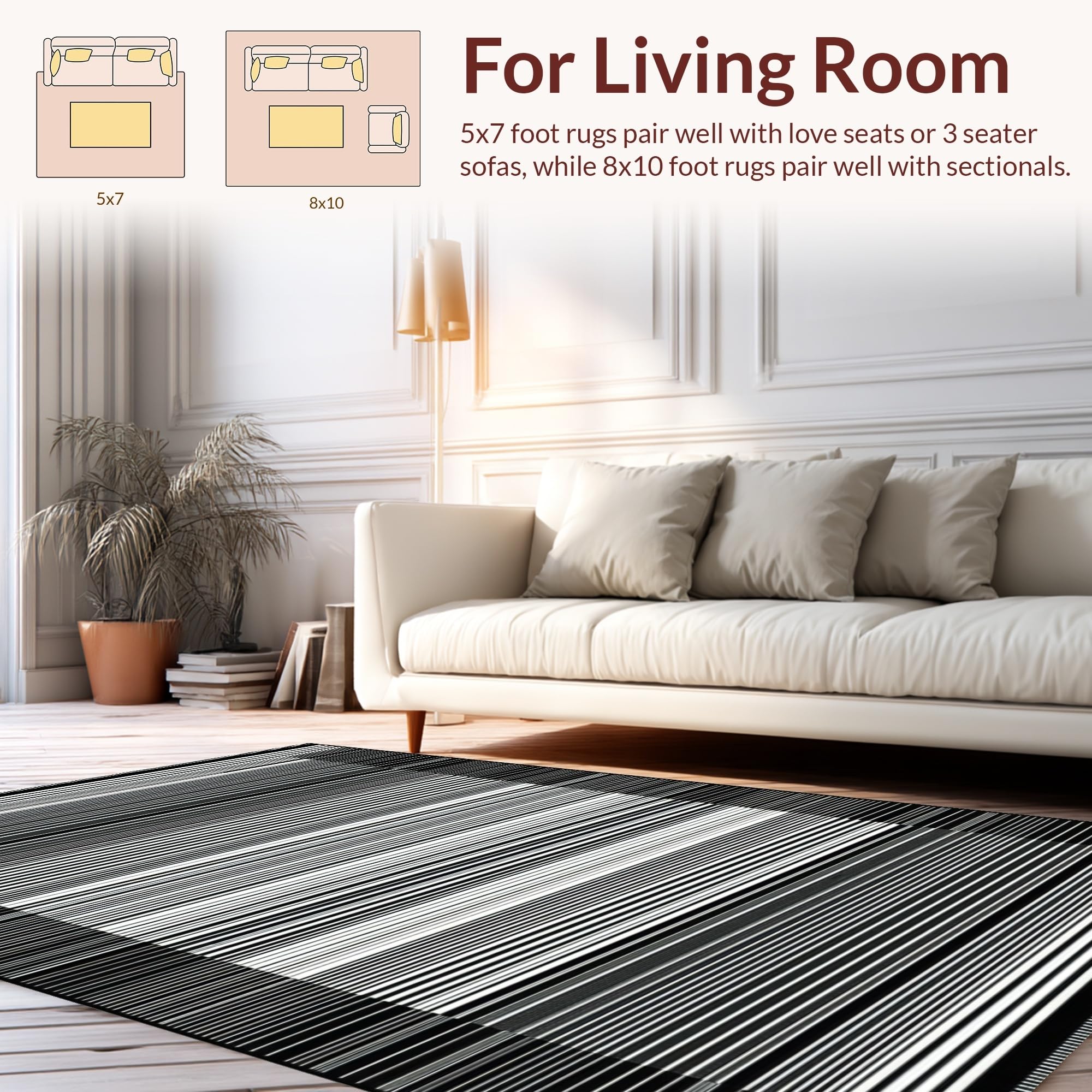 Ultra Soft Area Rug, Non Slip, Stain Resistant, Washable Area Rugs for Living Room, Bedroom, Sophisticated Neutral Toned Stripes(Black) Overview:
