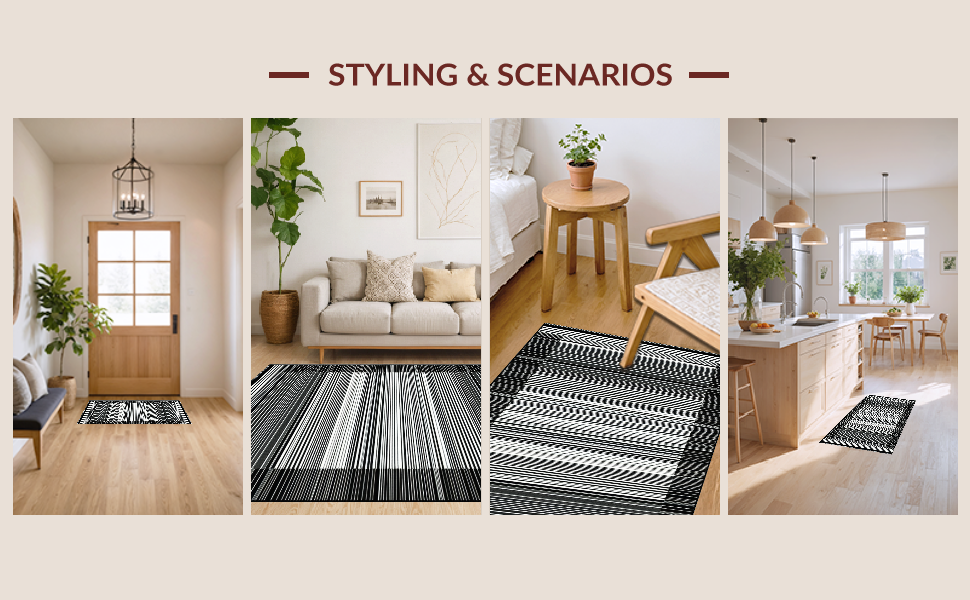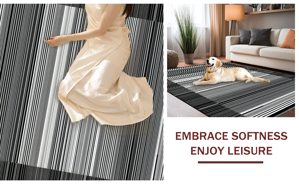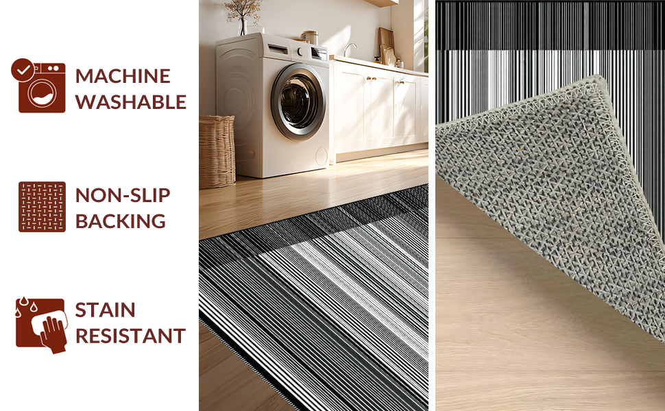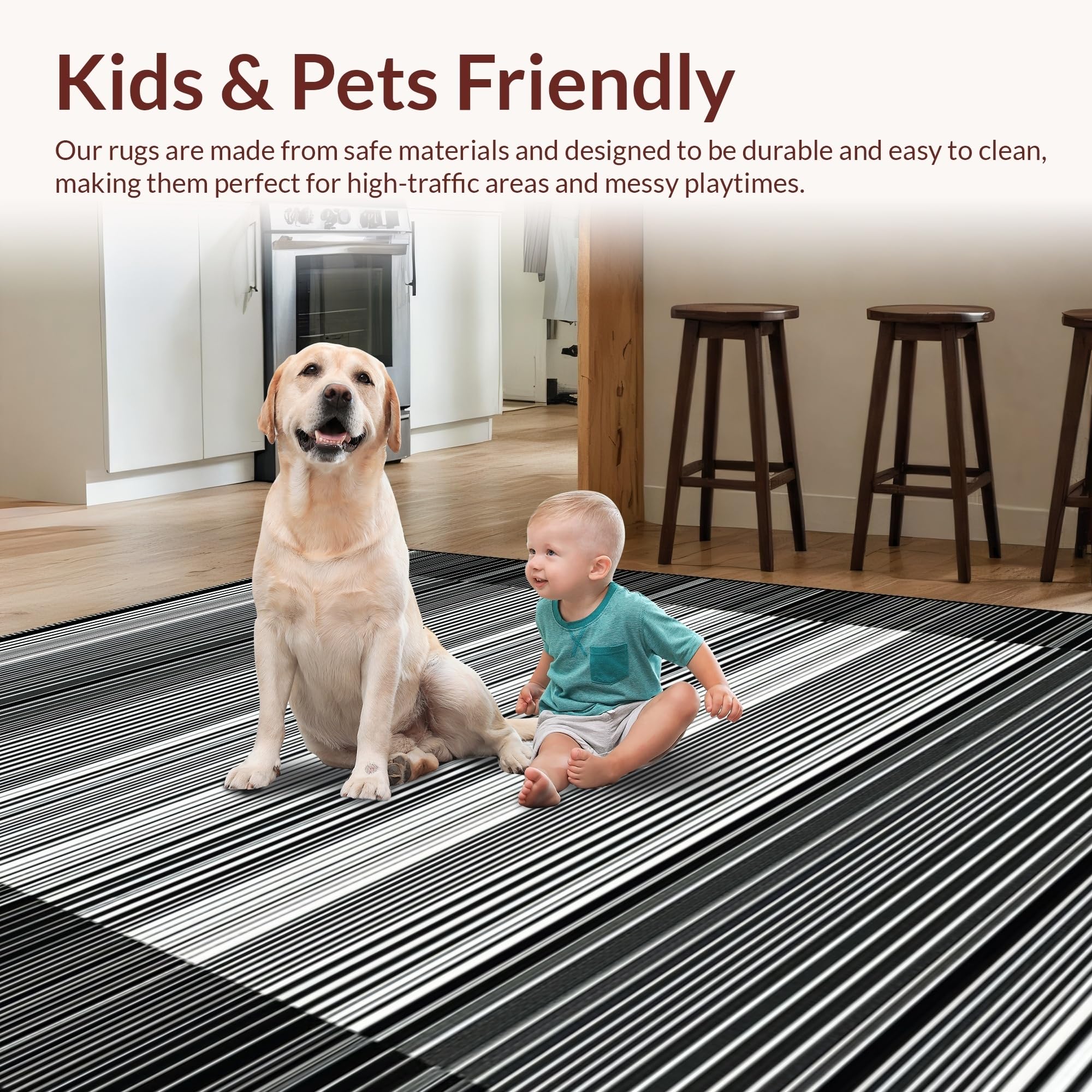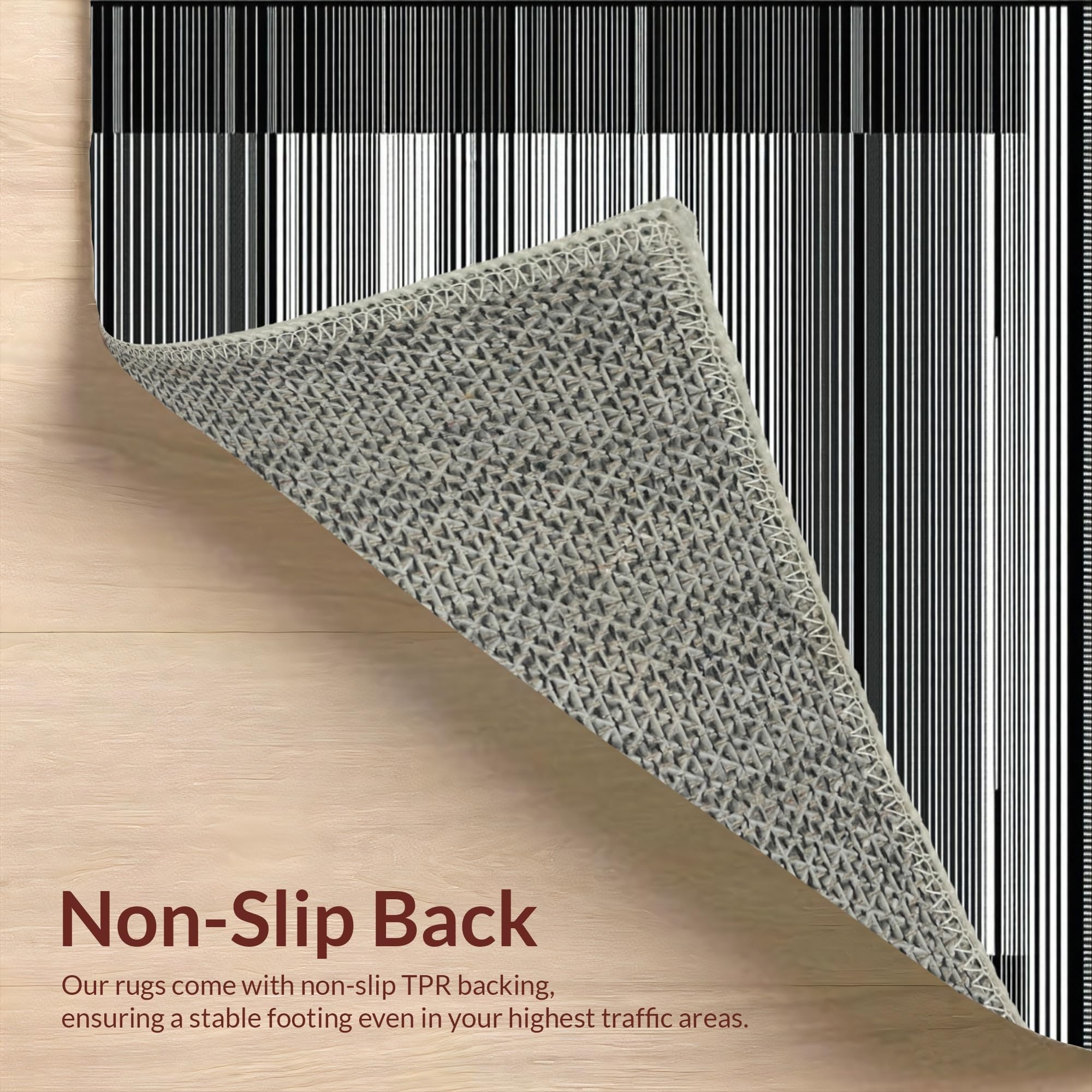 Ultra Soft Area Rug, Non Slip, Stain Resistant, Washable Area Rugs for Living Room, Bedroom, Sophisticated Neutral Toned Stripes(Black) Overview: