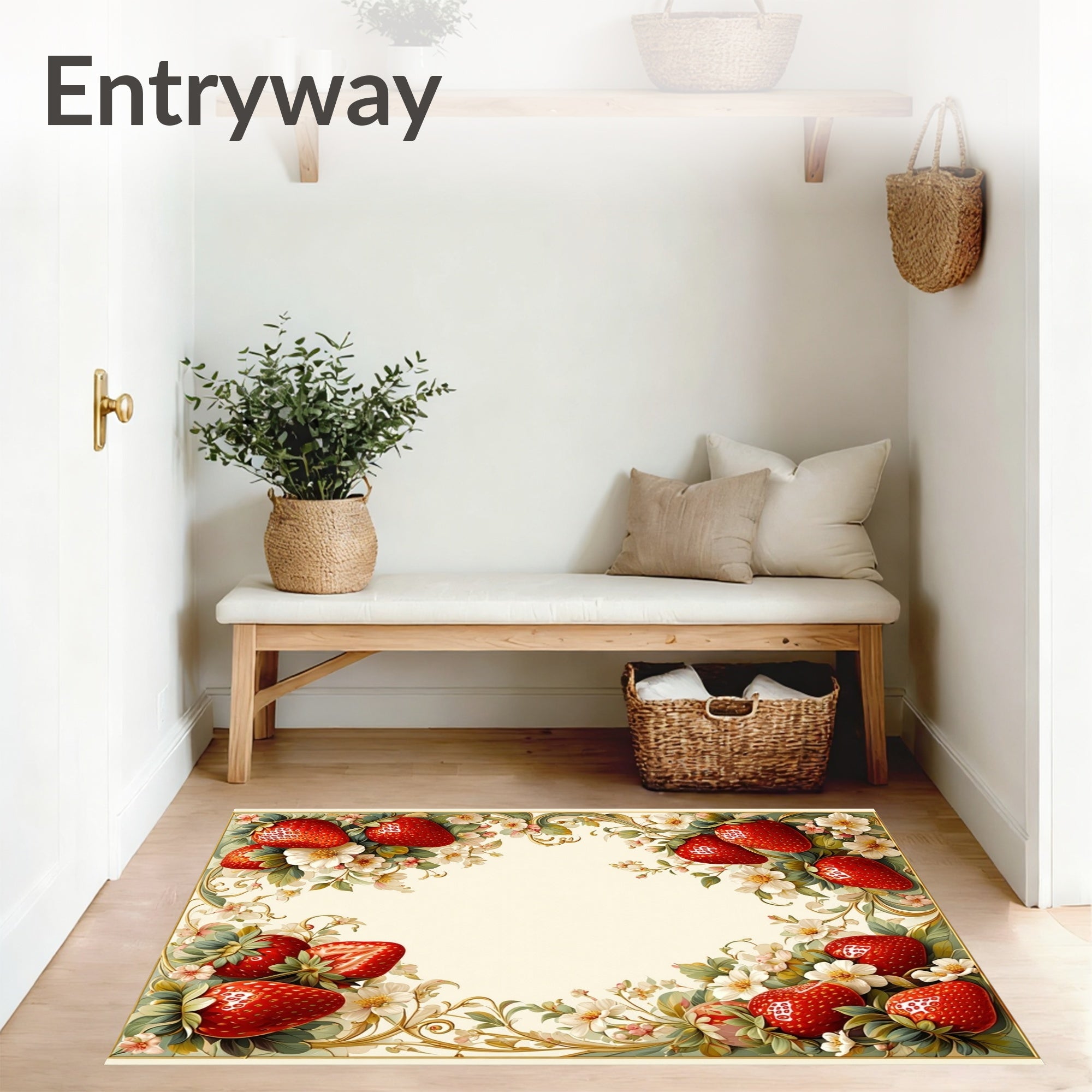 Flatwoven High Traffic Area Rug, Strawberry Entry, Non Slip, Stain Resistant, Washable Area Rugs for Living Room, Bedroom (White) Overview: