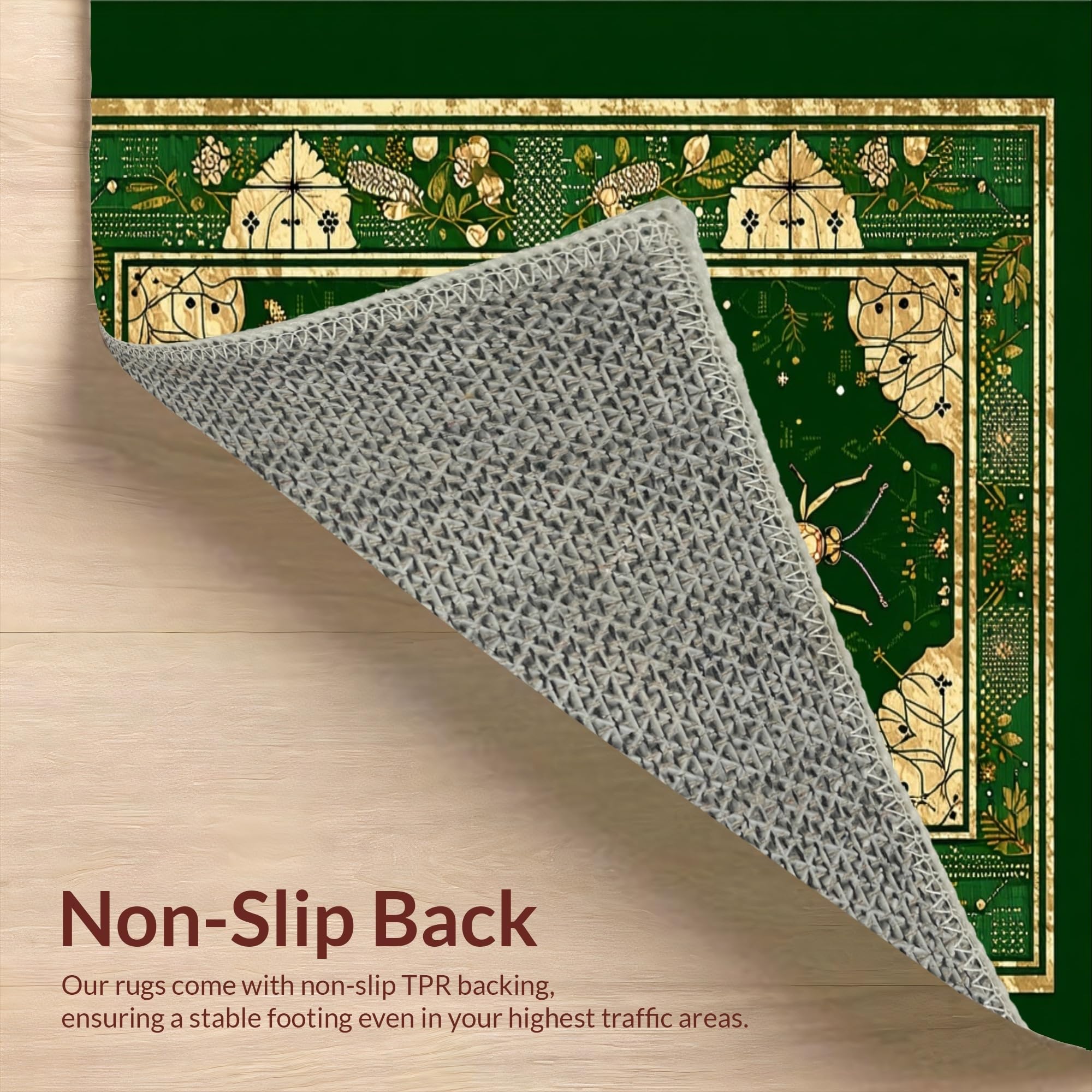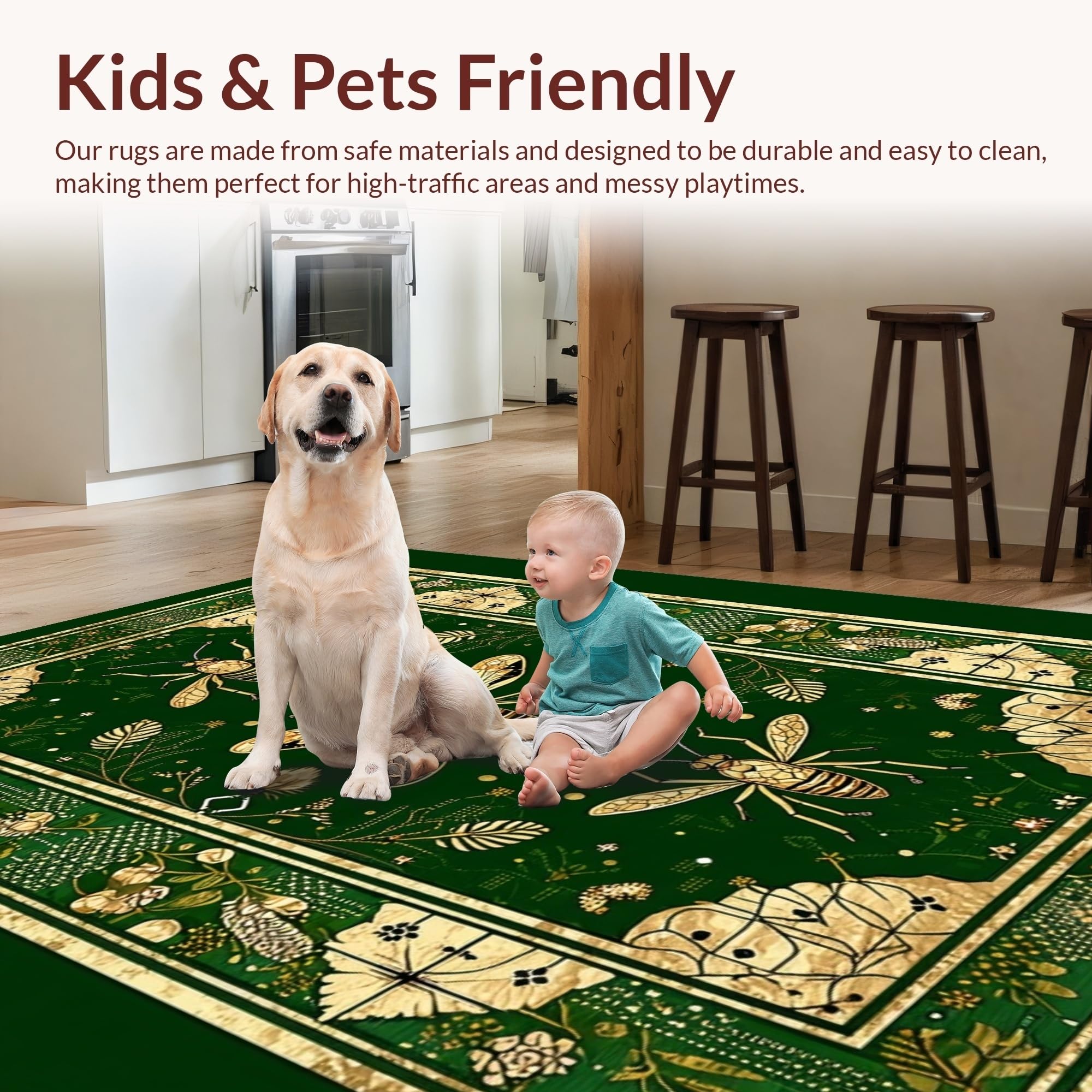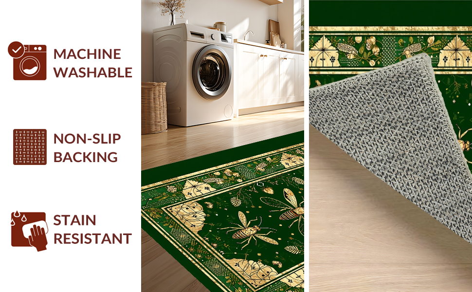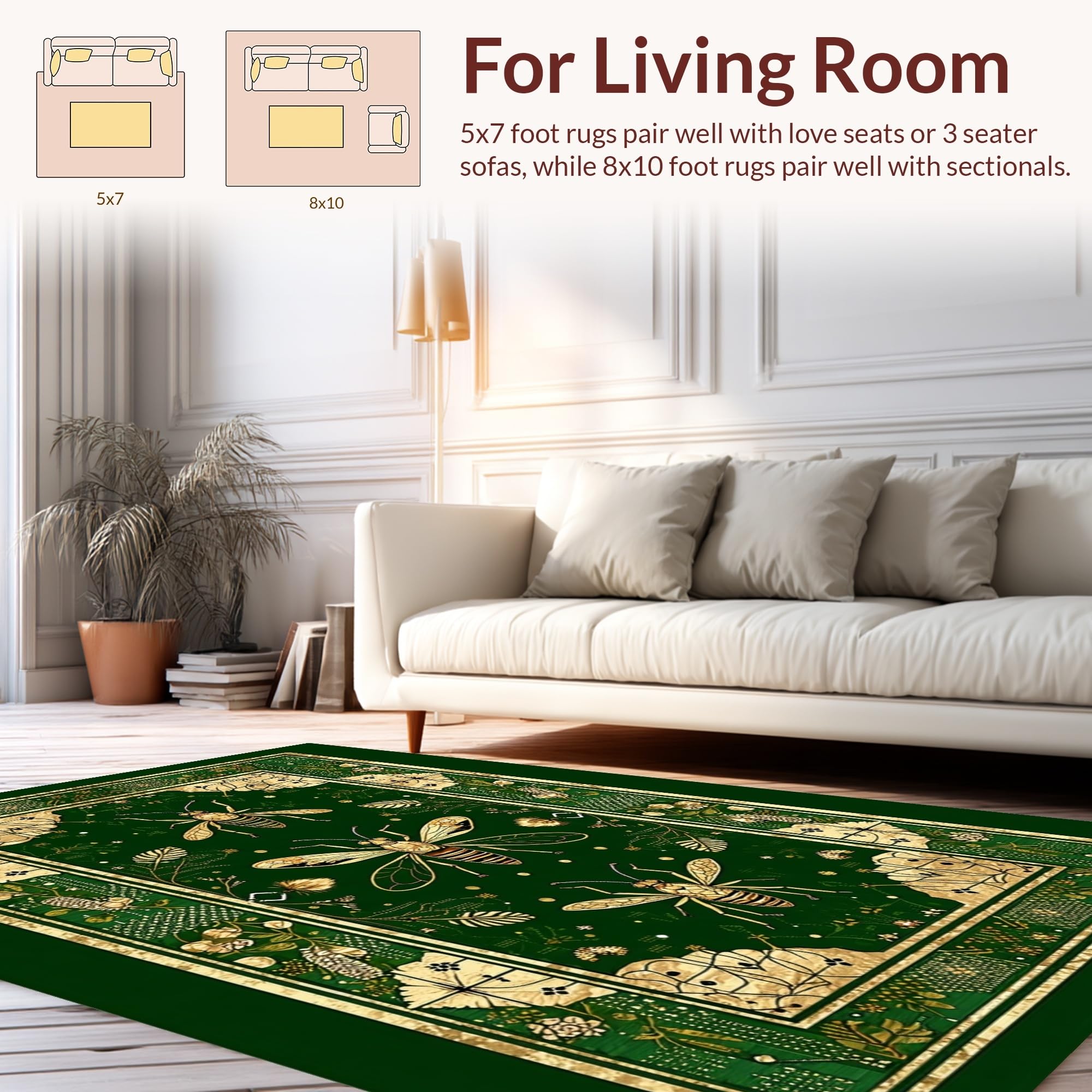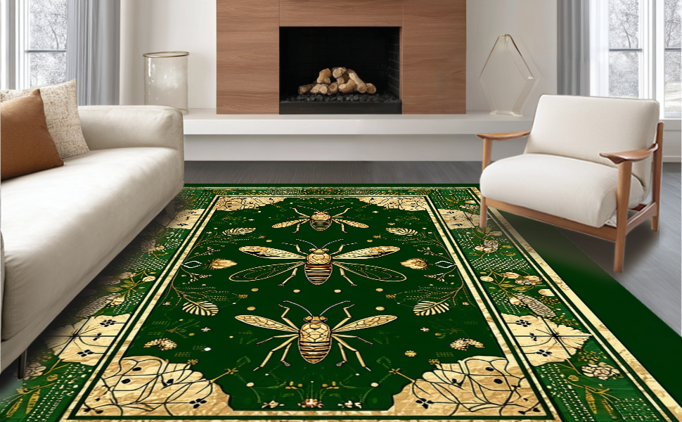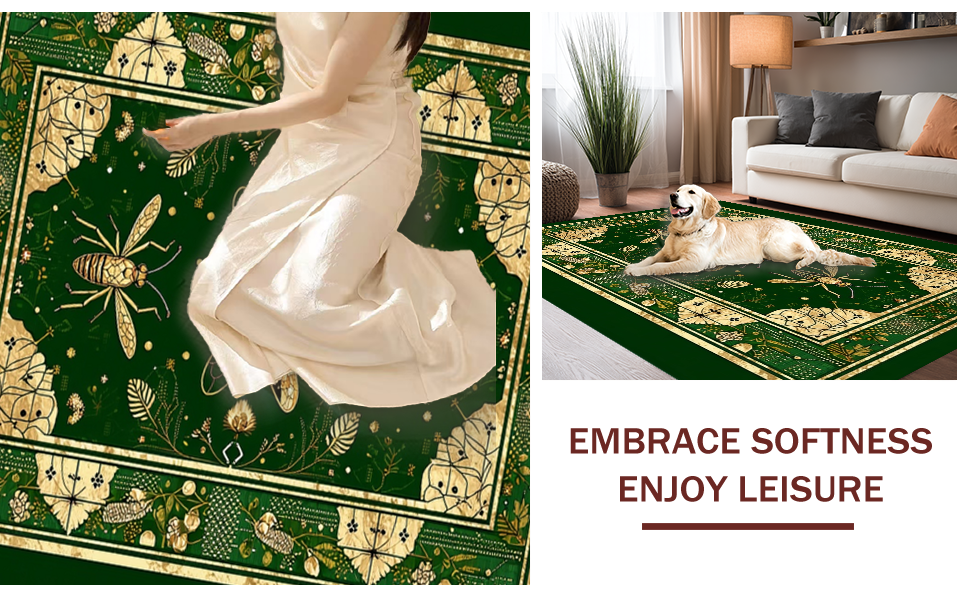 Ultra Soft Area Rug, Non Slip, Stain Resistant, Washable Area Rugs for Living Room, Bedroom, Striking Gold Accented Foliage(Green) Overview:
