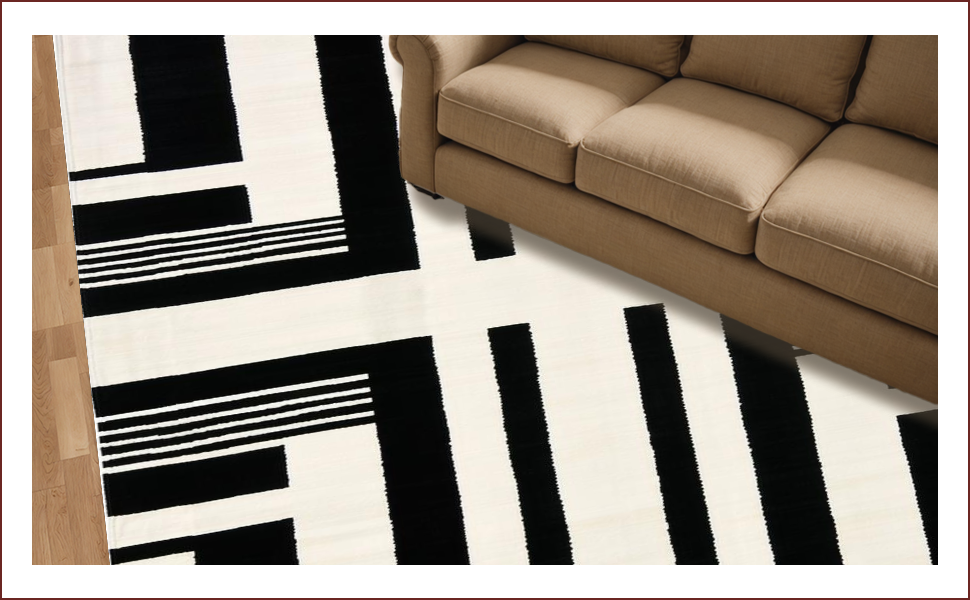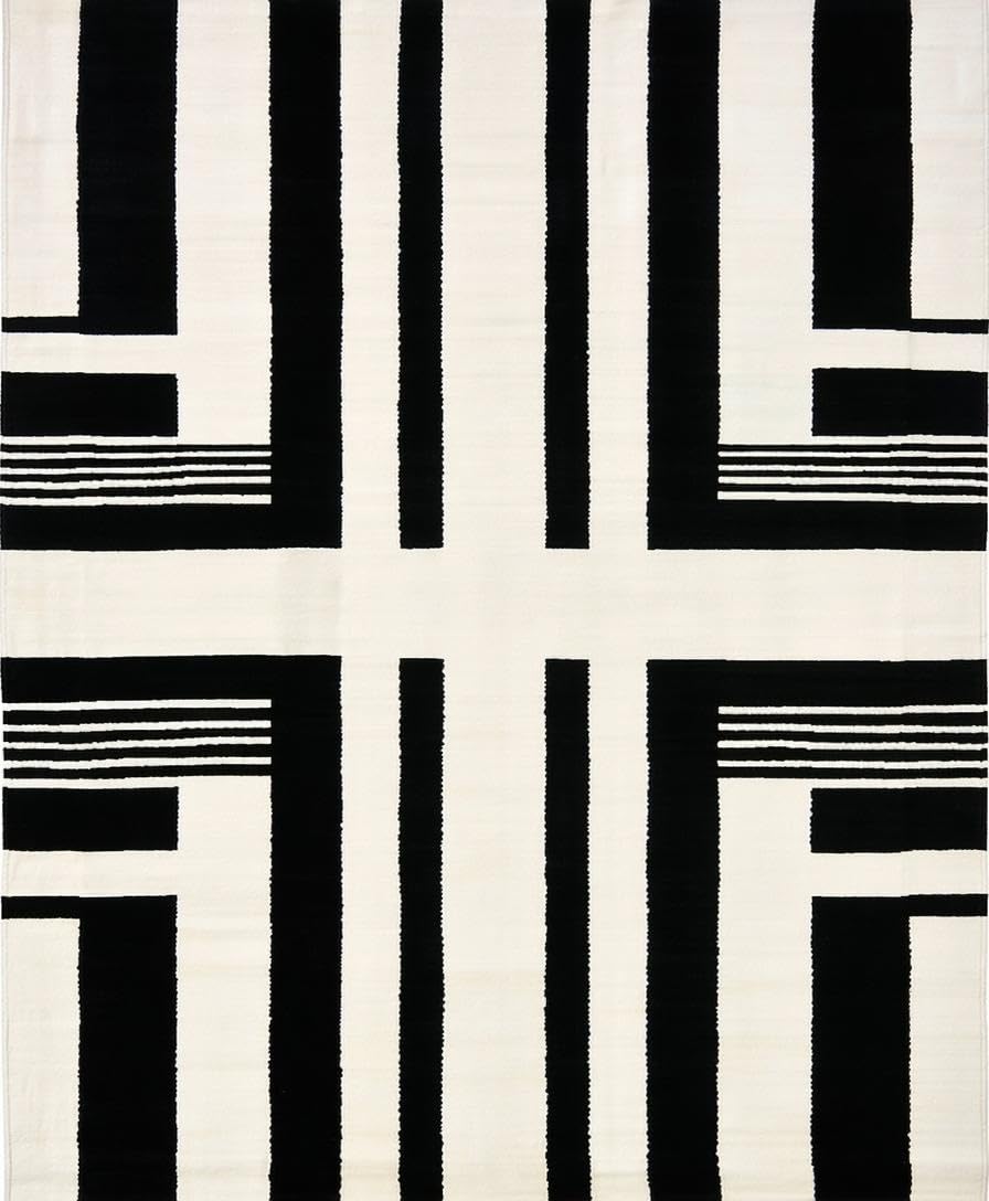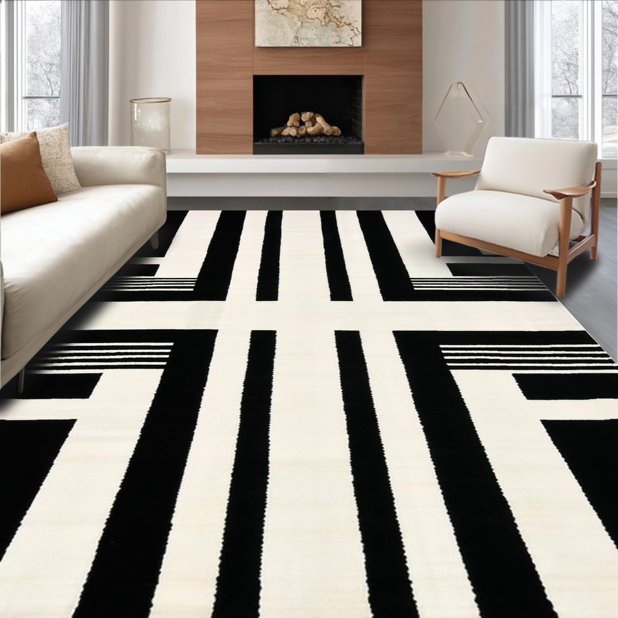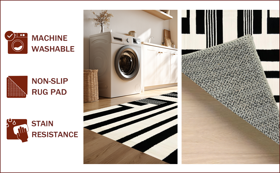Ultra Soft Area Rug, Non Slip, Stain Resistant, Washable Area Rugs for Living Room, Bedroom, Striking Monochrome Striped Aesthetic(Black) Overview: