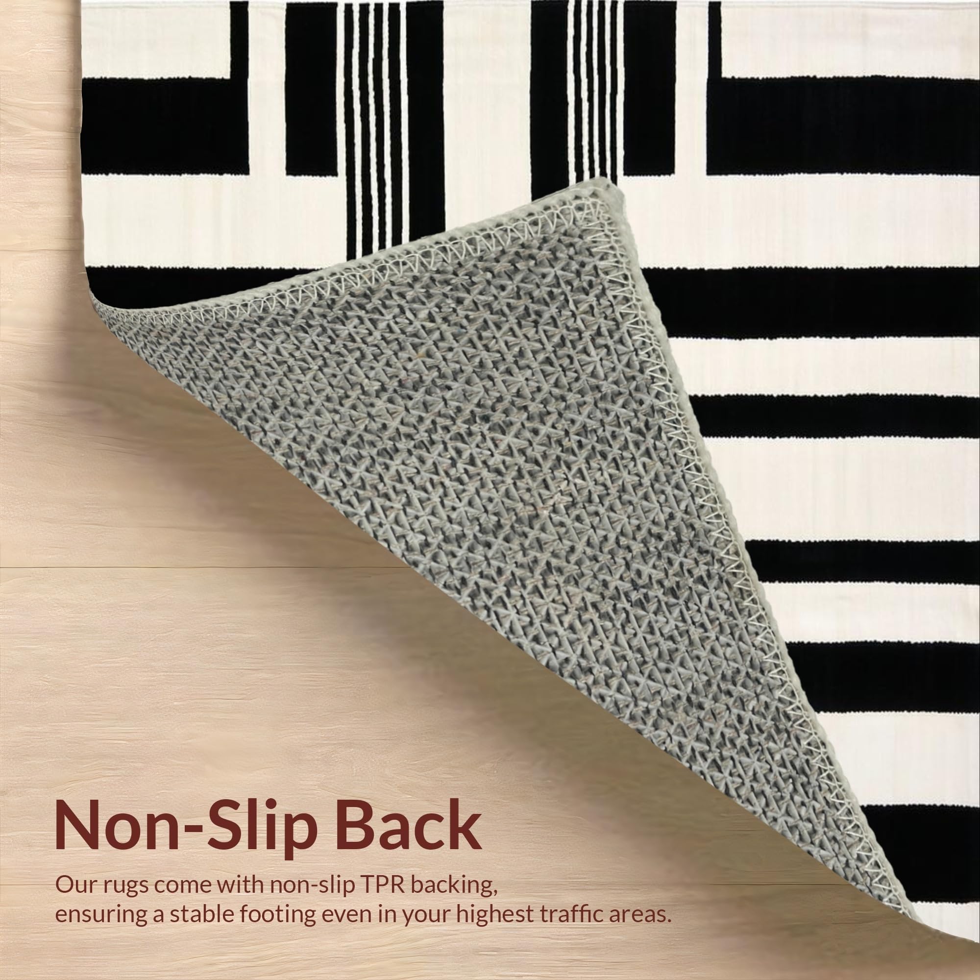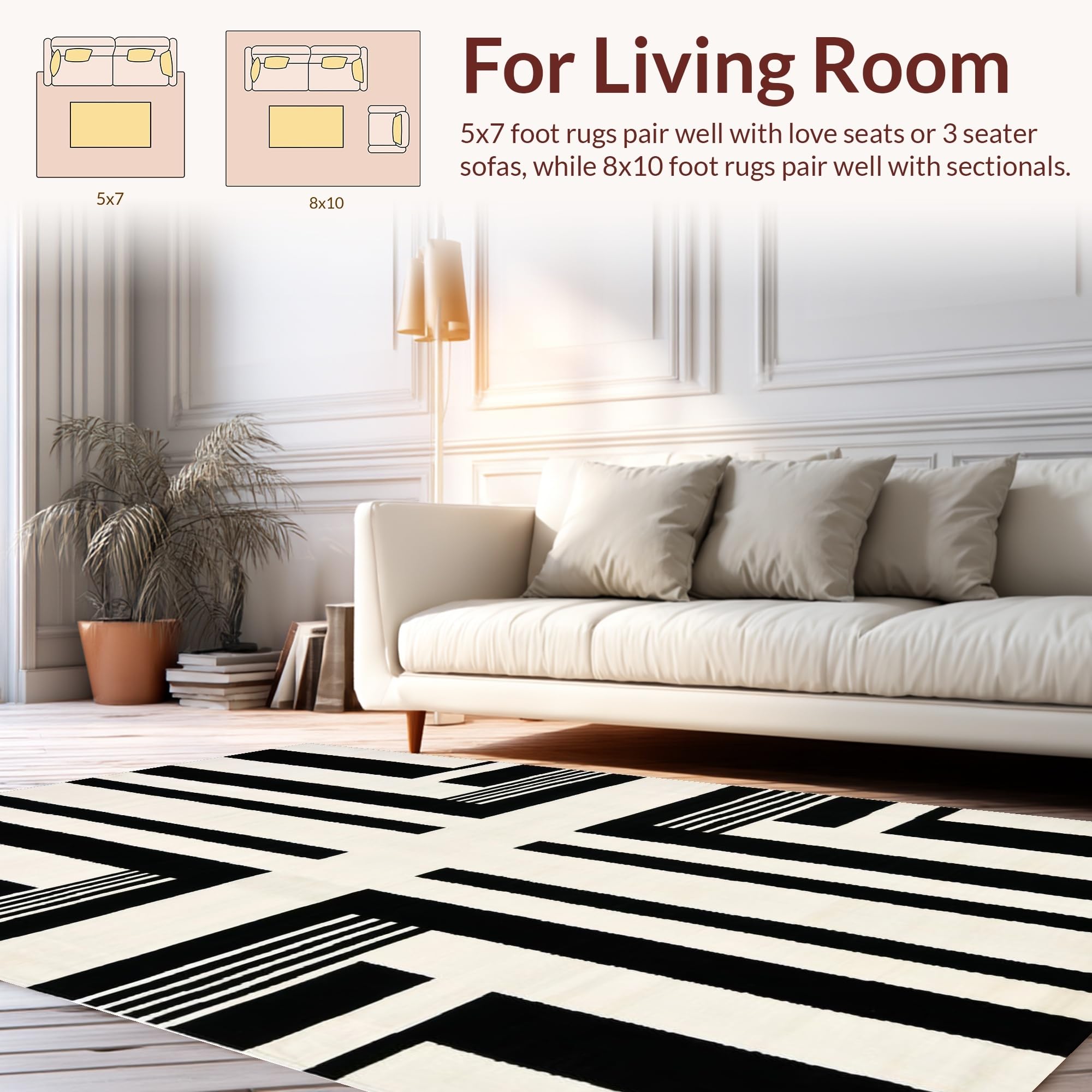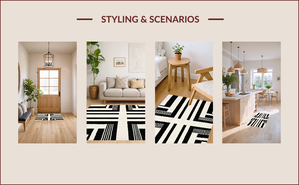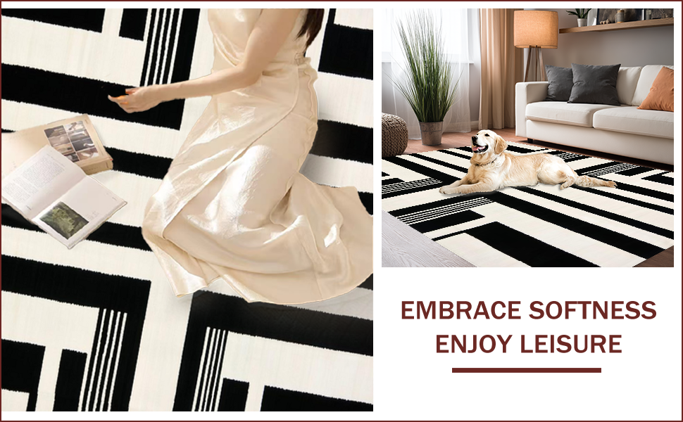 Ultra Soft Area Rug, Non Slip, Stain Resistant, Washable Area Rugs for Living Room, Bedroom, Striking Monochrome Striped Aesthetic(Black) Overview: