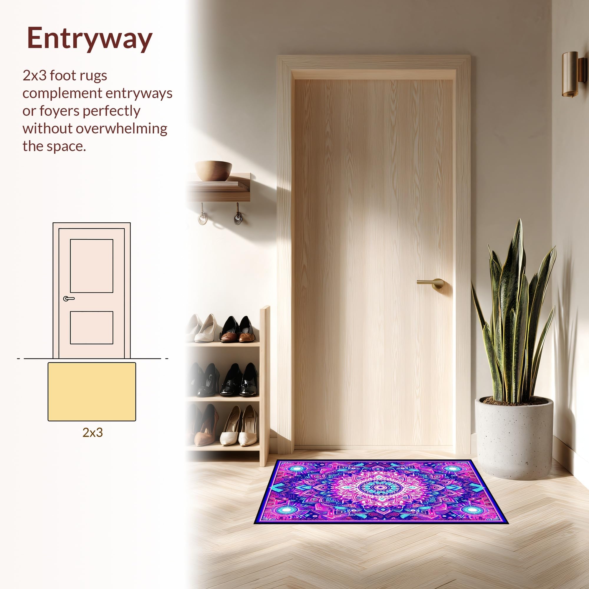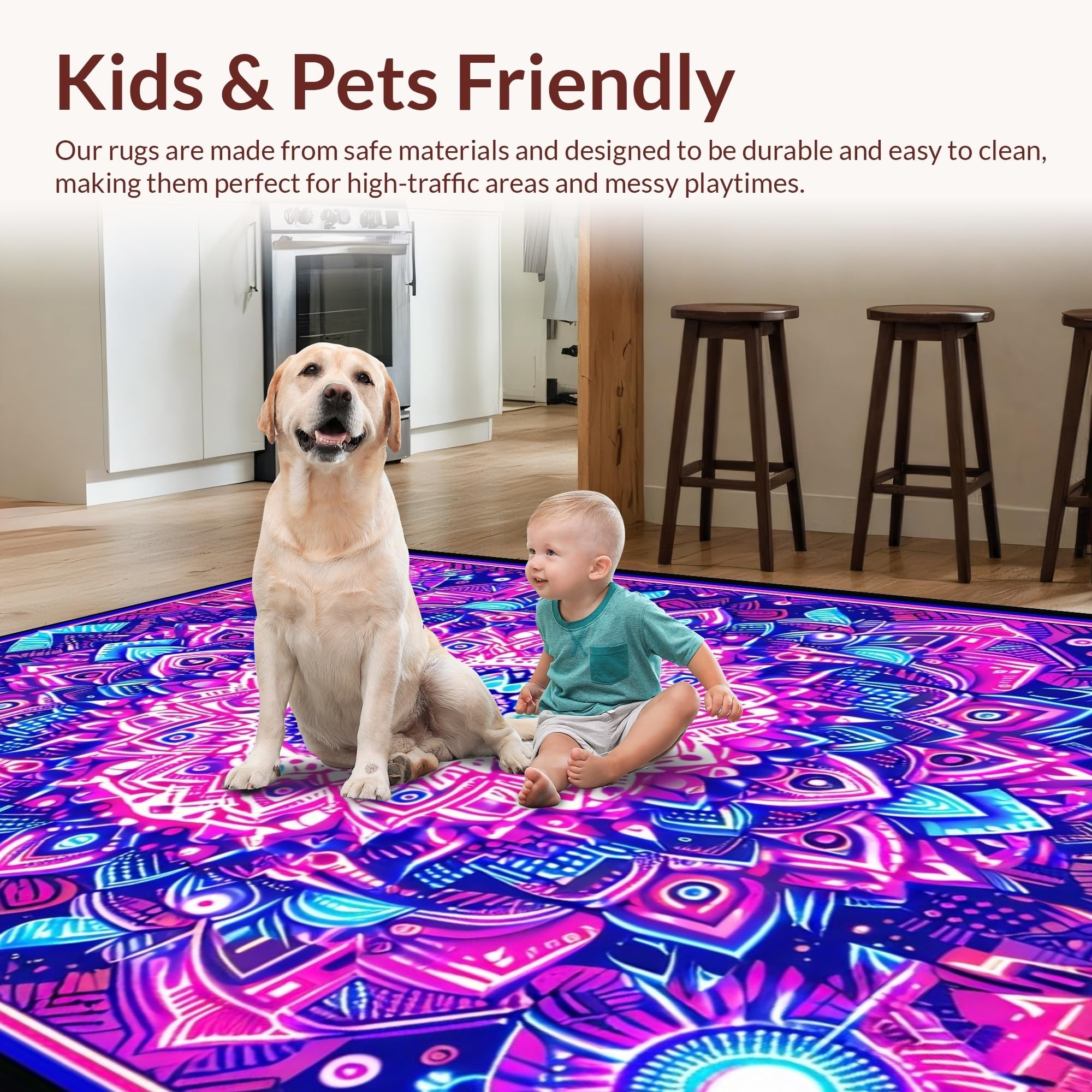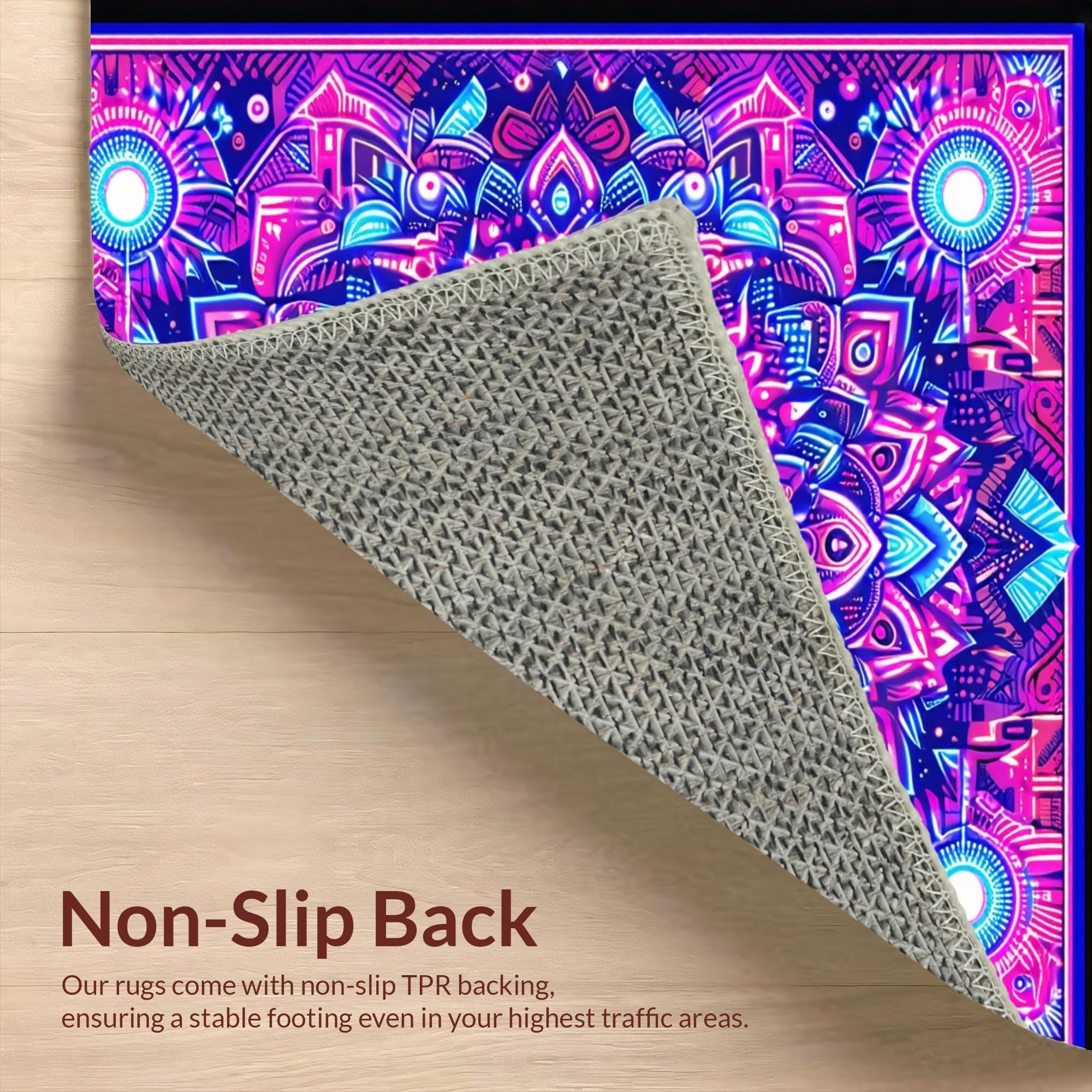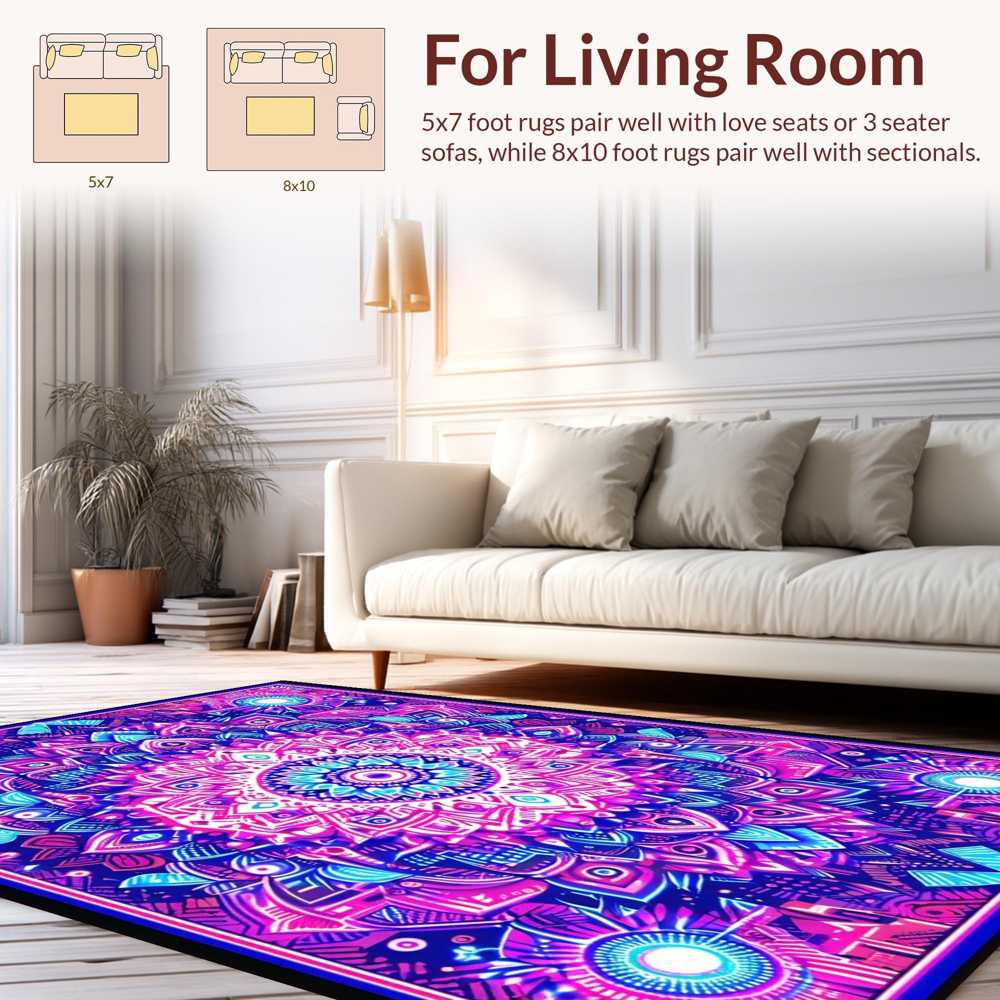 Ultra Soft Area Rug, Non Slip, Stain Resistant, Washable Area Rugs for Living Room, Bedroom, Striking UV Reactive Circular Art(Purple) Overview: