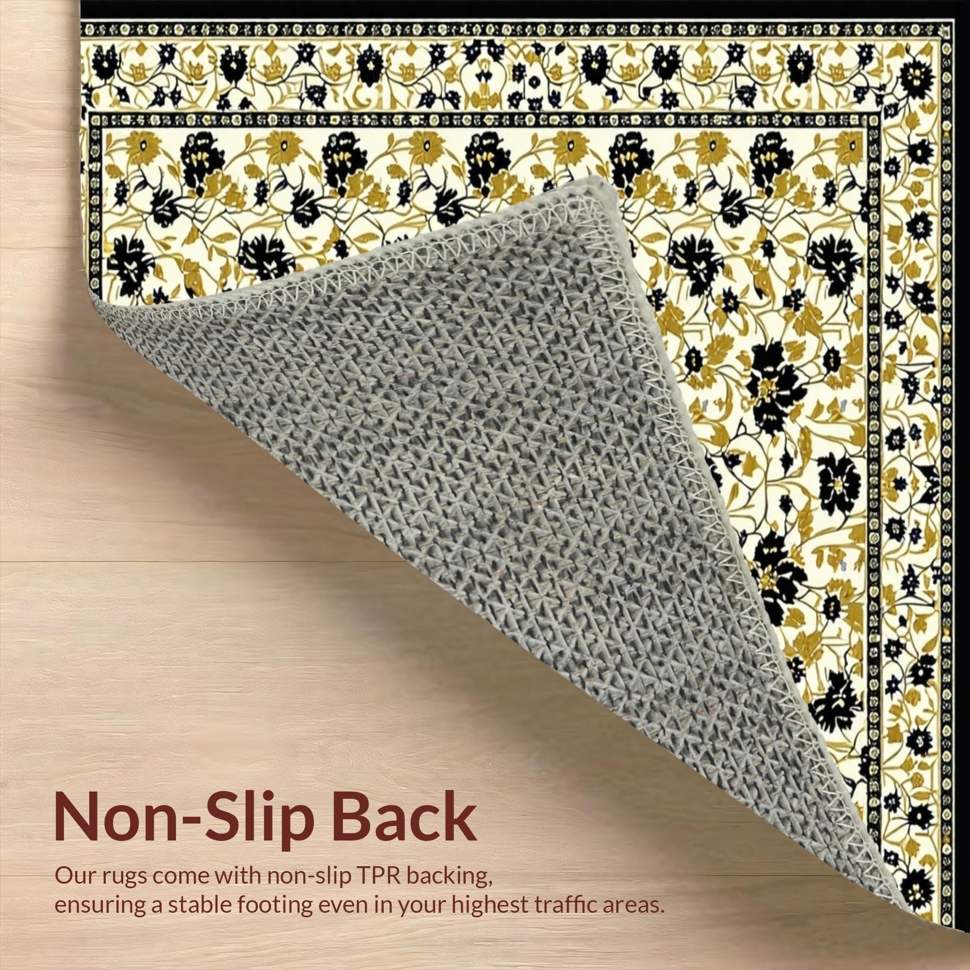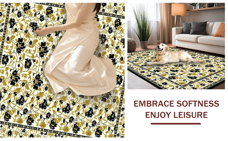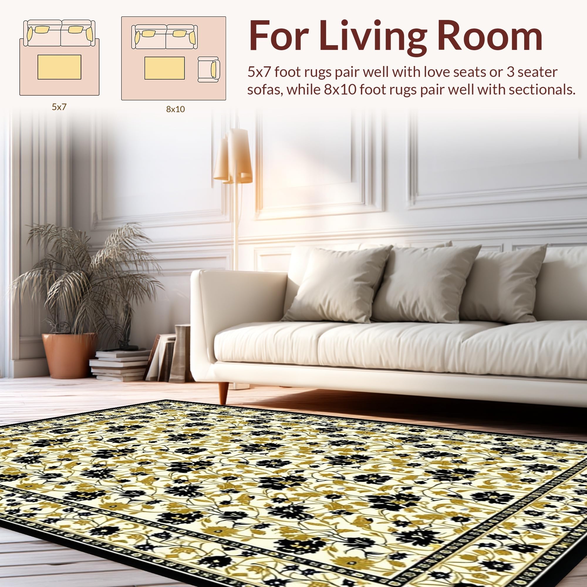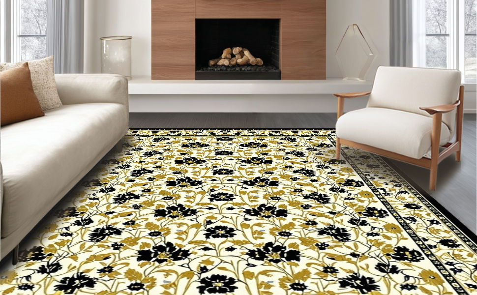 Ultra Soft Area Rug, Non Slip, Stain Resistant, Washable Area Rugs for Living Room, Bedroom, Stylish Black Floral Embellishment(Beige) Overview:
