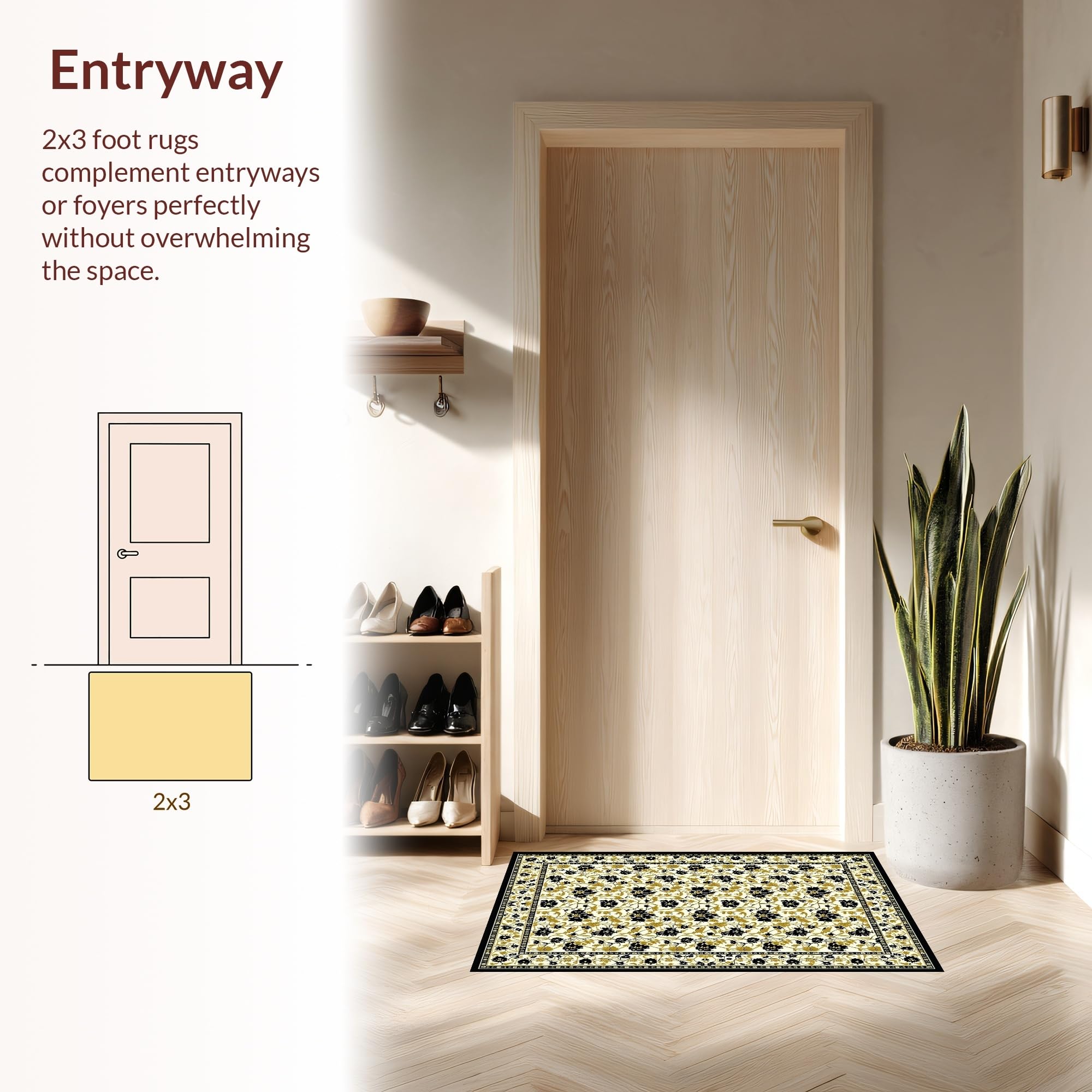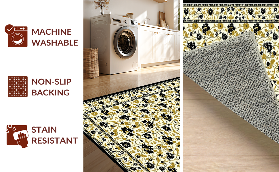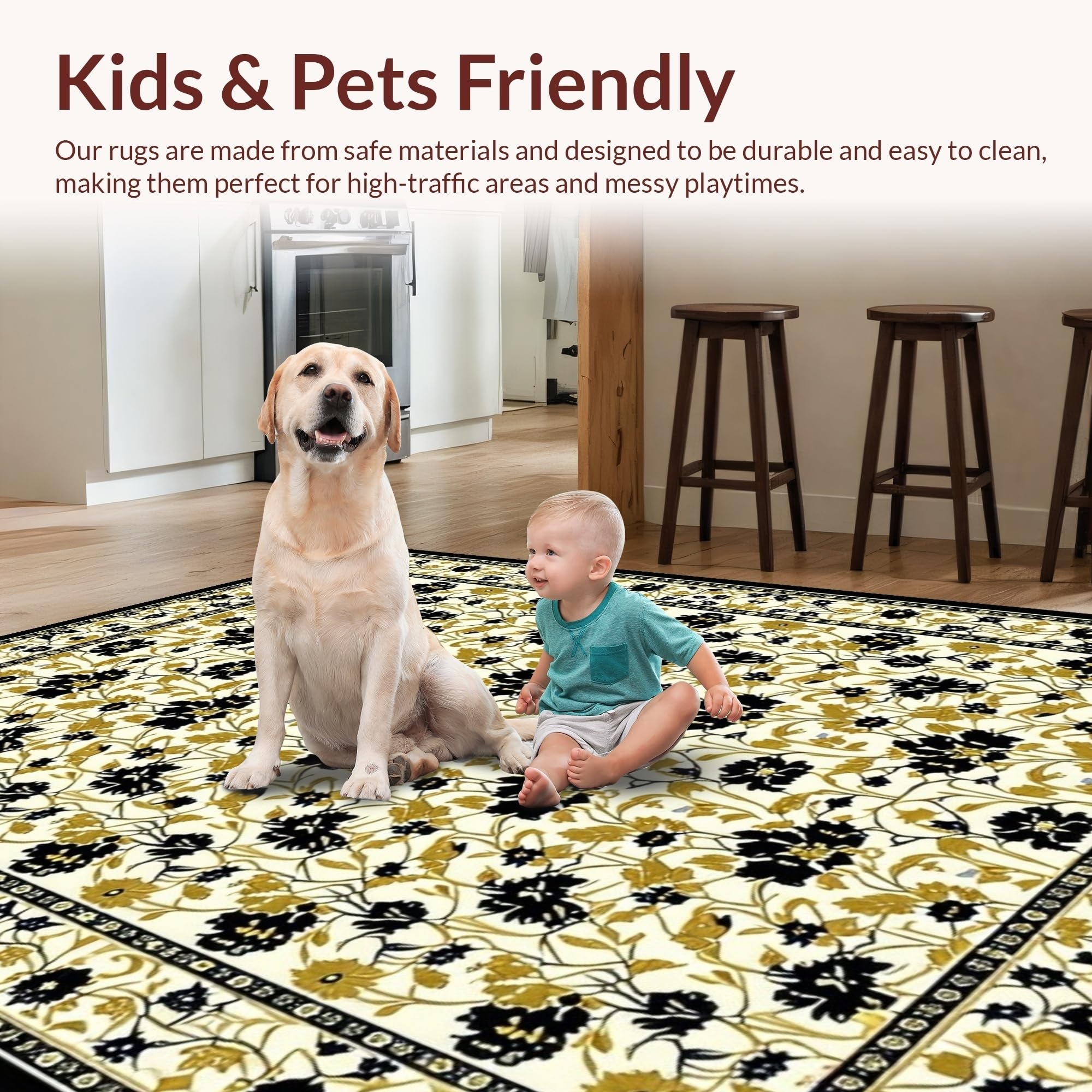 Ultra Soft Area Rug, Non Slip, Stain Resistant, Washable Area Rugs for Living Room, Bedroom, Stylish Black Floral Embellishment(Beige) Overview: