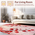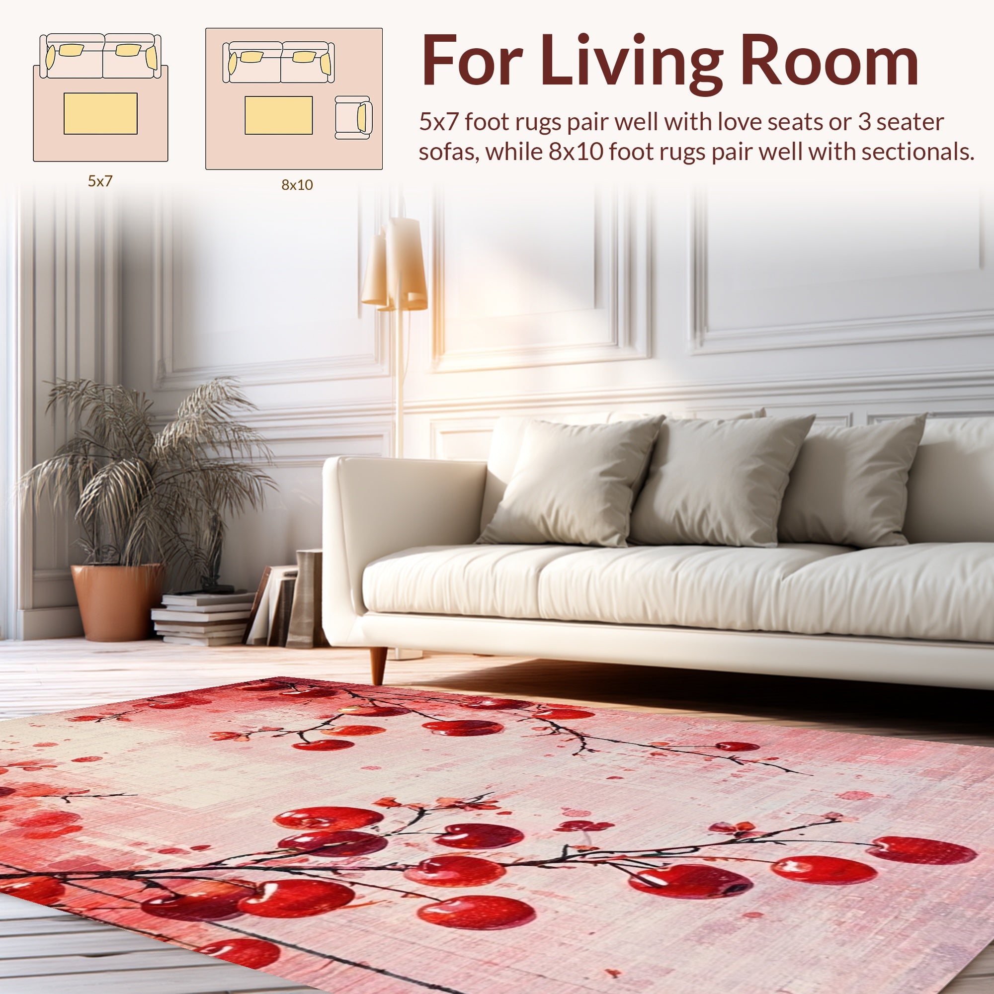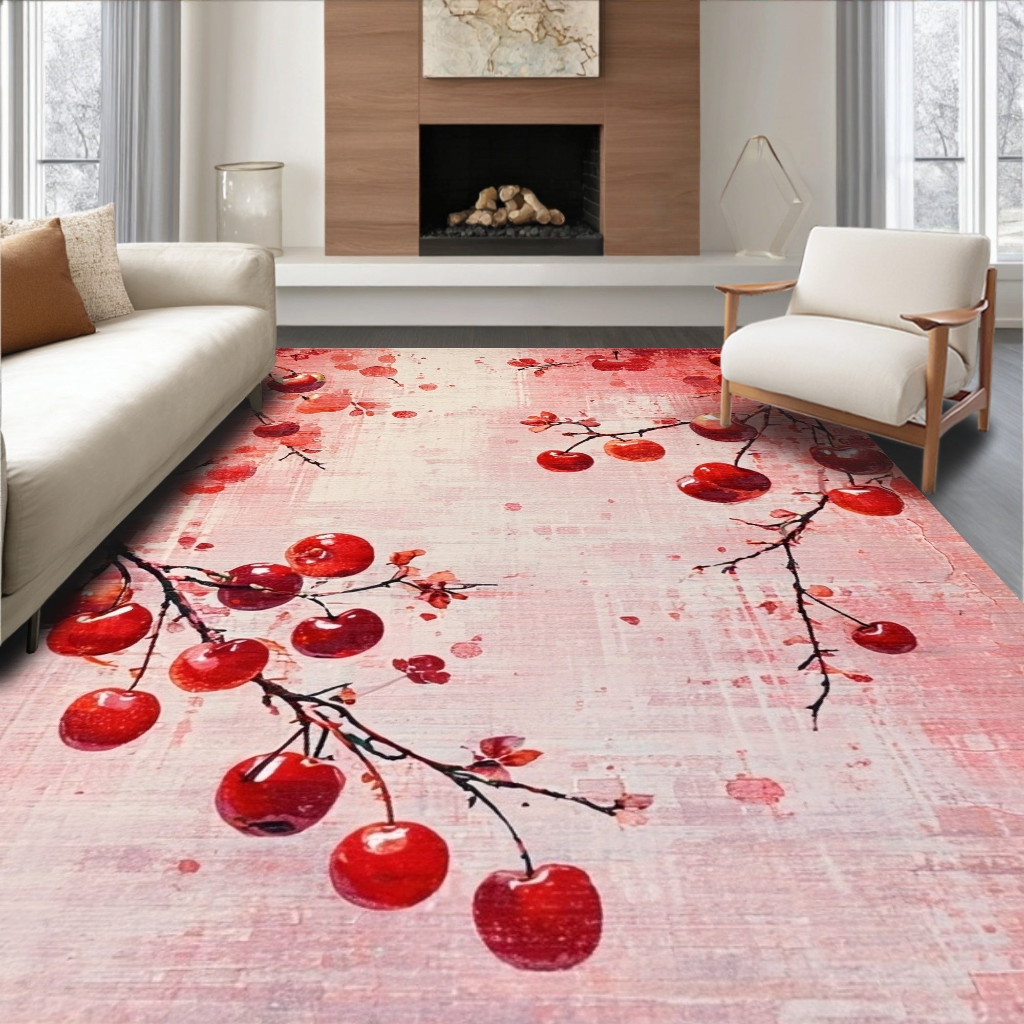 Ultra Soft Area Rug, Non Slip, Stain Resistant, Washable Area Rugs for Living Room, Bedroom, Sweet Cherry Bomb Bow Rug Featuring Juicy Fruit Details and Elegant Pink Ribbon(Red) Overview: