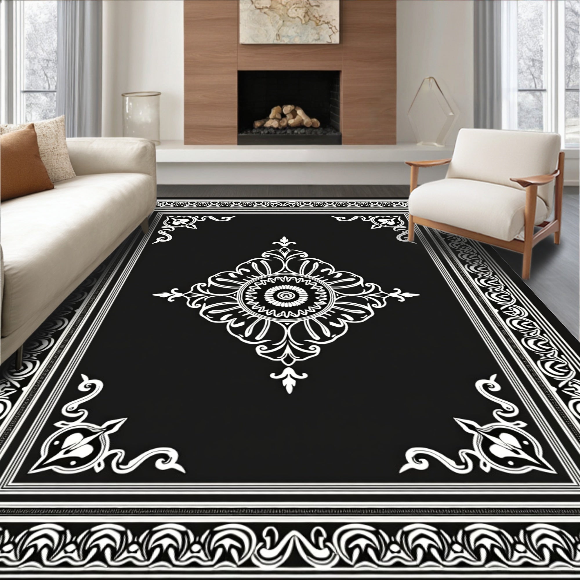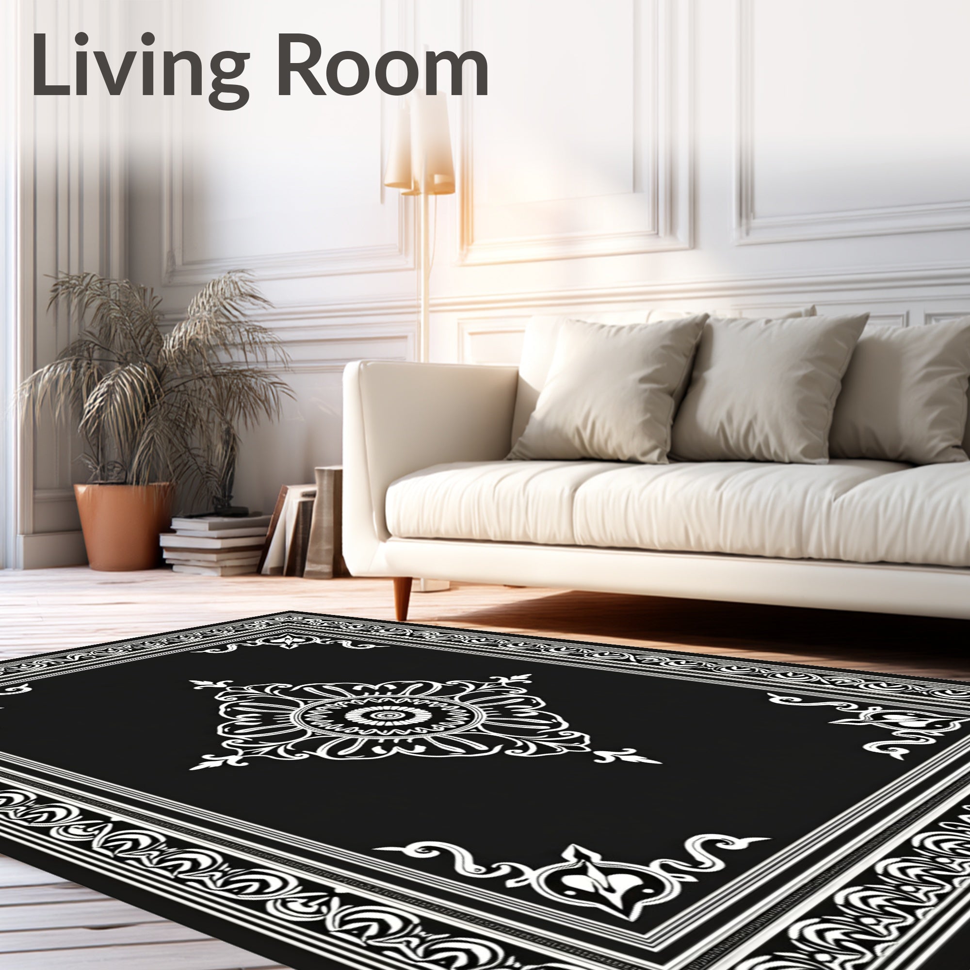 Ultra Soft Area Rug, Non Slip, Stain Resistant, Washable Area Rugs for Living Room, Bedroom, Traditional Damask Paisley with Ornamental Border Framework(Black) Overview: