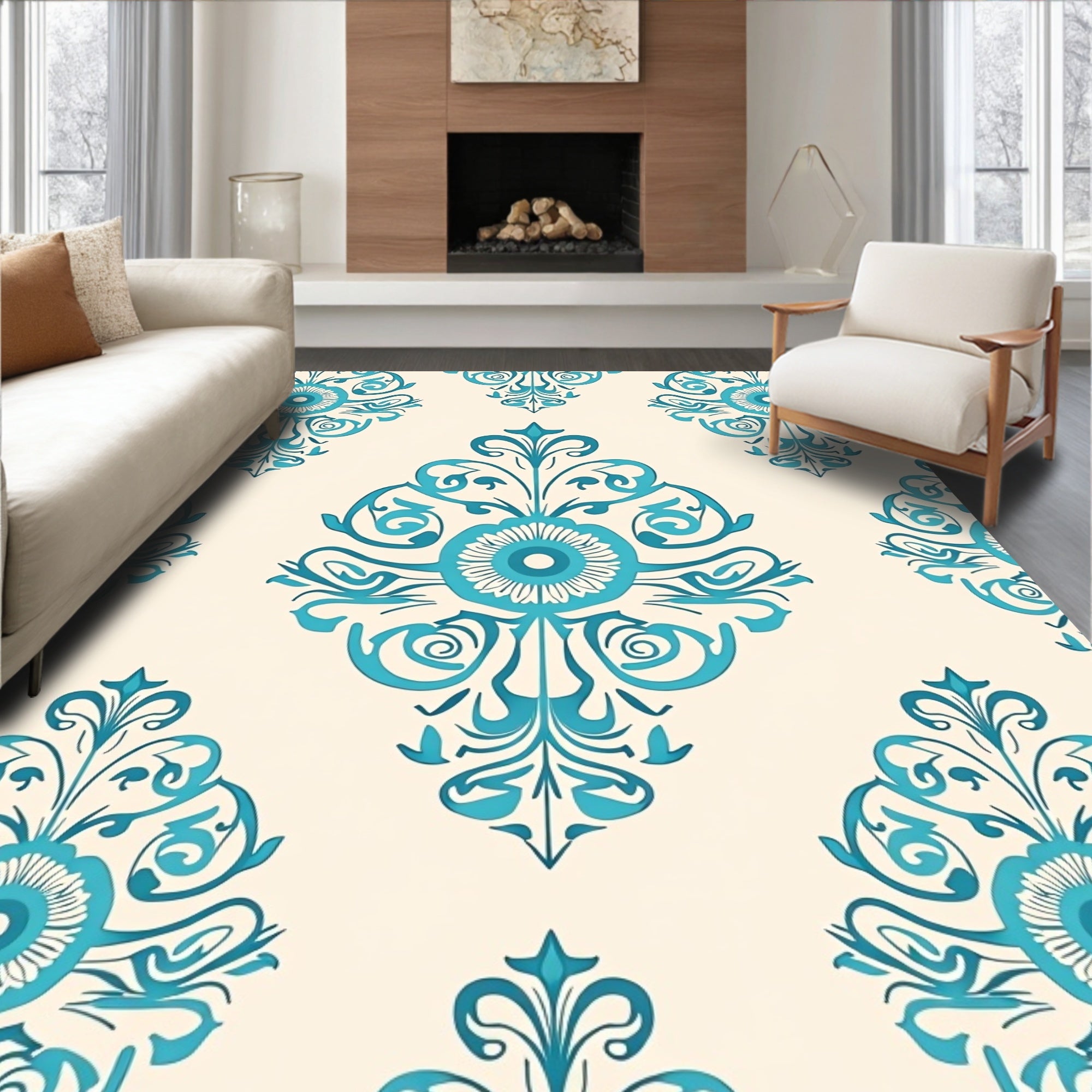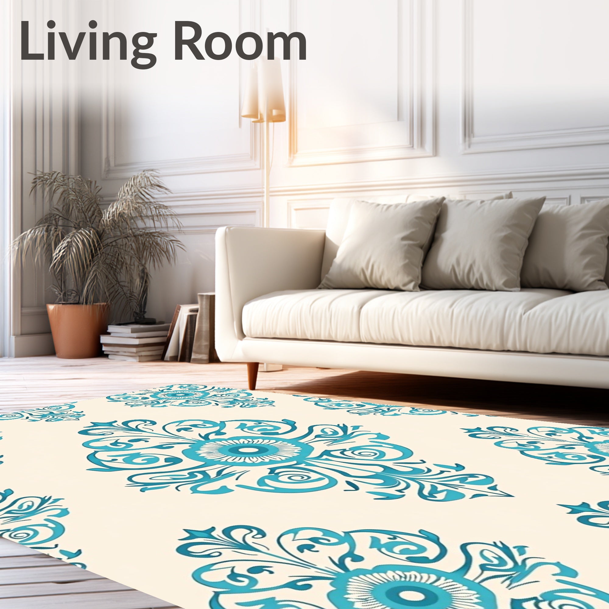 Ultra Soft Area Rug, Non Slip, Stain Resistant, Washable Area Rugs for Living Room, Bedroom, Traditional Damask Scrollwork with Central Rosette Flourish Motif(Turquoise) Overview: