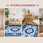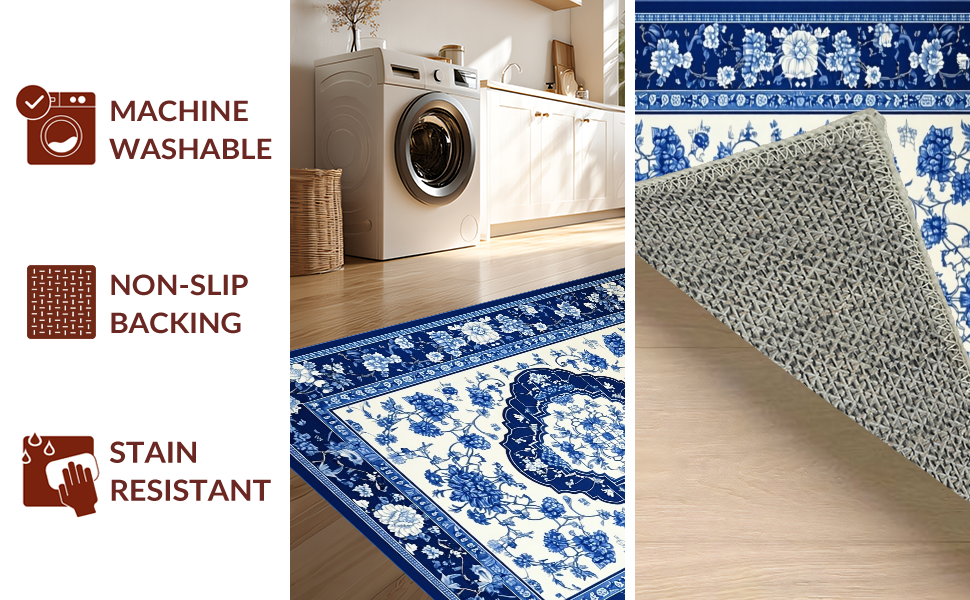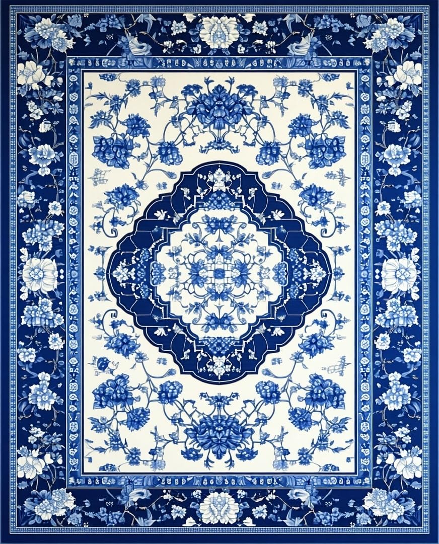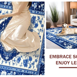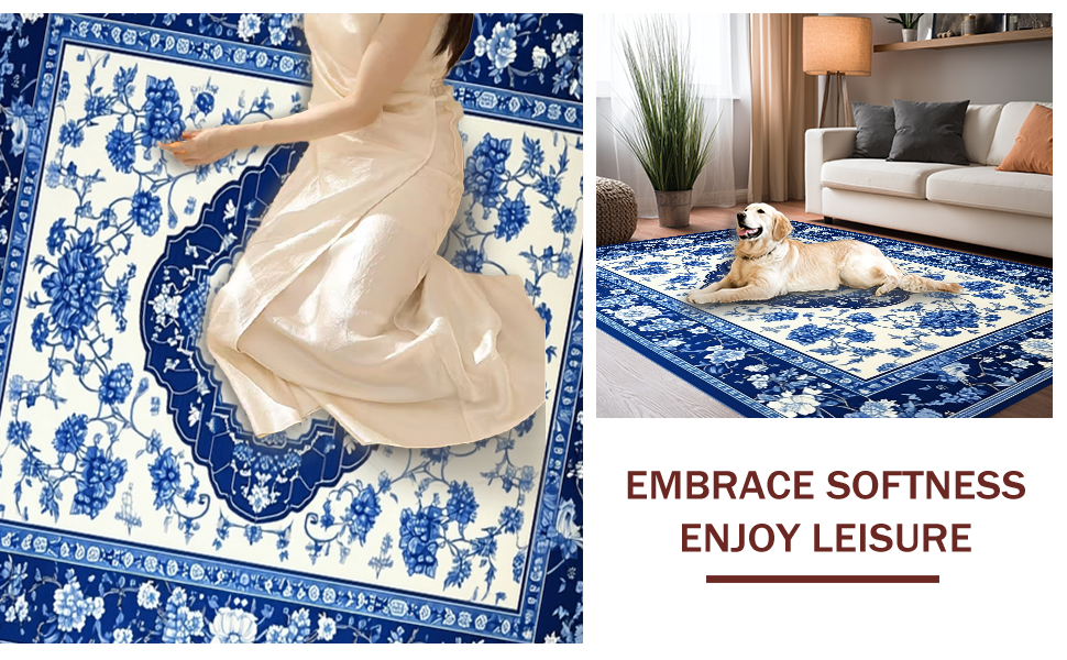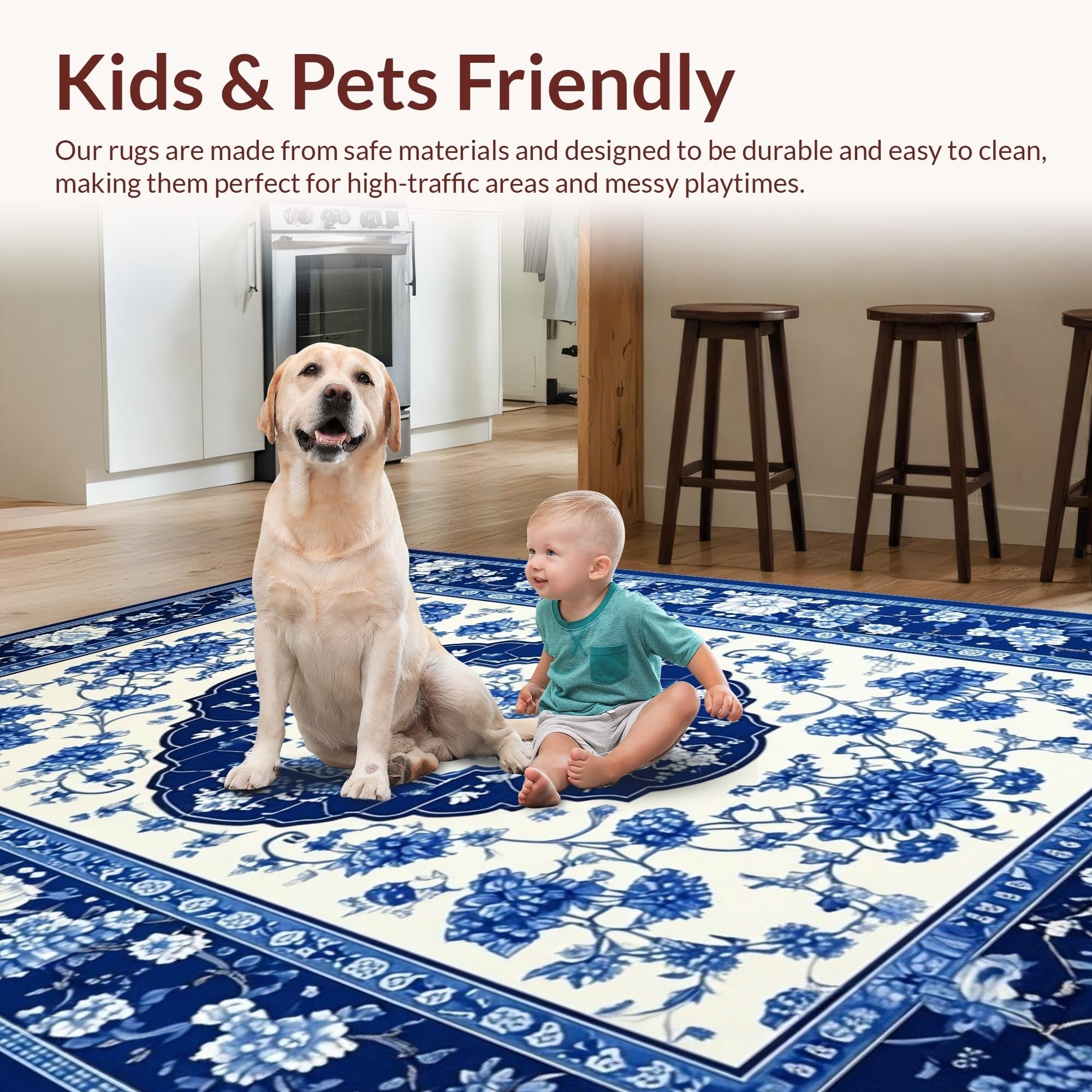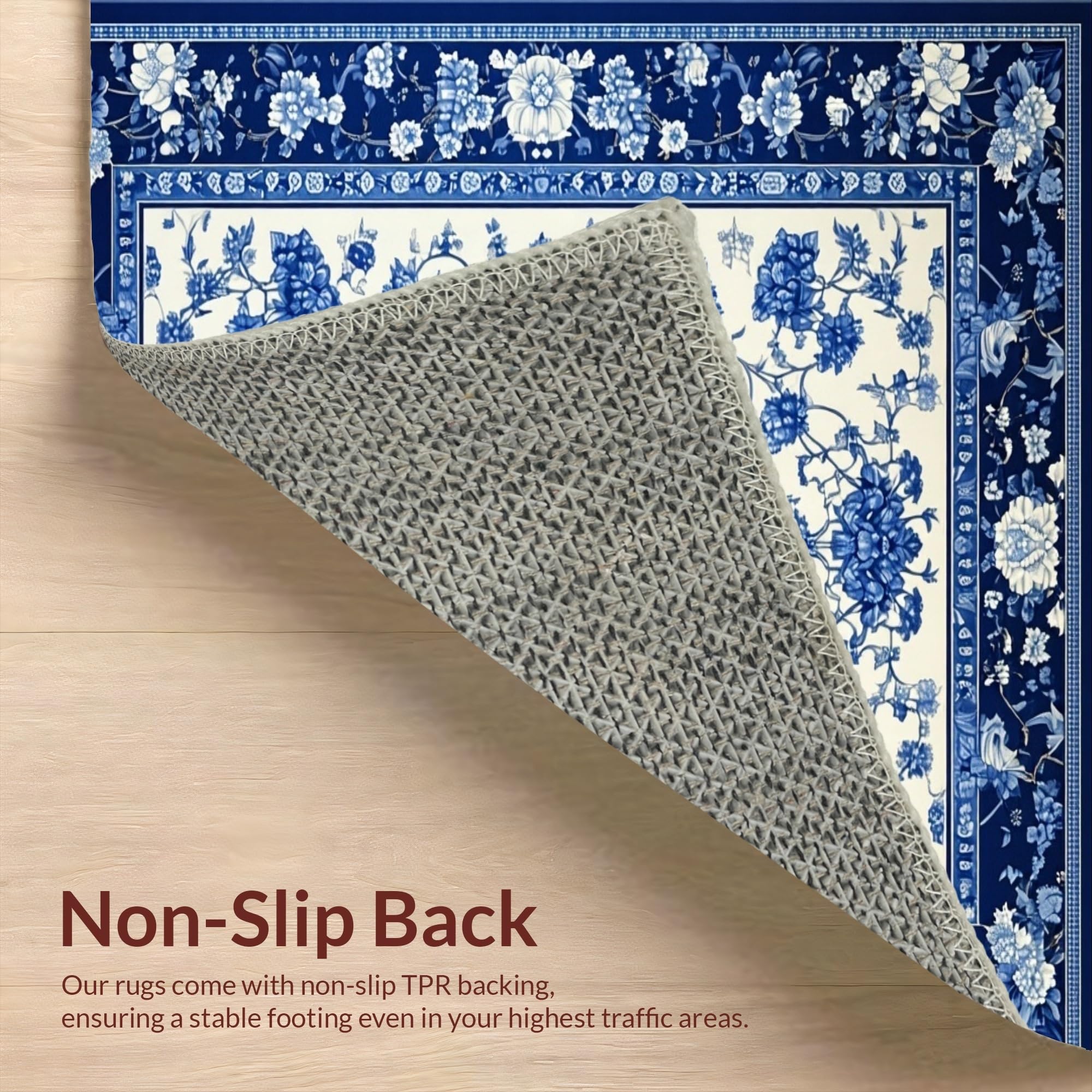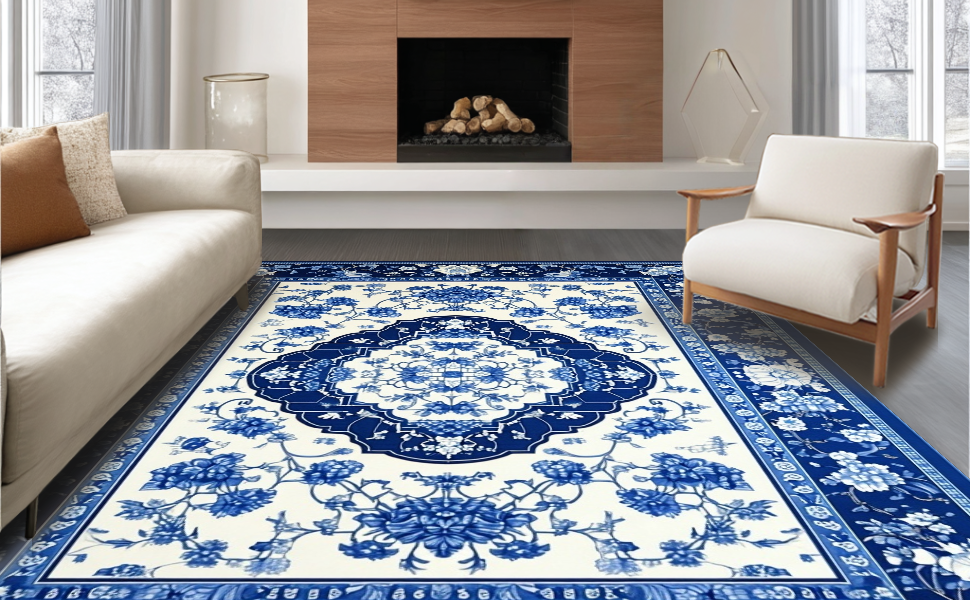 Ultra Soft Area Rug, Non Slip, Stain Resistant, Washable Area Rugs for Living Room, Bedroom, Traditional White Porcelain Floral Design(Blue) Overview: