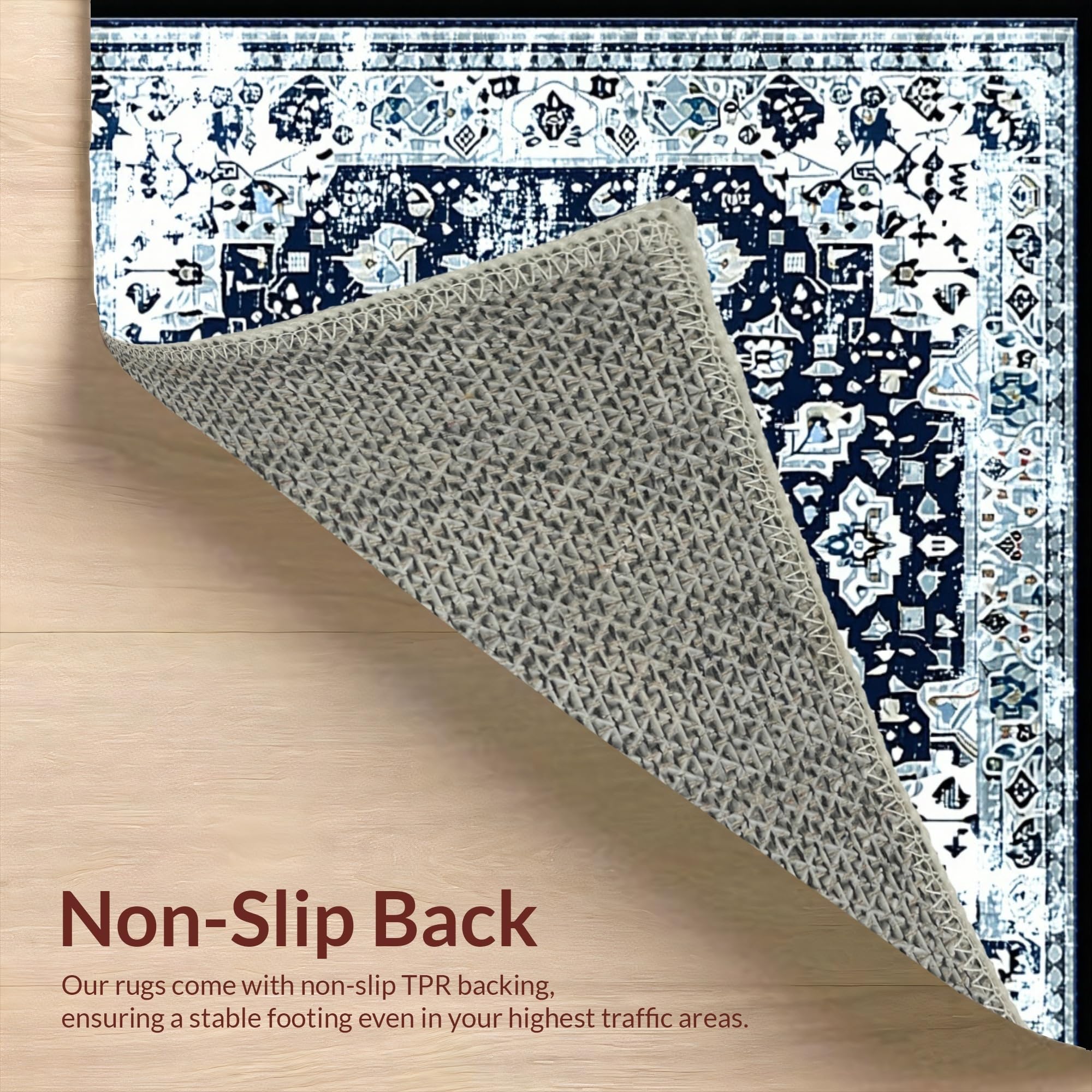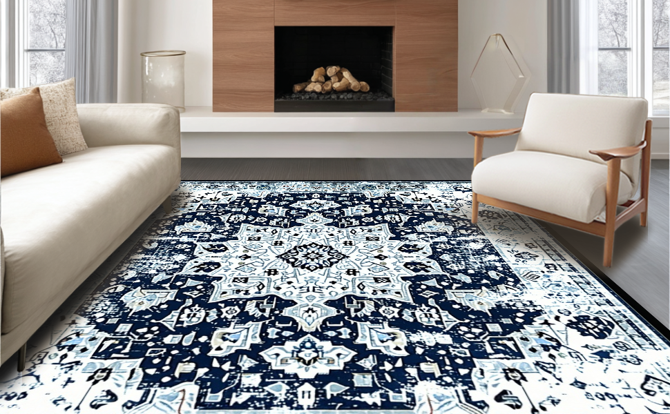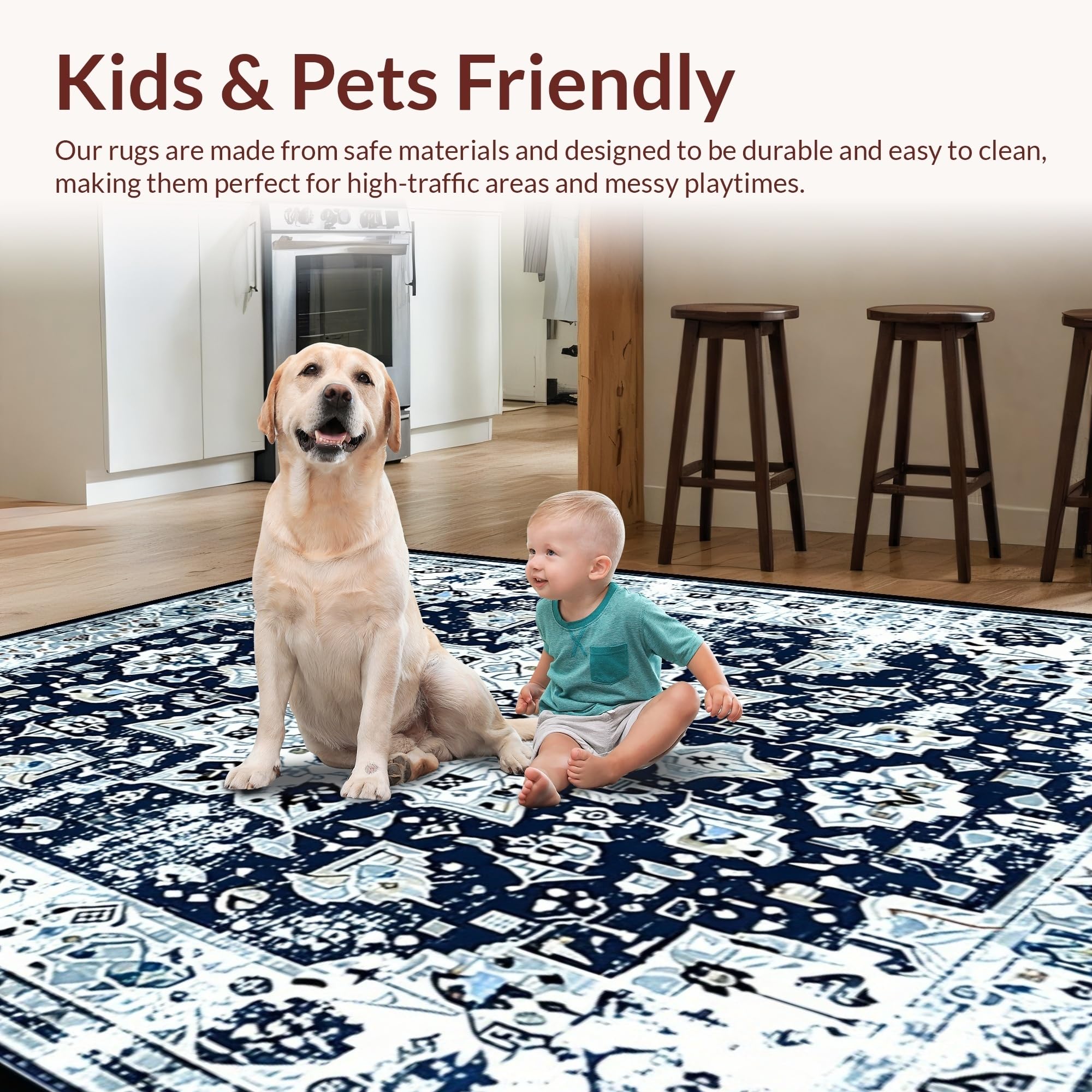 Ultra Soft Area Rug, Non Slip, Stain Resistant, Washable Area Rugs for Living Room, Bedroom, Transitional Tiled Design with Character(Blue) Overview: