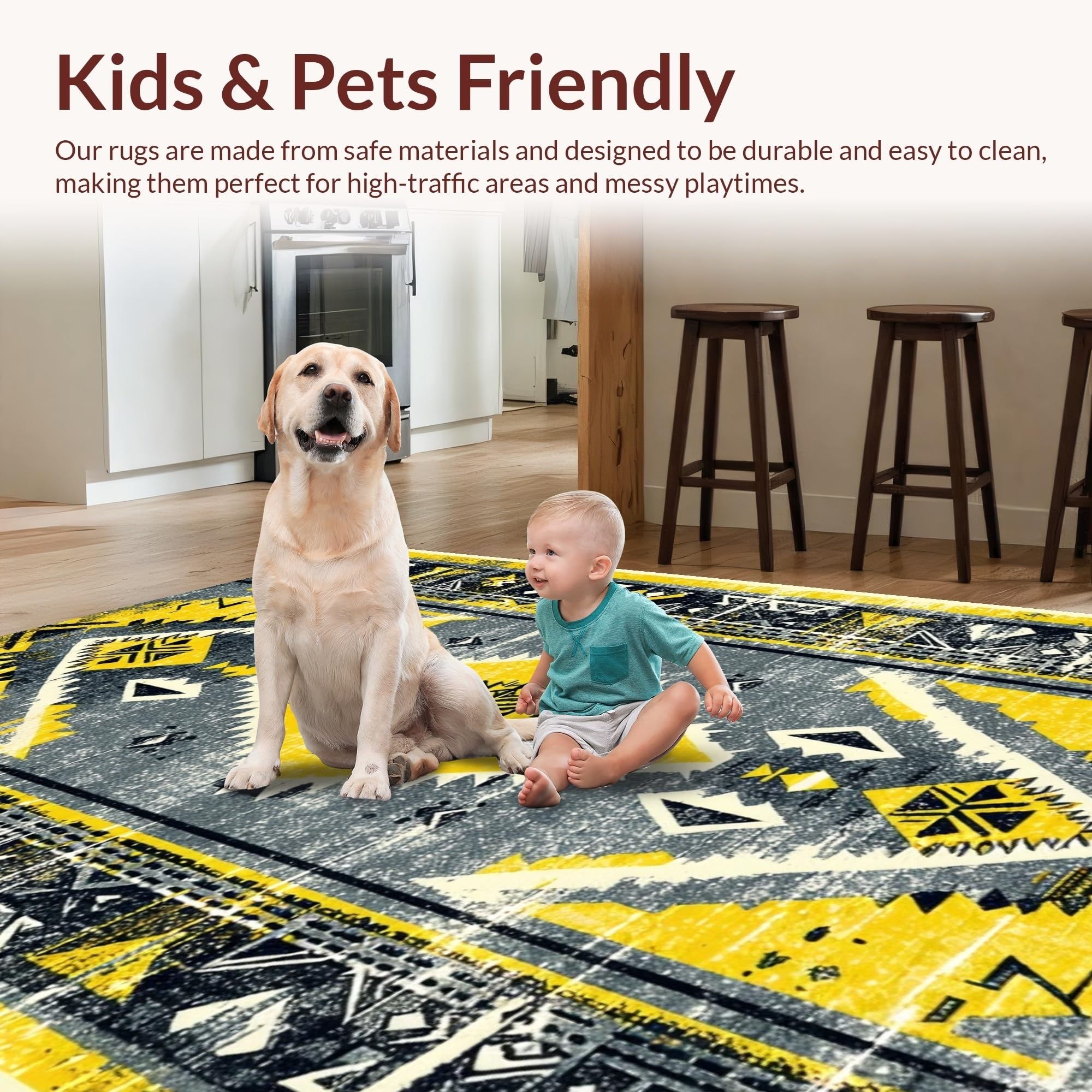 Ultra Soft Area Rug, Non Slip, Stain Resistant, Washable Area Rugs for Living Room, Bedroom, Tribal Distressed Grey Yellow Living Room Rug(Yellow) Overview: