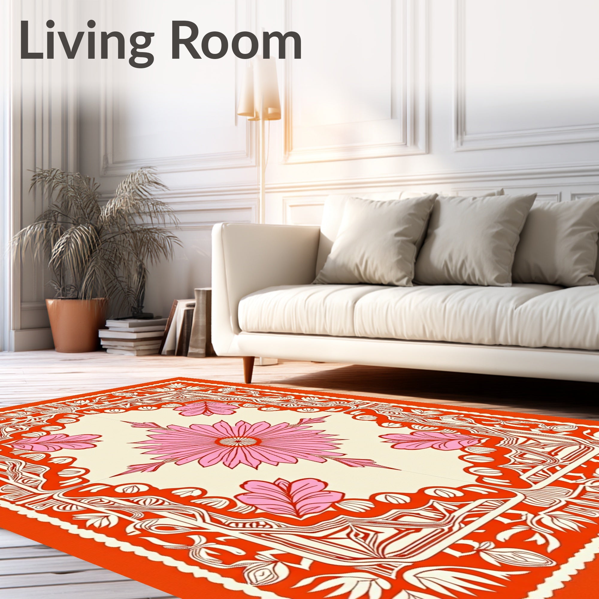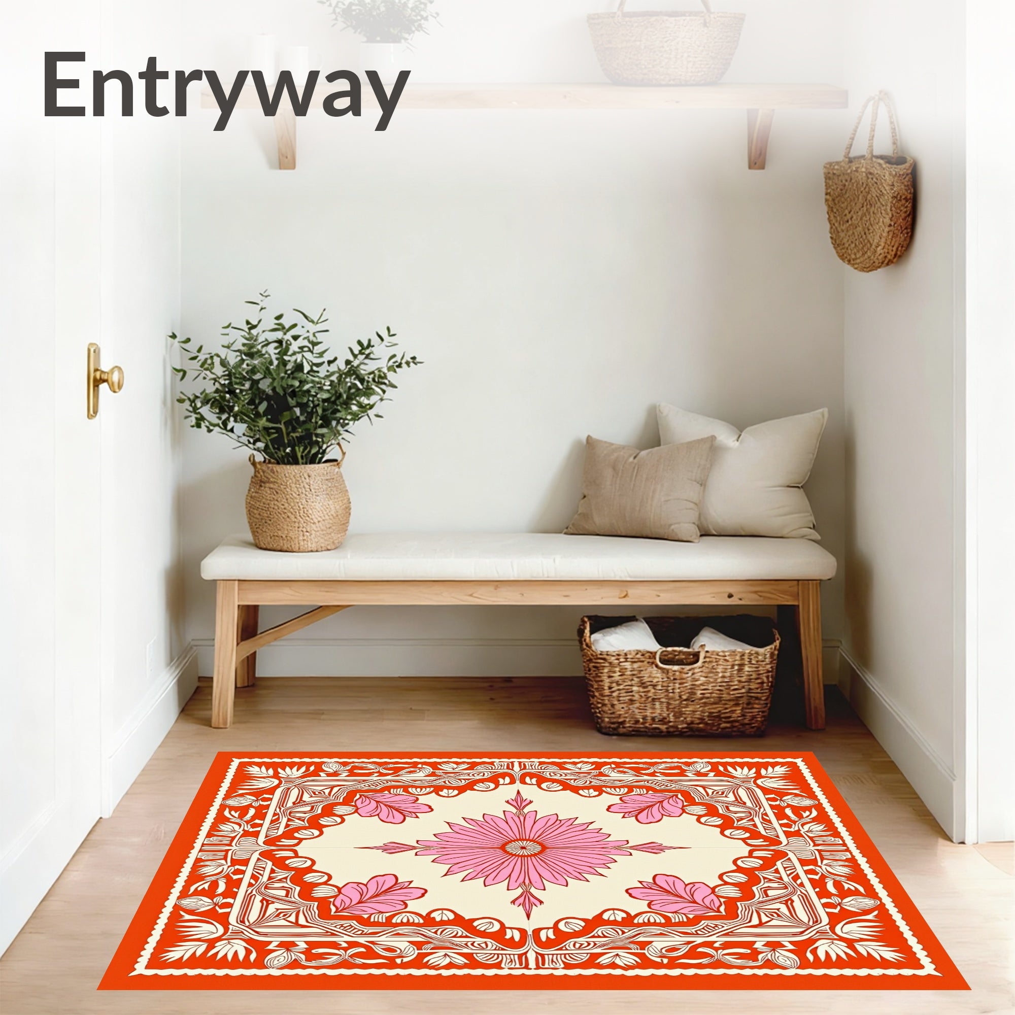 Flatwoven High Traffic Area Rug, Tropical Bloom Medallion with Interlocking Petal Motifs, Non Slip, Stain Resistant, Washable Area Rugs for Living Room, Bedroom (Orange) Overview: