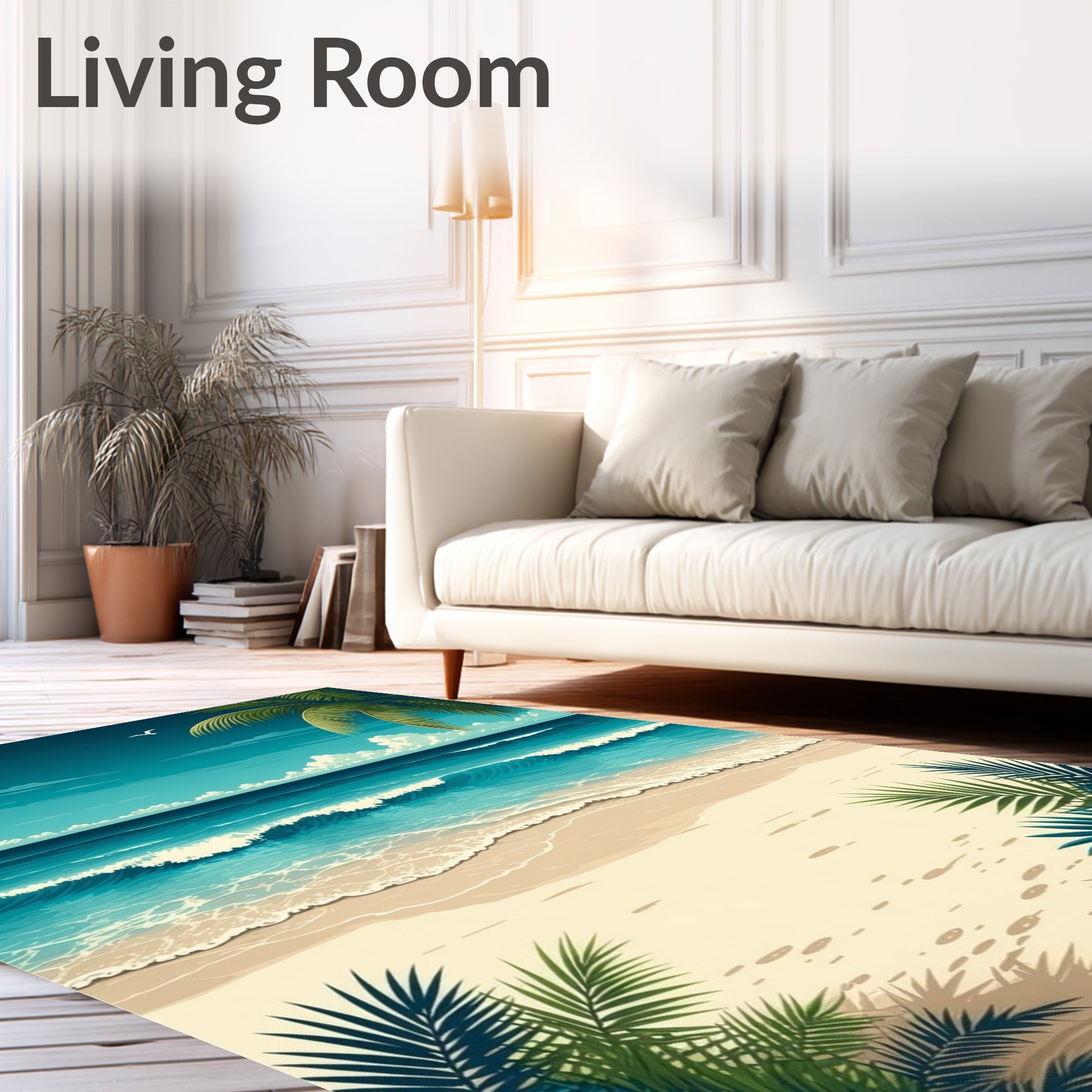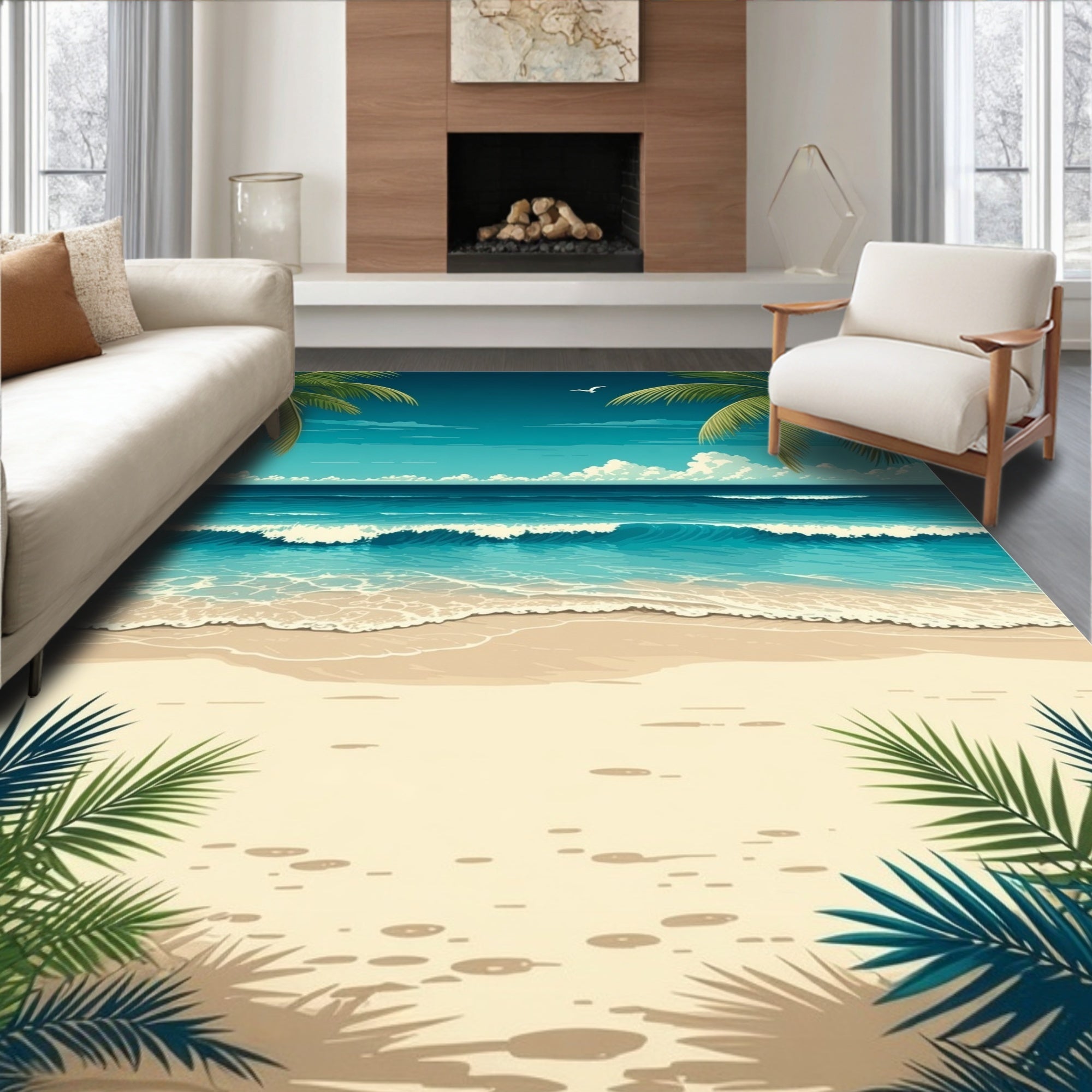 Flatwoven High Traffic Area Rug, Tropical Coconut Palm Beach Sea Water Natural Scenery Floor, Non Slip, Stain Resistant, Washable Area Rugs for Living Room, Bedroom (Blue) Overview:
