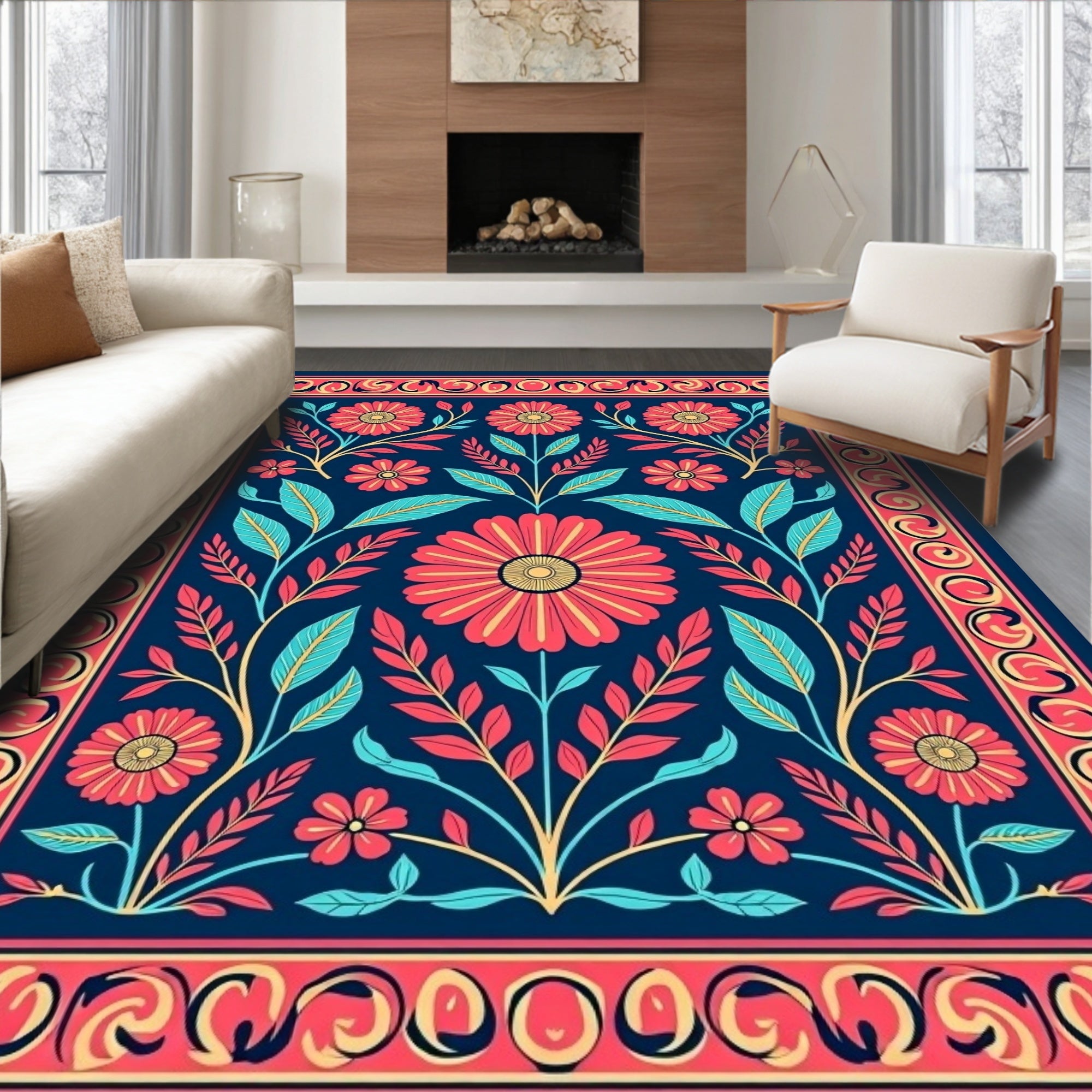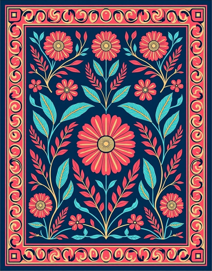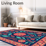 Flatwoven High Traffic Area Rug, Tropical Folklore Botanical Fantasy with Stylized Ferns and Blossoms, Non Slip, Stain Resistant, Washable Area Rugs for Living Room, Bedroom (Blue) Overview: