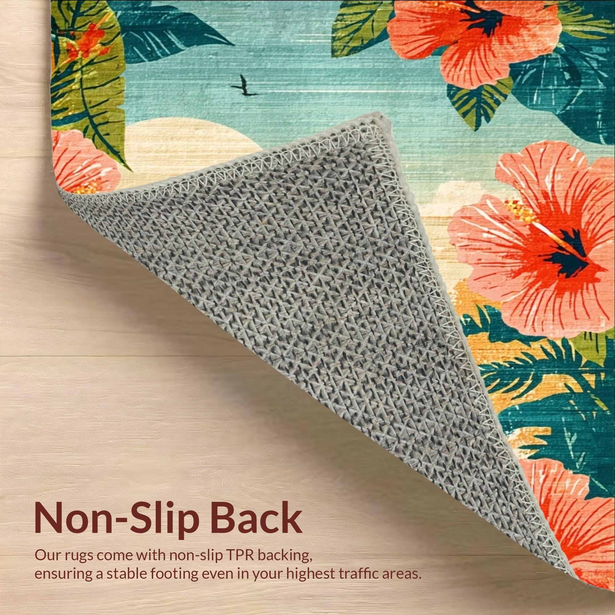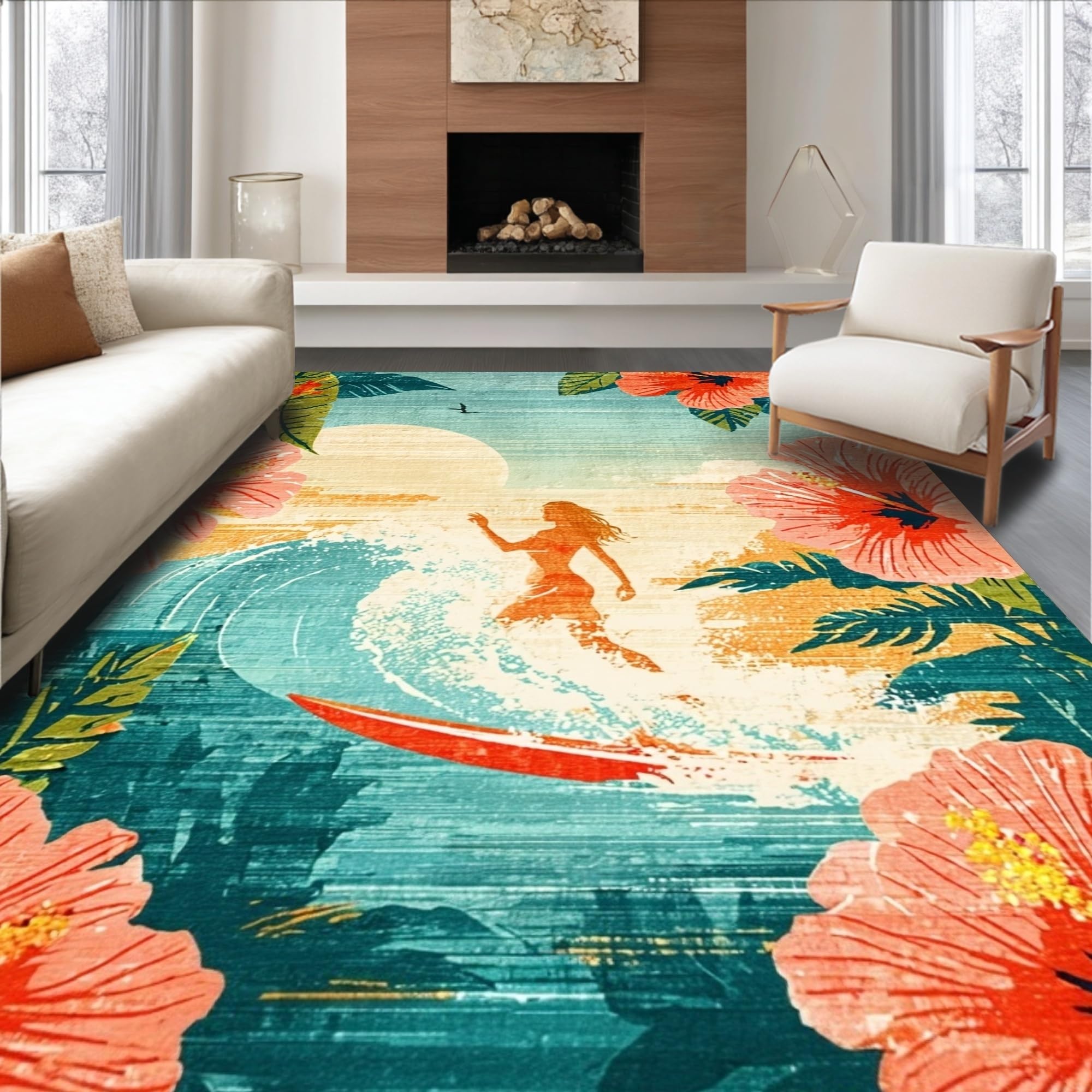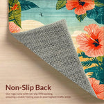 Ultra Soft Area Rug, Non Slip, Stain Resistant, Washable Area Rugs for Living Room, Bedroom, Tropical Hibiscus Surfboard Artwork Area Rug with Retro Silhouette Design(Red) Overview: