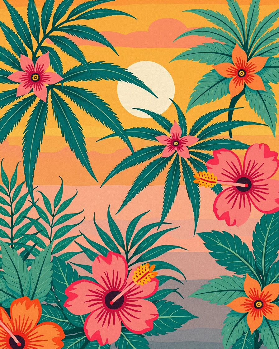 Tropical Sunset Palm Fronds with Hibiscus Blooms(Orange)