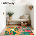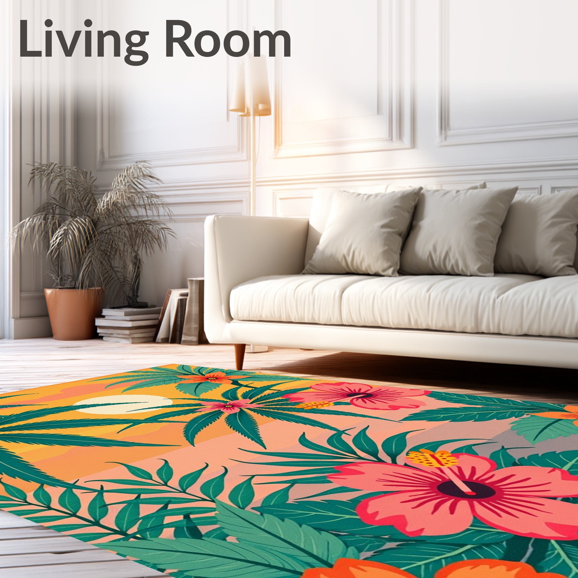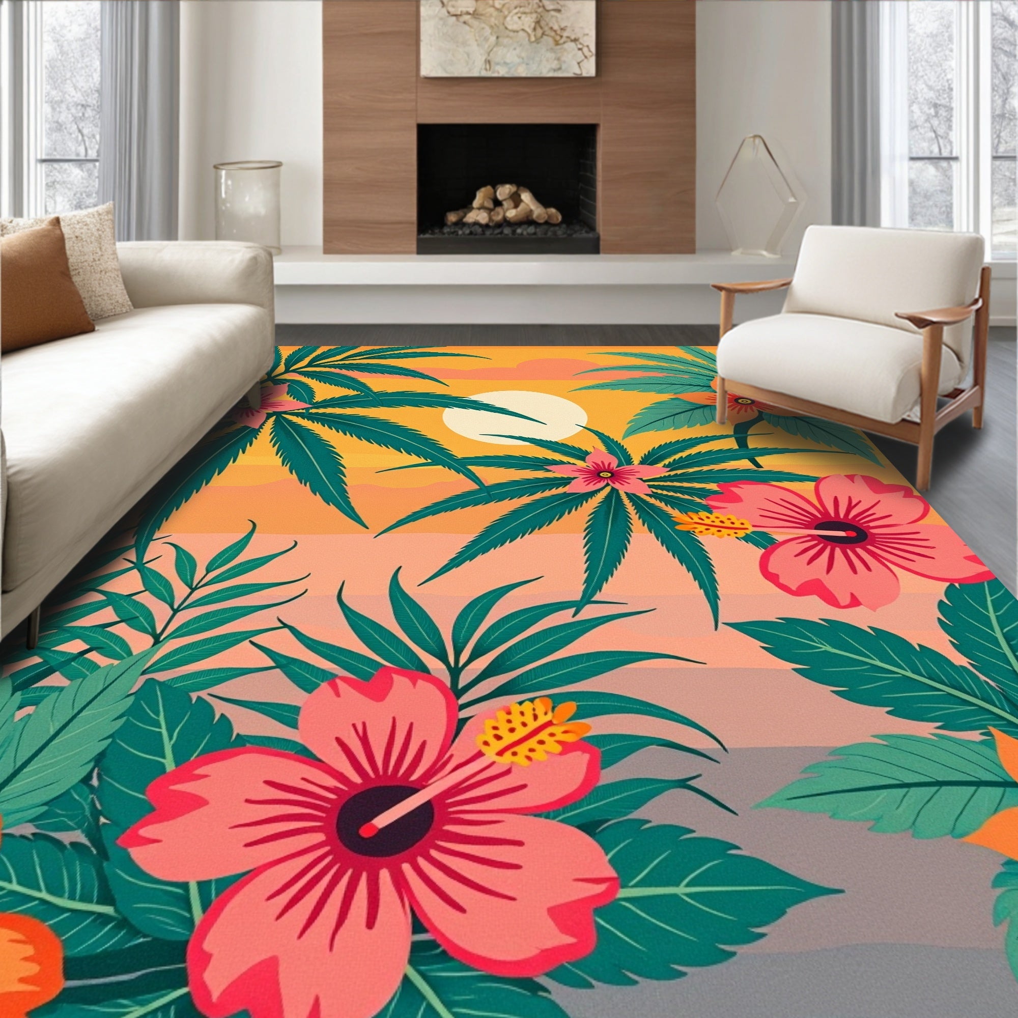 Ultra Soft Area Rug, Non Slip, Stain Resistant, Washable Area Rugs for Living Room, Bedroom, Tropical Sunset Palm Fronds with Hibiscus Blooms(Orange) Overview: