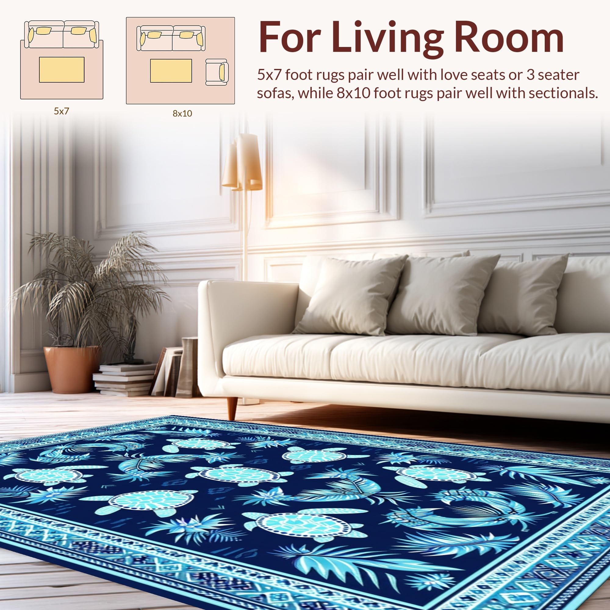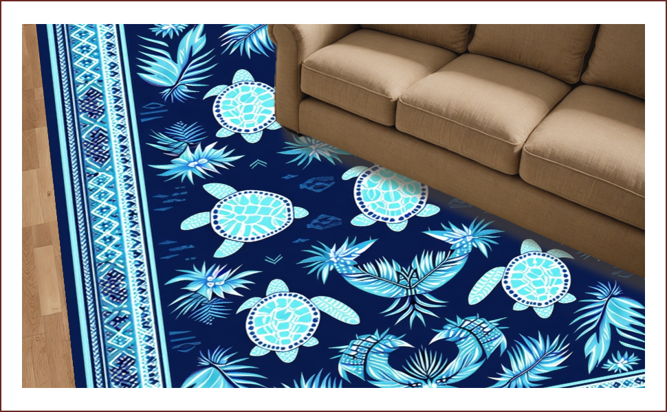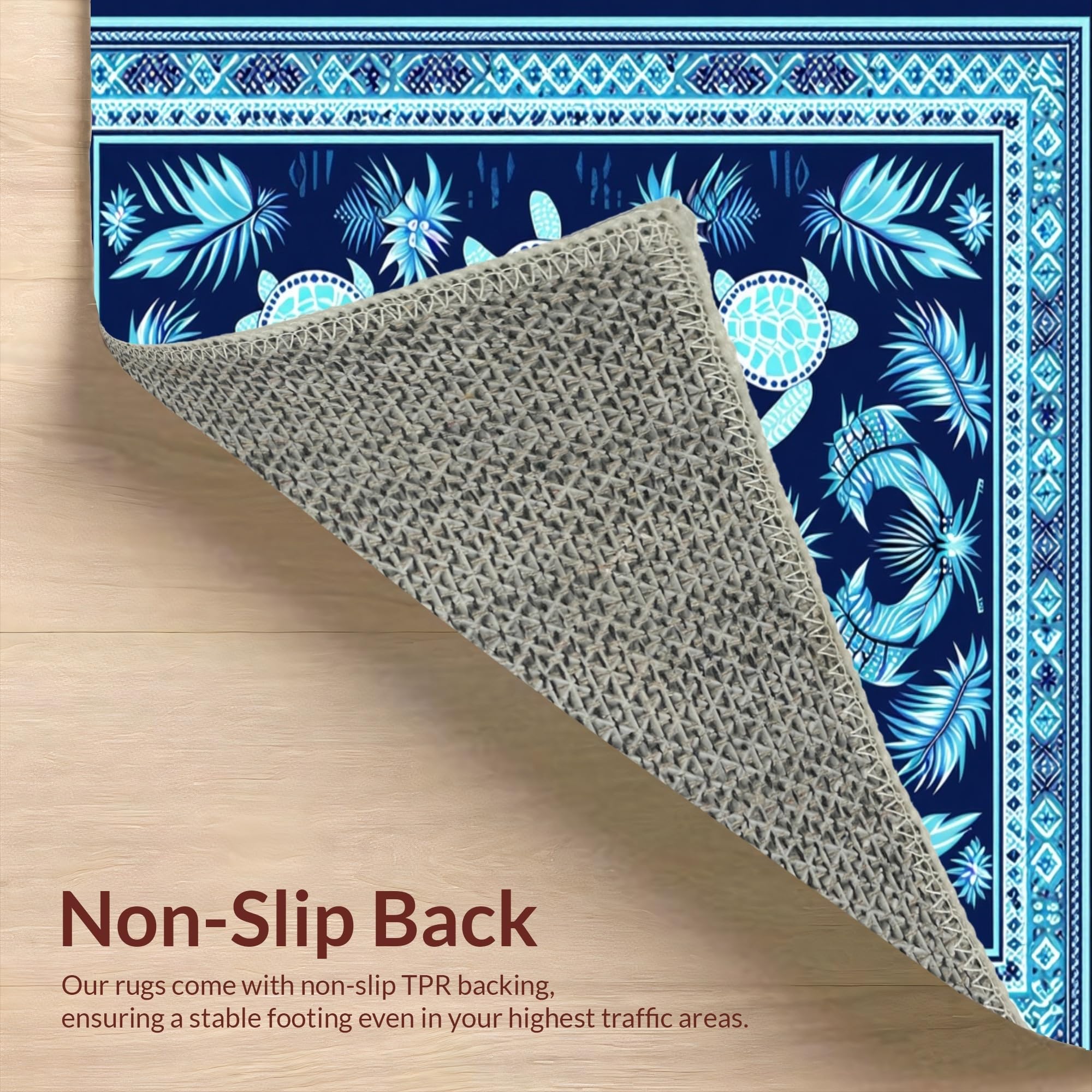 Ultra Soft Area Rug, Non Slip, Stain Resistant, Washable Area Rugs for Living Room, Bedroom, Tropical Turtle Geometric Delight(Blue) Overview: