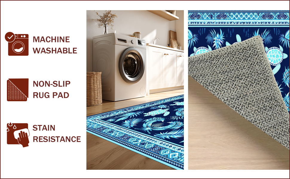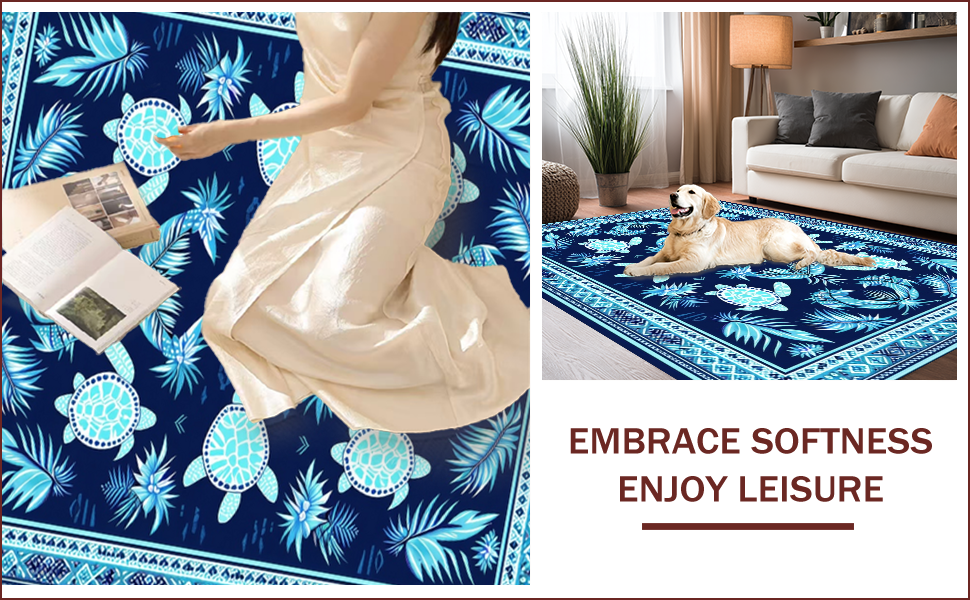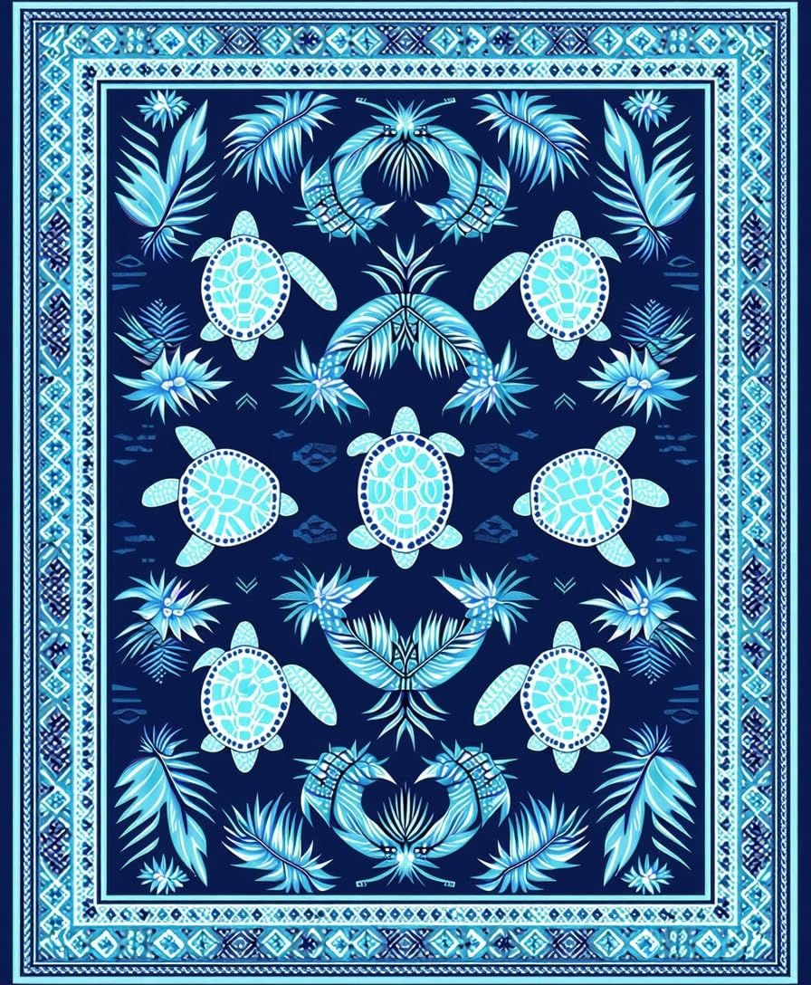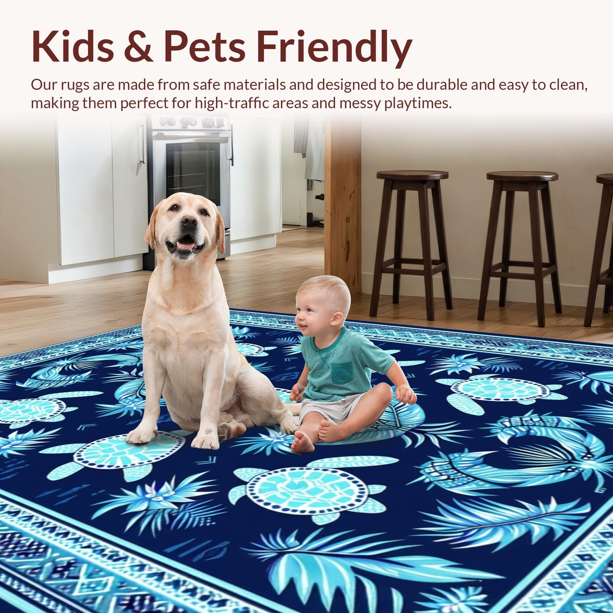 Ultra Soft Area Rug, Non Slip, Stain Resistant, Washable Area Rugs for Living Room, Bedroom, Tropical Turtle Geometric Delight(Blue) Overview: