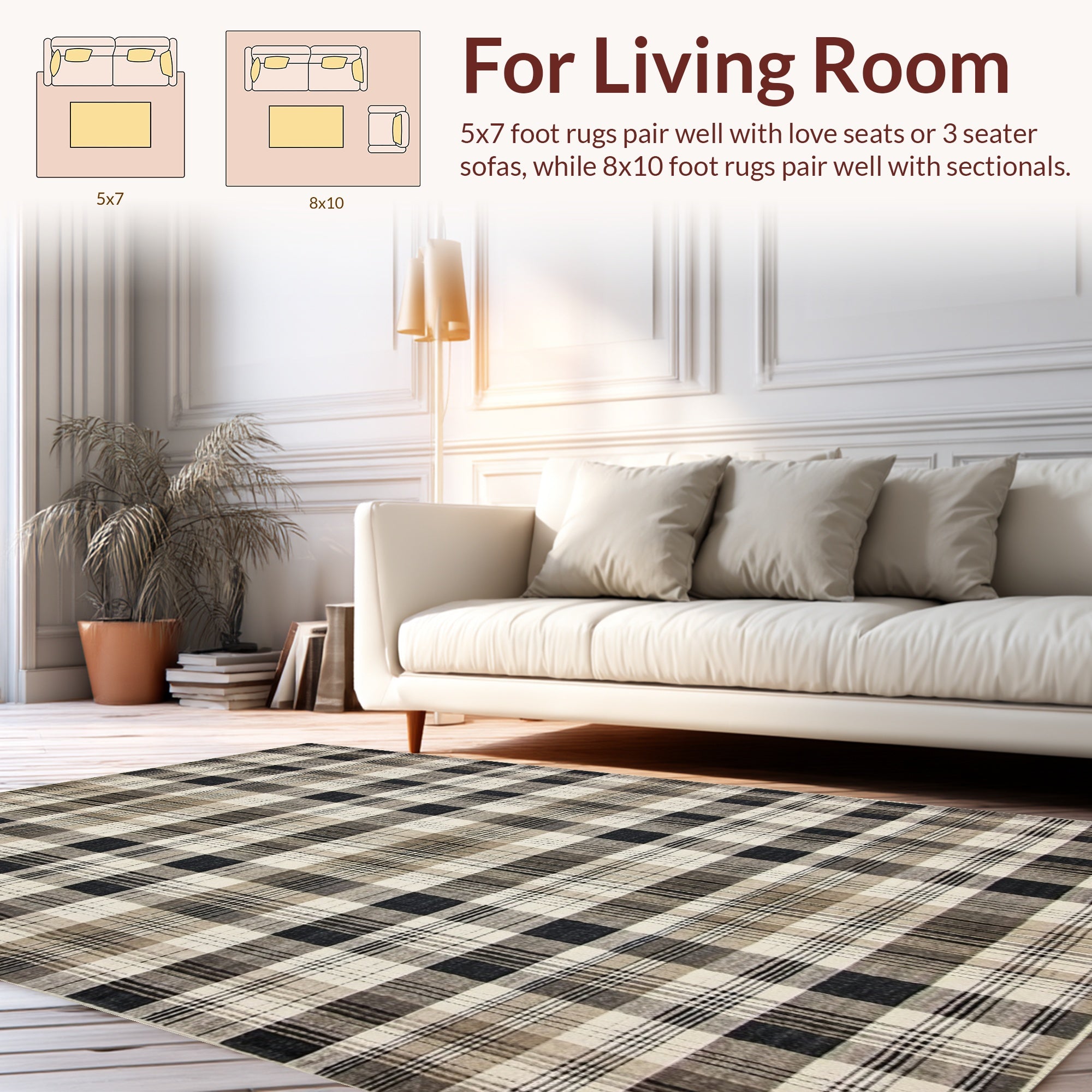 Ultra Soft Area Rug, Non Slip, Stain Resistant, Washable Area Rugs for Living Room, Bedroom, Twilight Plaid Carpet Tan & Charcoal Front Door(Beige) Overview:
