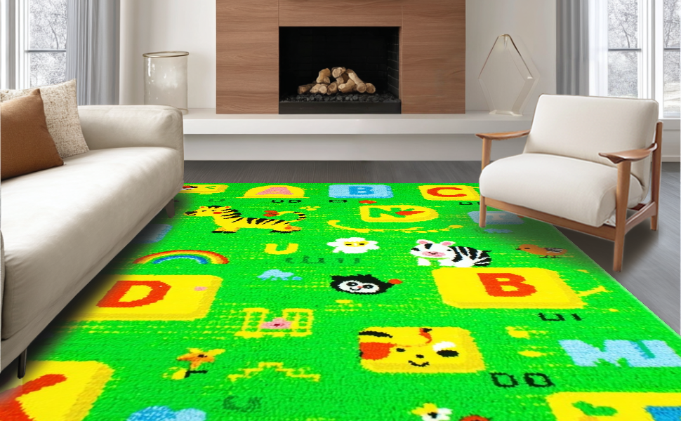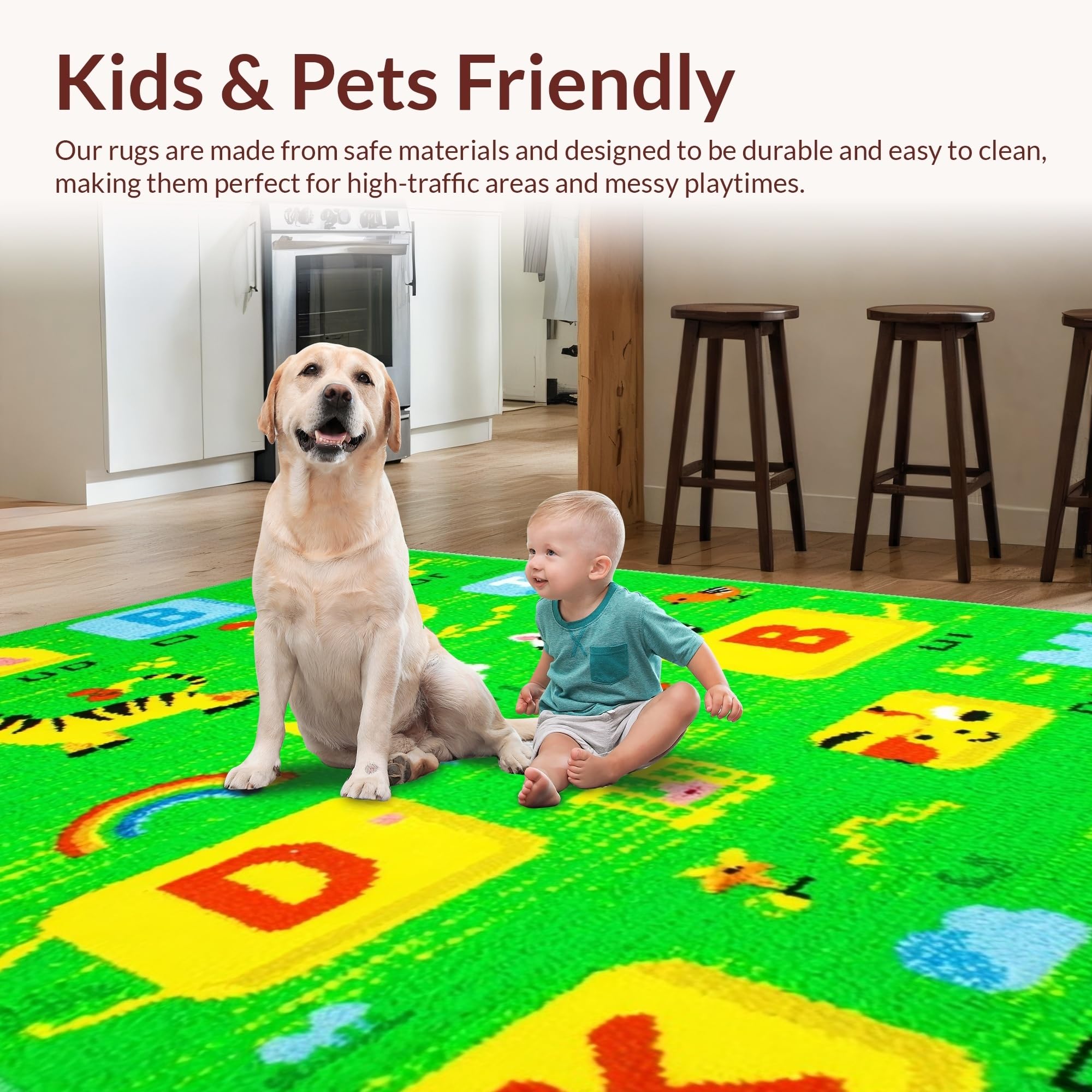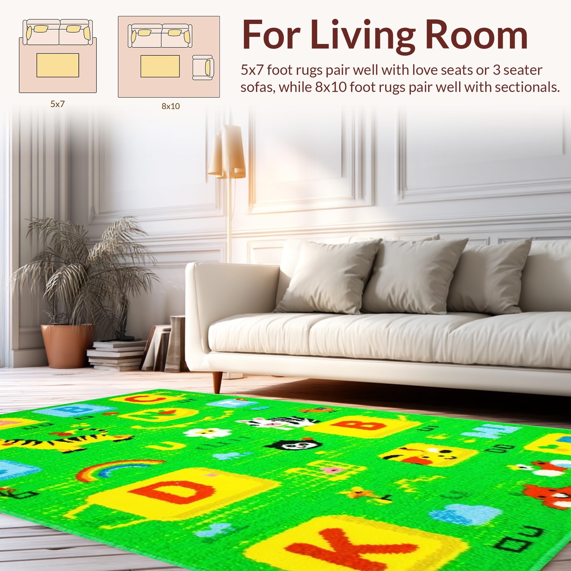 Ultra Soft Area Rug, Non Slip, Stain Resistant, Washable Area Rugs for Living Room, Bedroom, Vibrant Alphabet Animal Theme(Green) Overview: