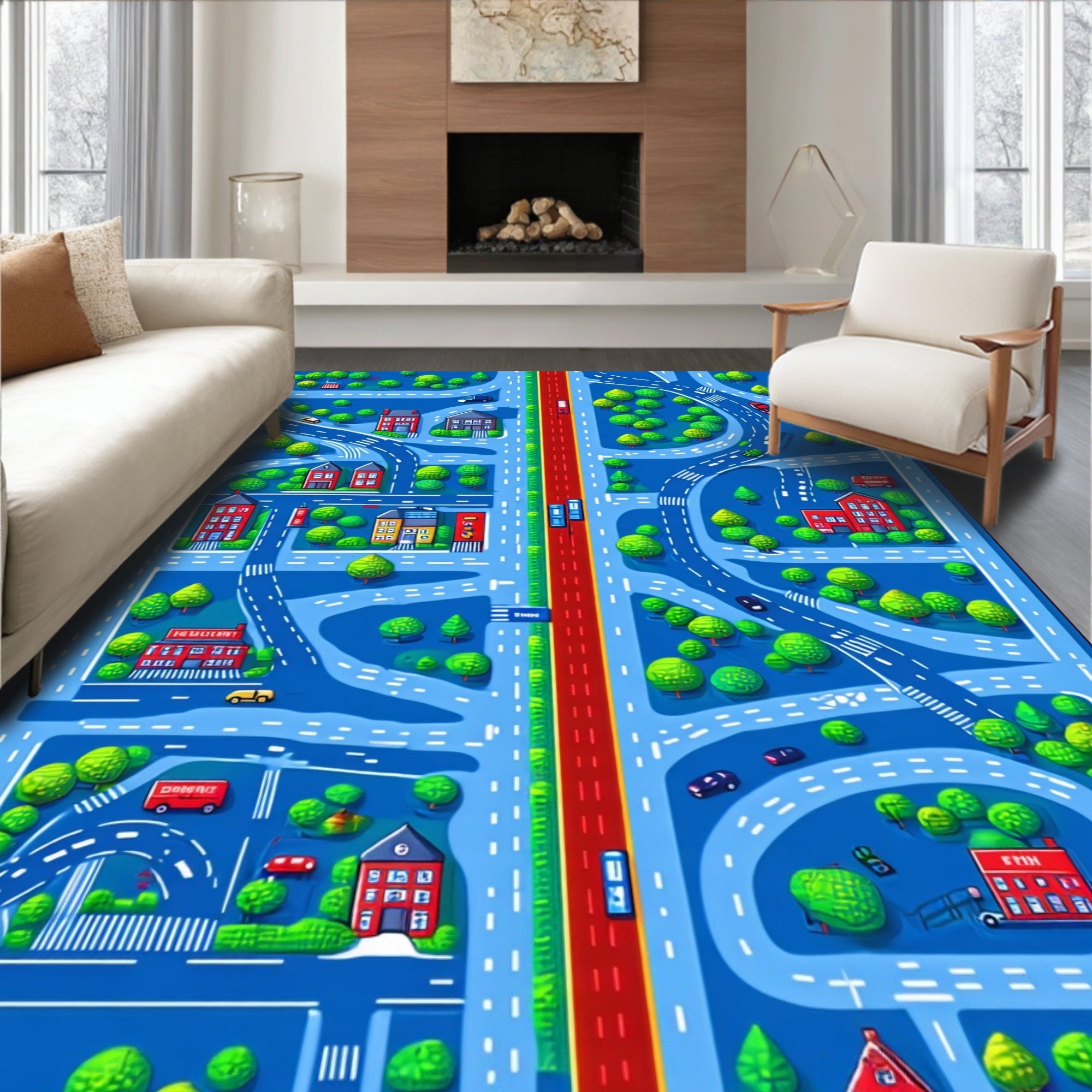 Flatwoven High Traffic Area Rug, Vibrant Cityscape Road Map, Non Slip, Stain Resistant, Washable Area Rugs for Living Room, Bedroom (Blue) Overview: