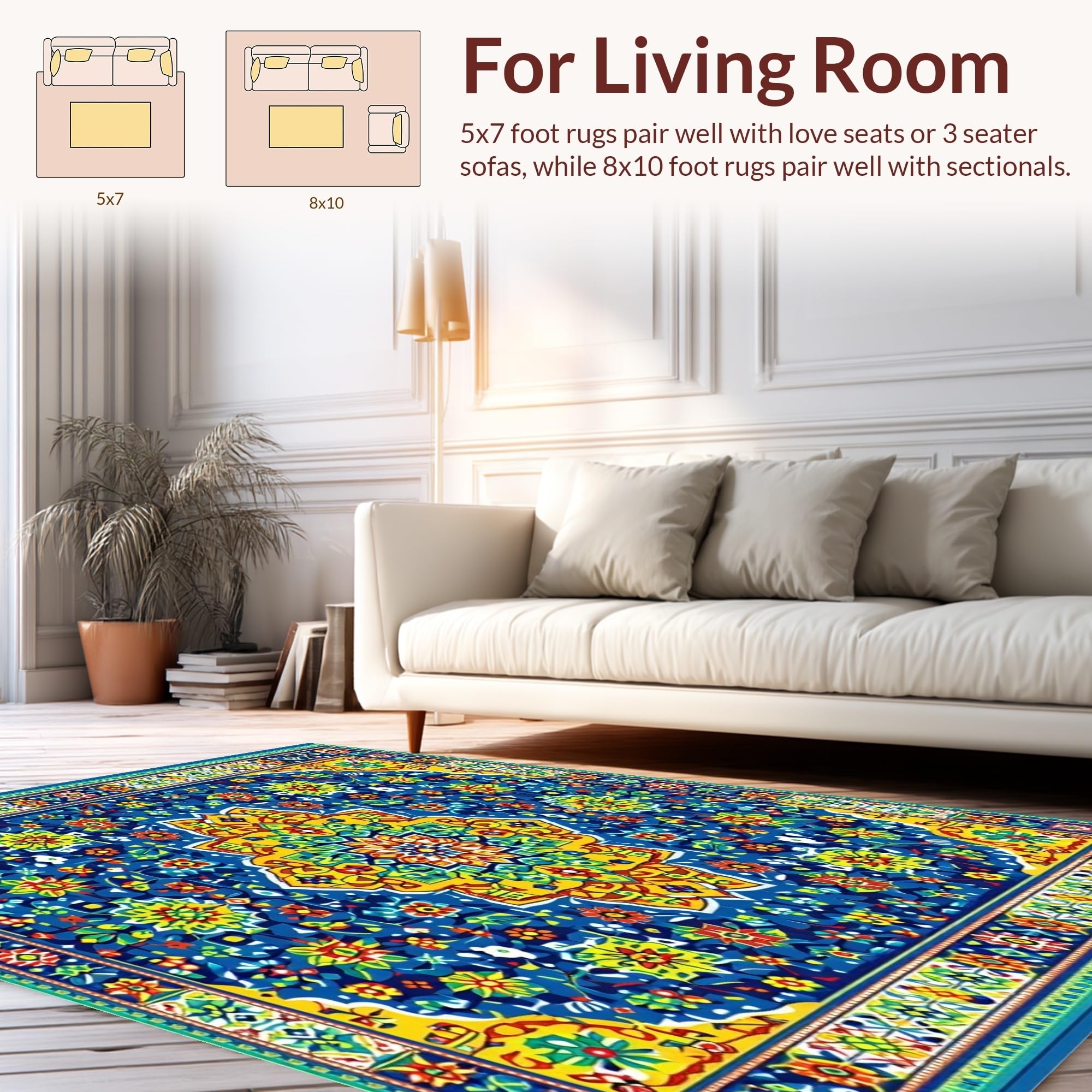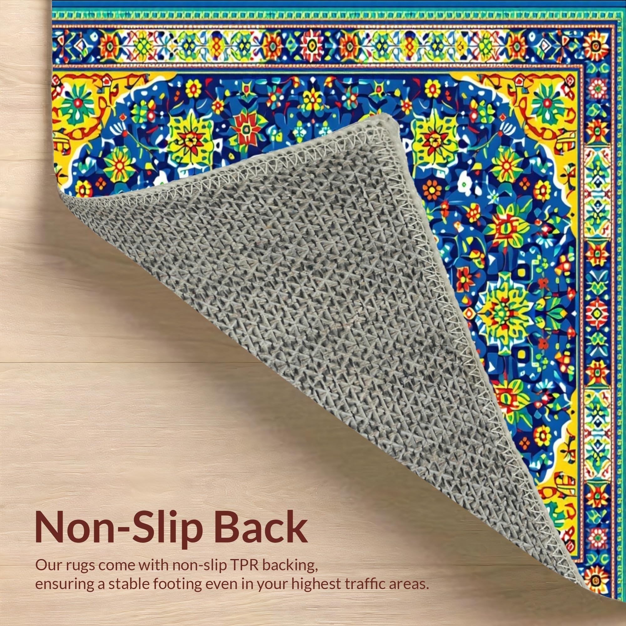 Ultra Soft Area Rug, Non Slip, Stain Resistant, Washable Area Rugs for Living Room, Bedroom, Vibrant Mexican Talavera Tile Rug with Colorful Pottery and Floral Designs(Blue) Overview: