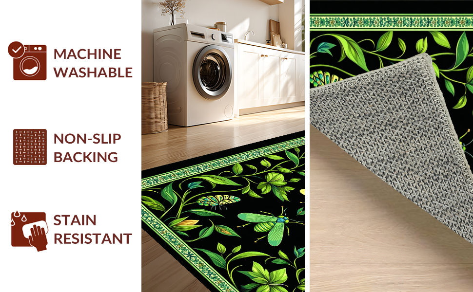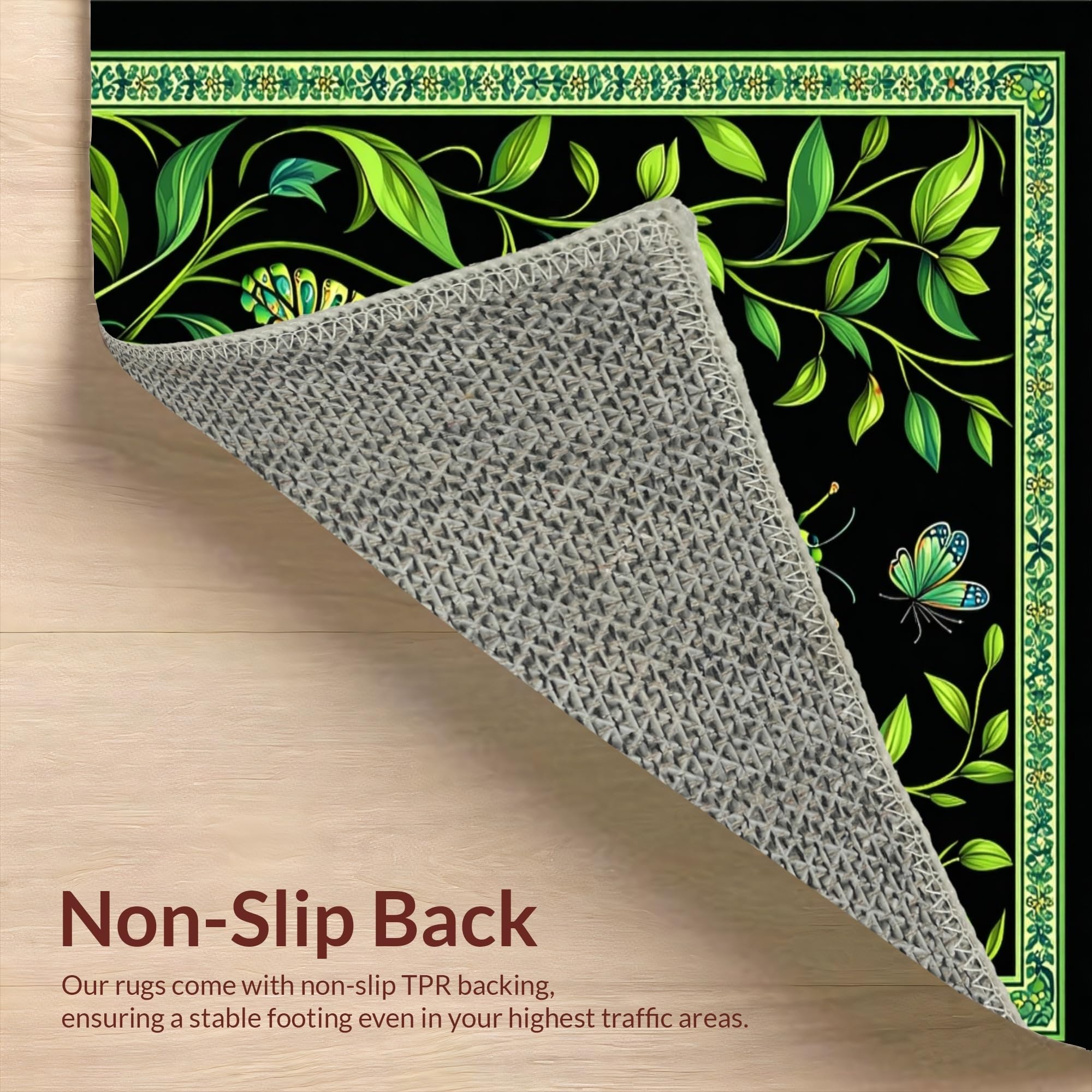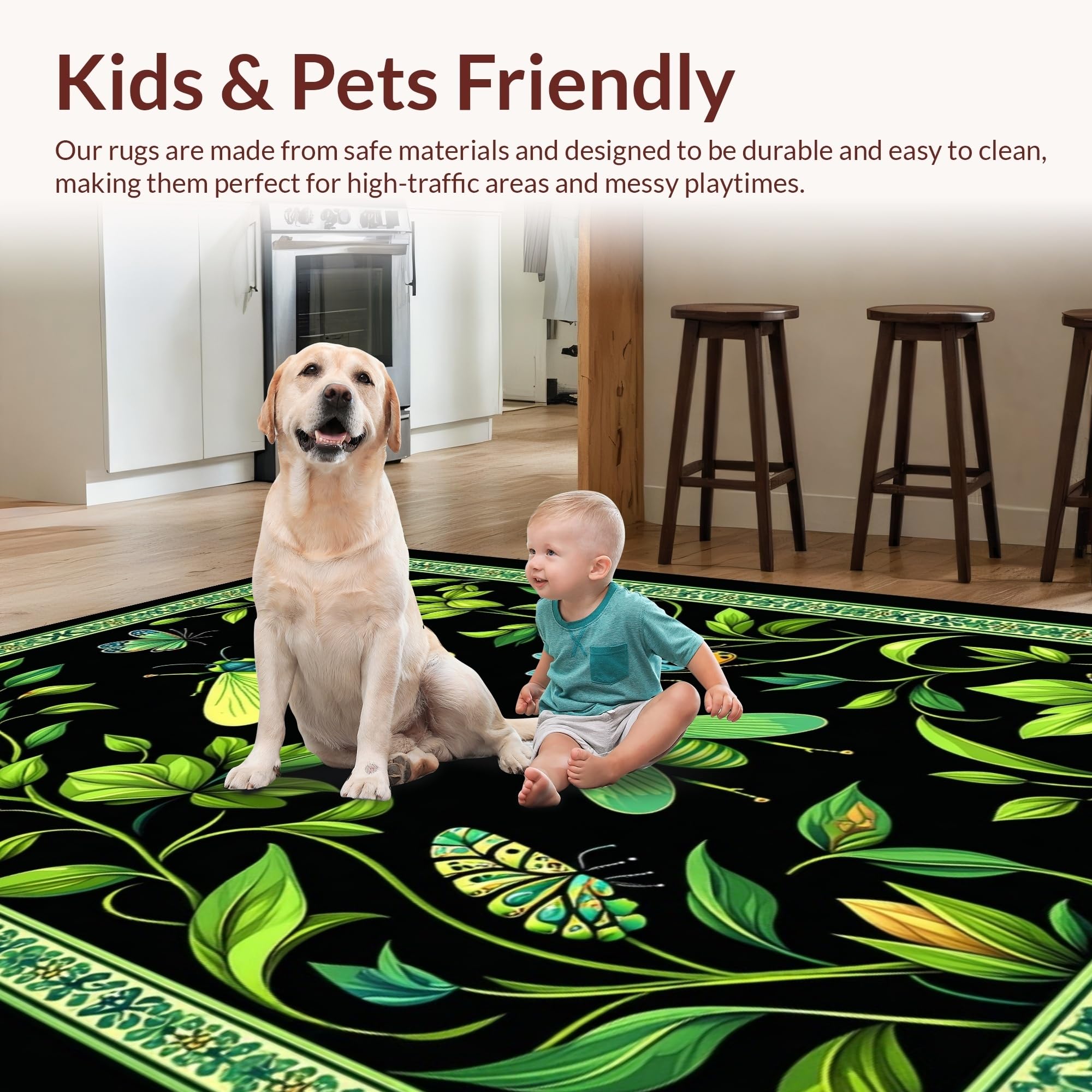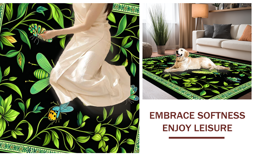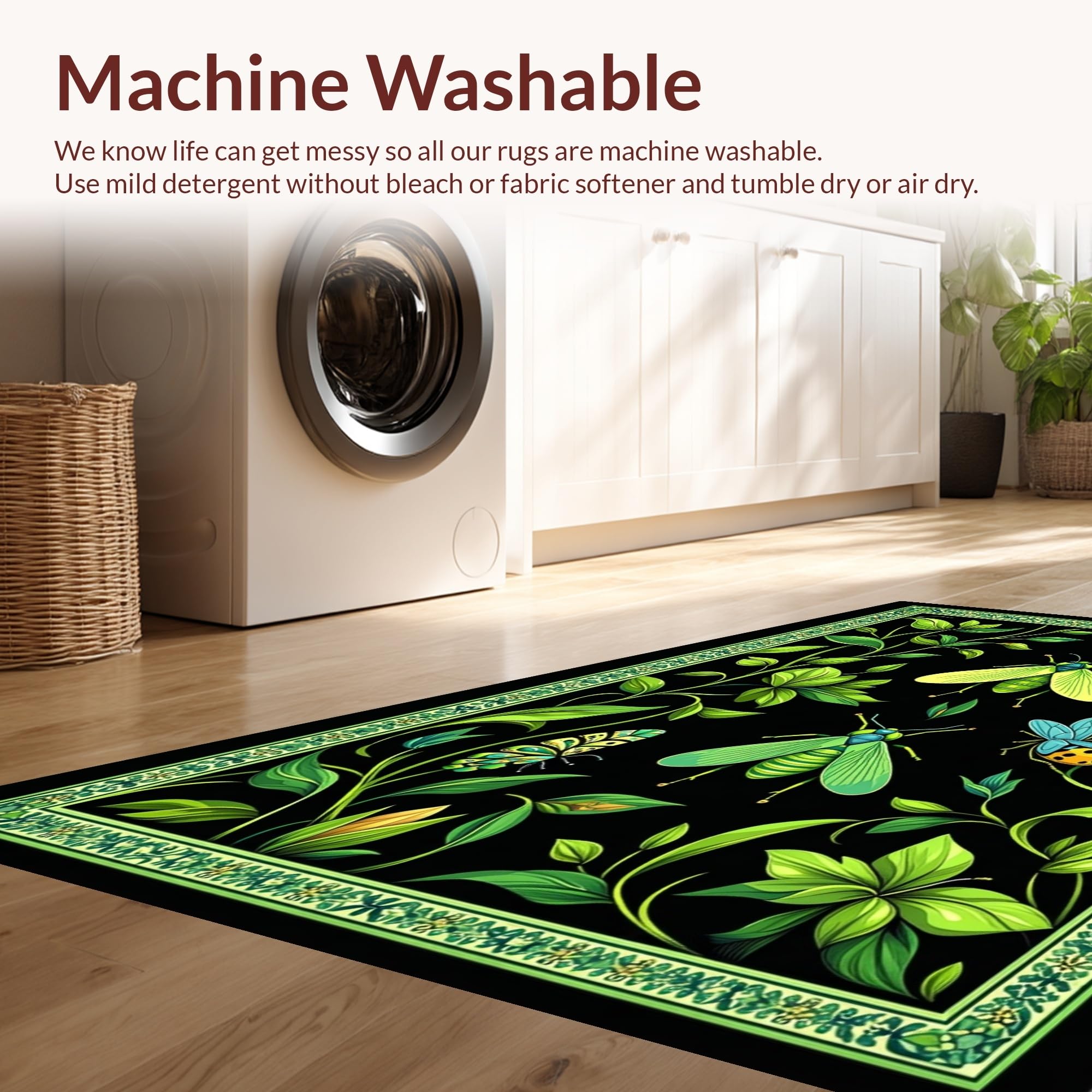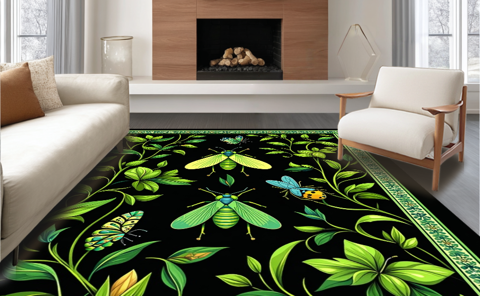 Ultra Soft Area Rug, Non Slip, Stain Resistant, Washable Area Rugs for Living Room, Bedroom, Vivid Green Insect Aesthetic(Black) Overview: