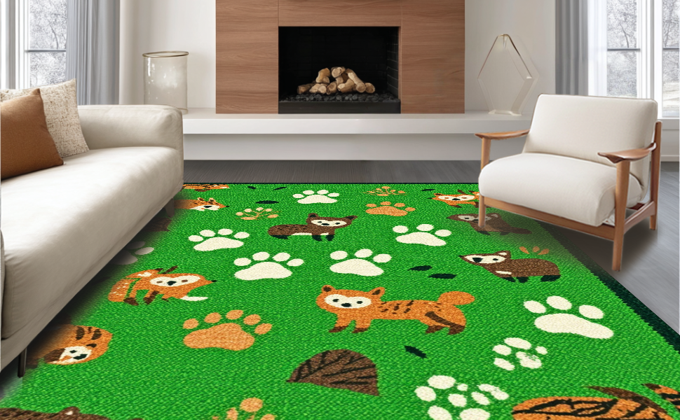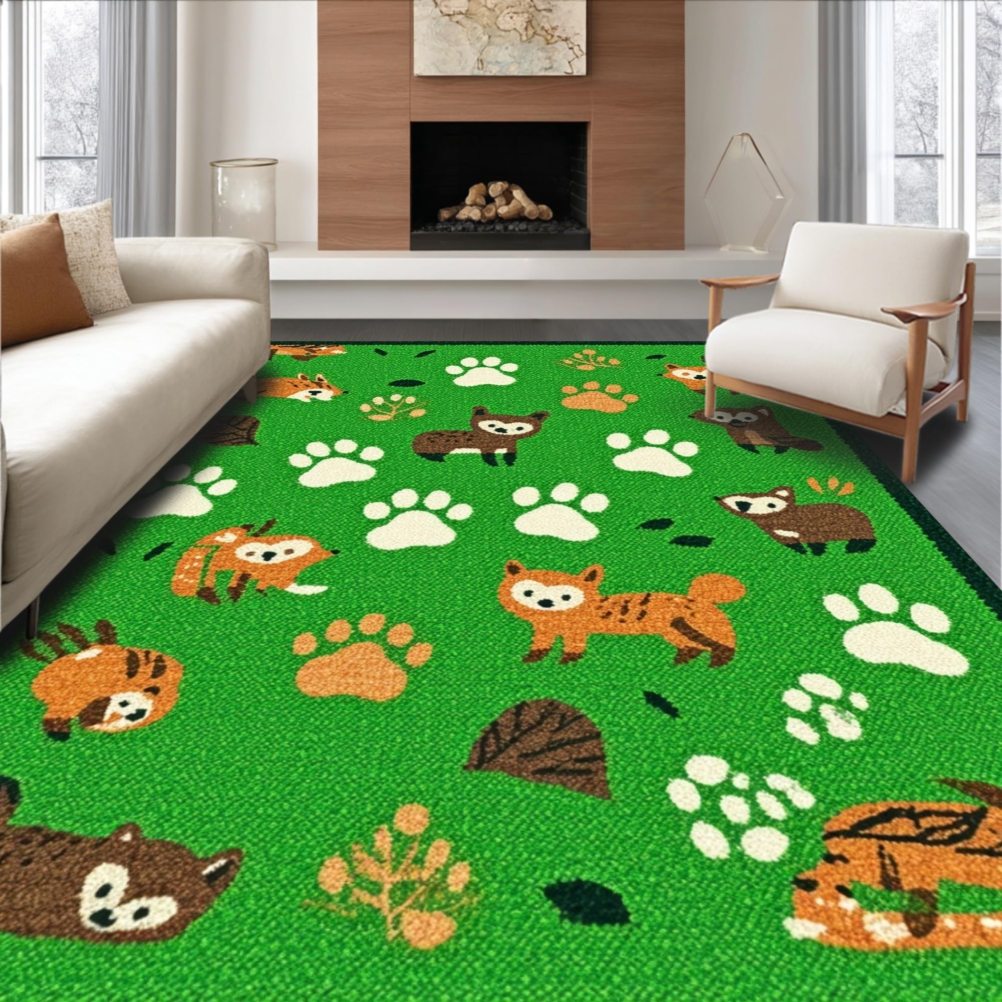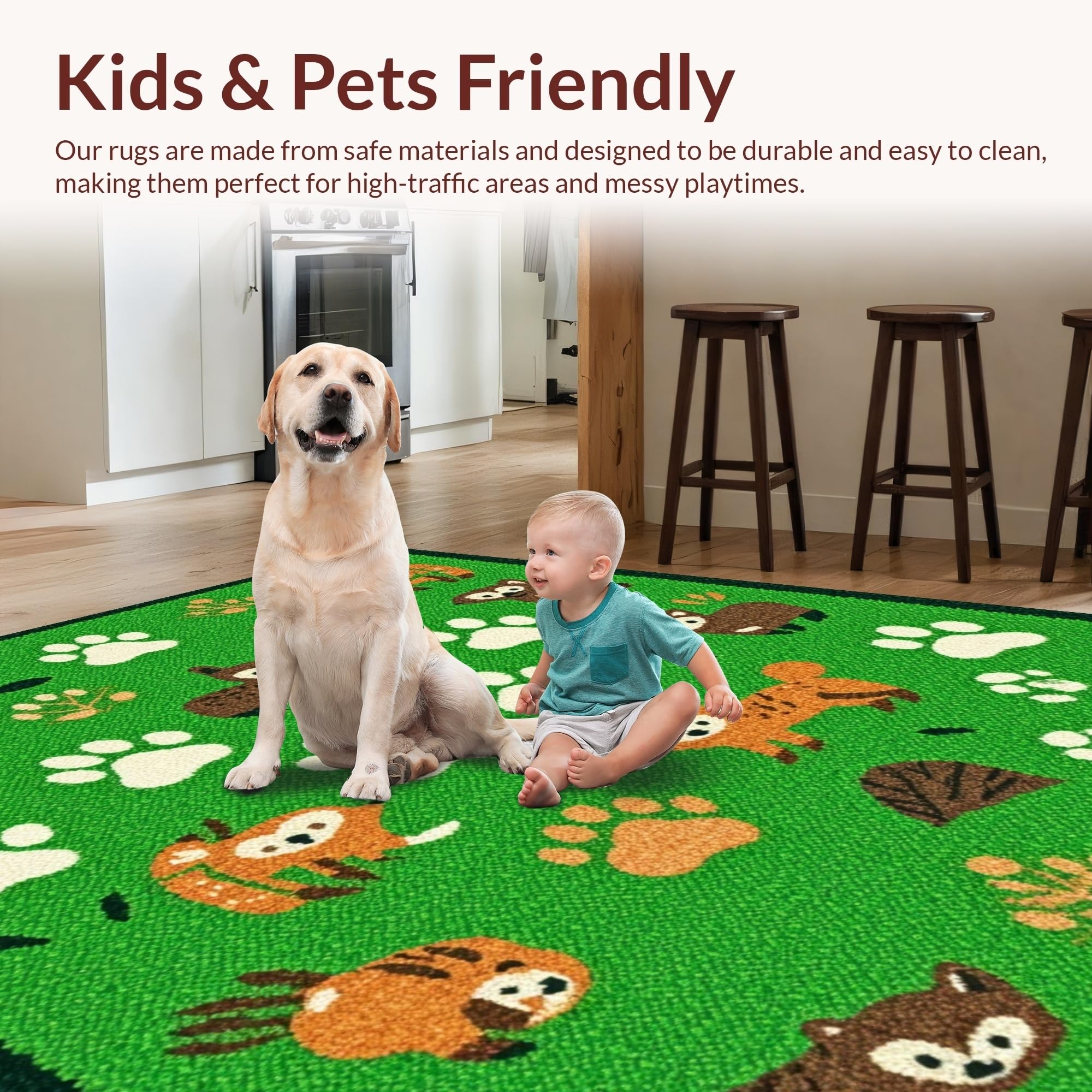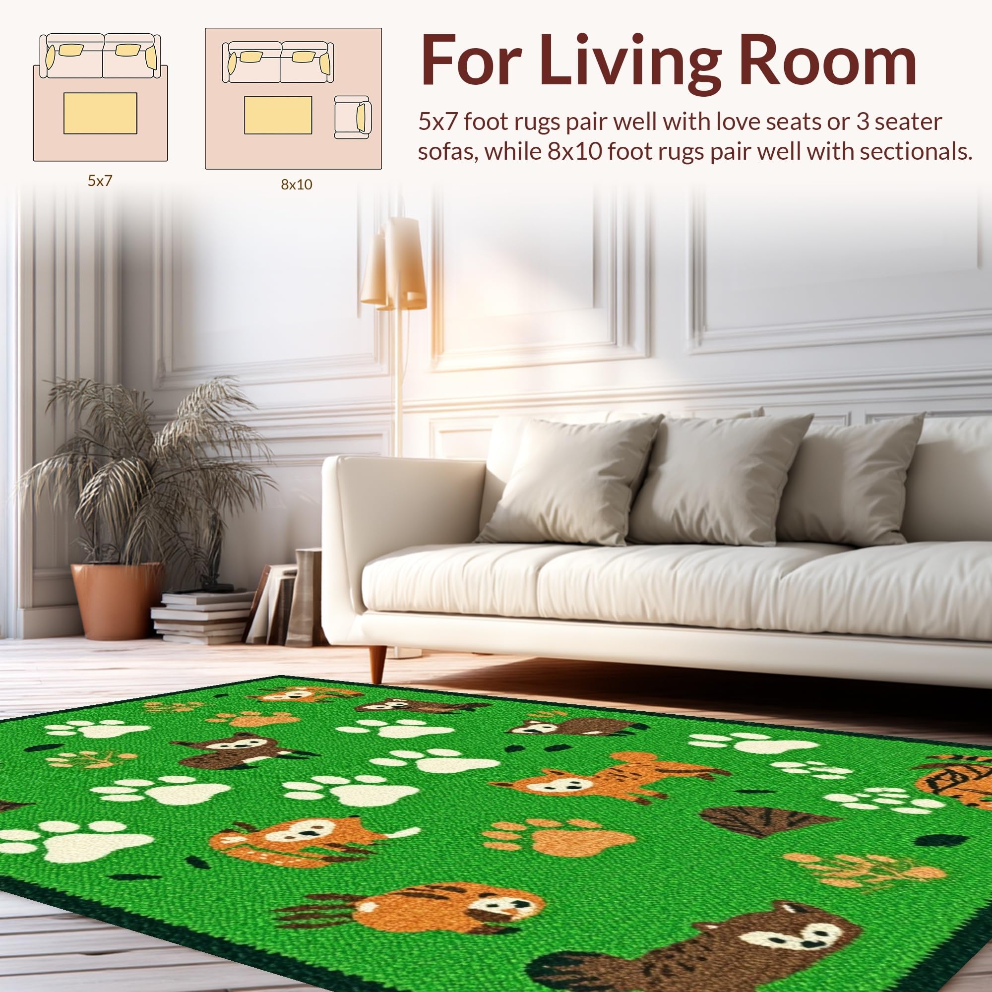 Ultra Soft Area Rug, Non Slip, Stain Resistant, Washable Area Rugs for Living Room, Bedroom, Whimsical Animal Track Motif(Green) Overview: