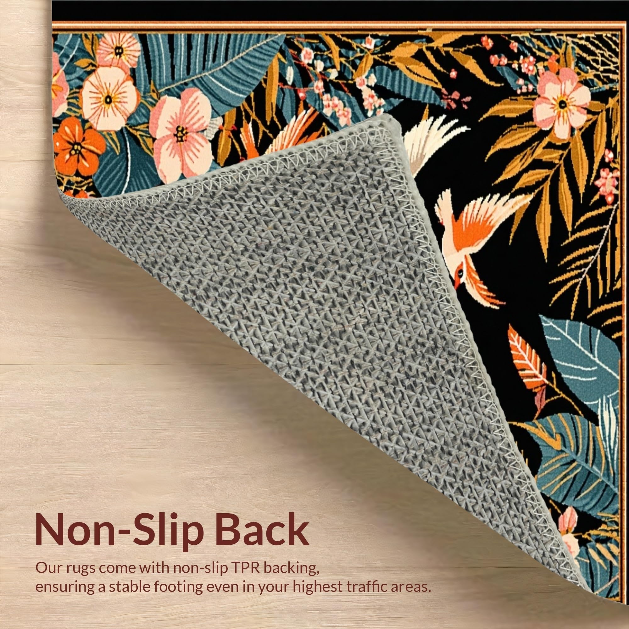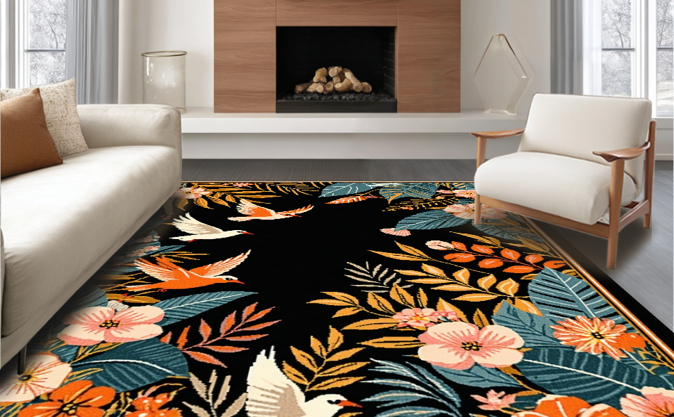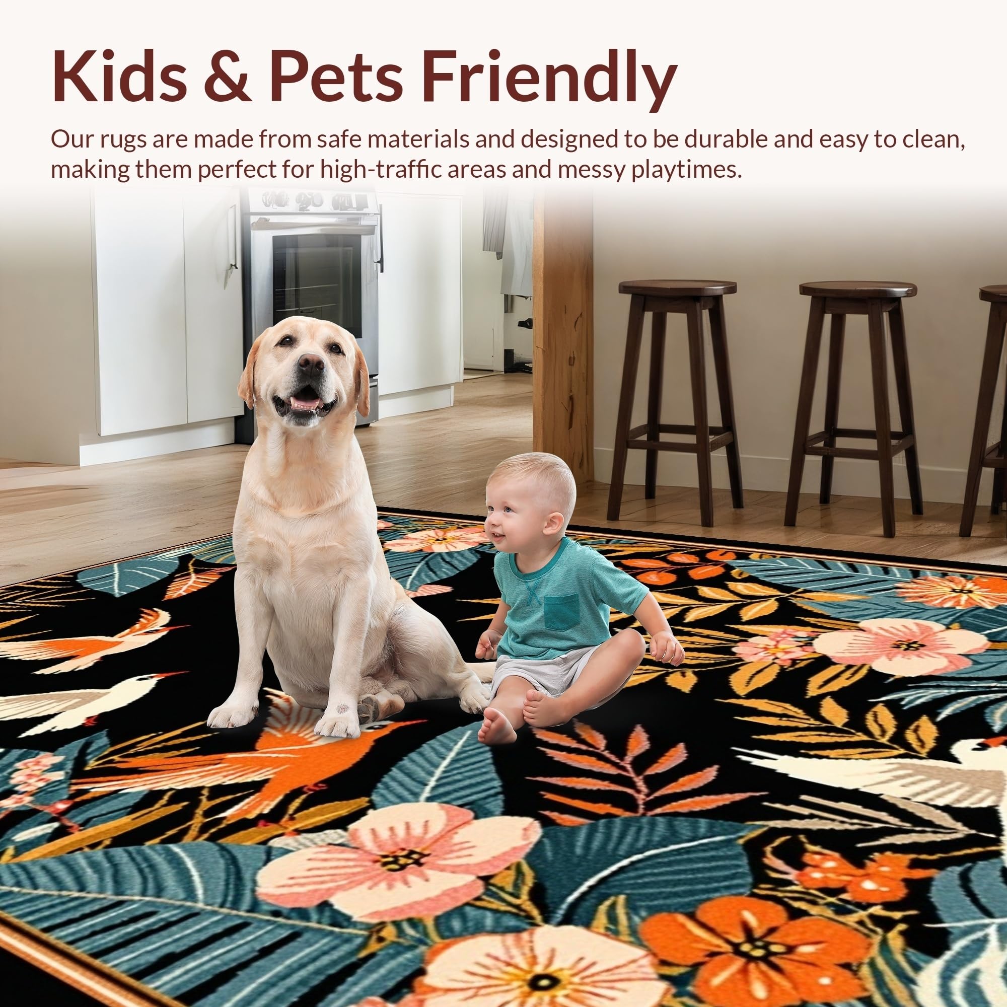 Ultra Soft Area Rug, Non Slip, Stain Resistant, Washable Area Rugs for Living Room, Bedroom, Whimsical Bright Floral Elegance(Black) Overview: