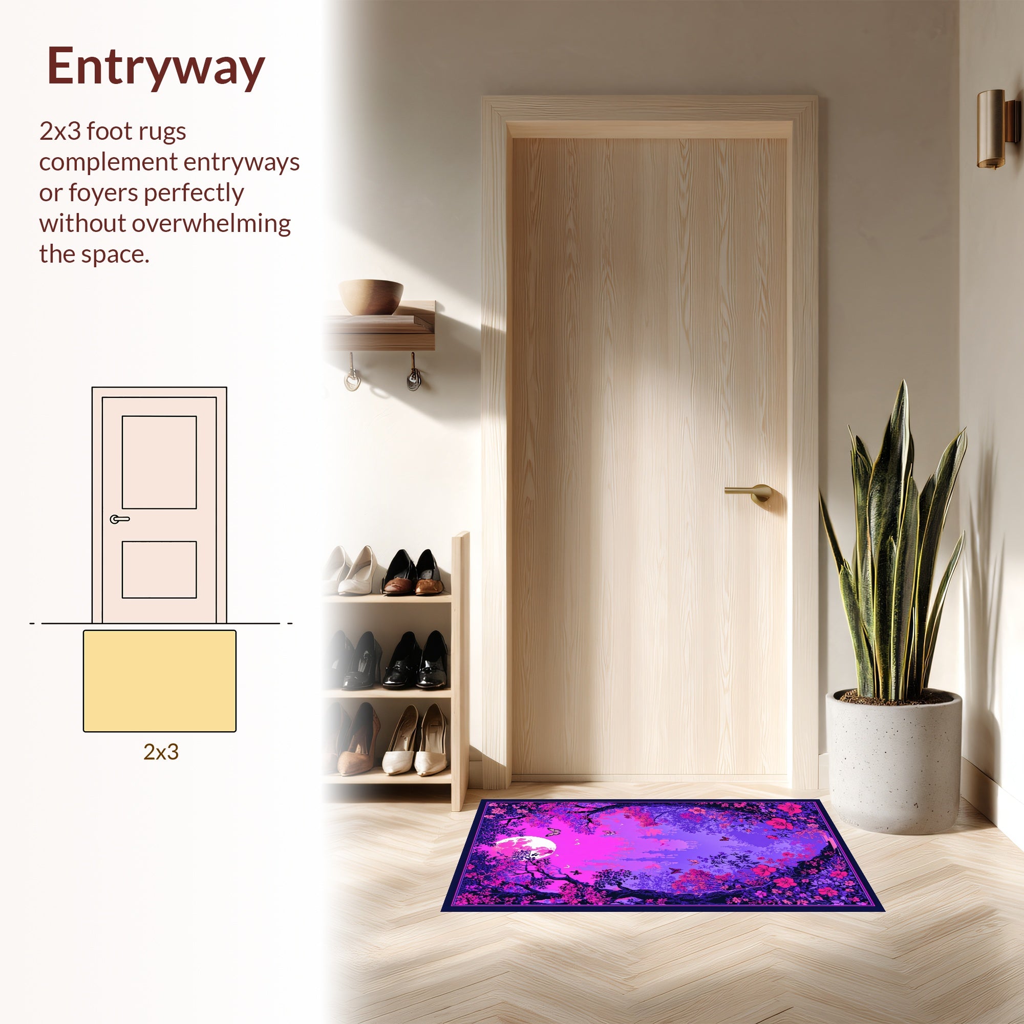 Flatwoven High Traffic Area Rug, Whimsical Moonlit Artwork, Non Slip, Stain Resistant, Washable Area Rugs for Living Room, Bedroom (Purple) Overview: