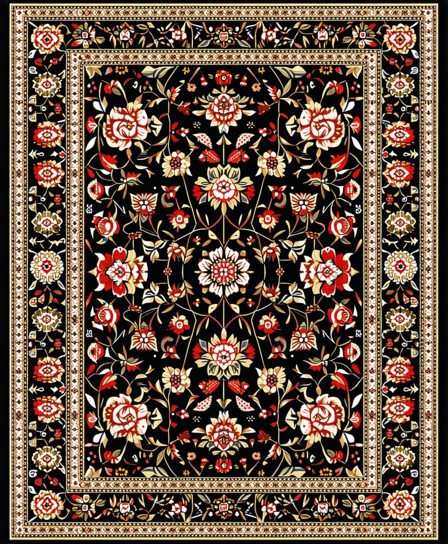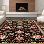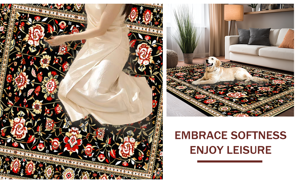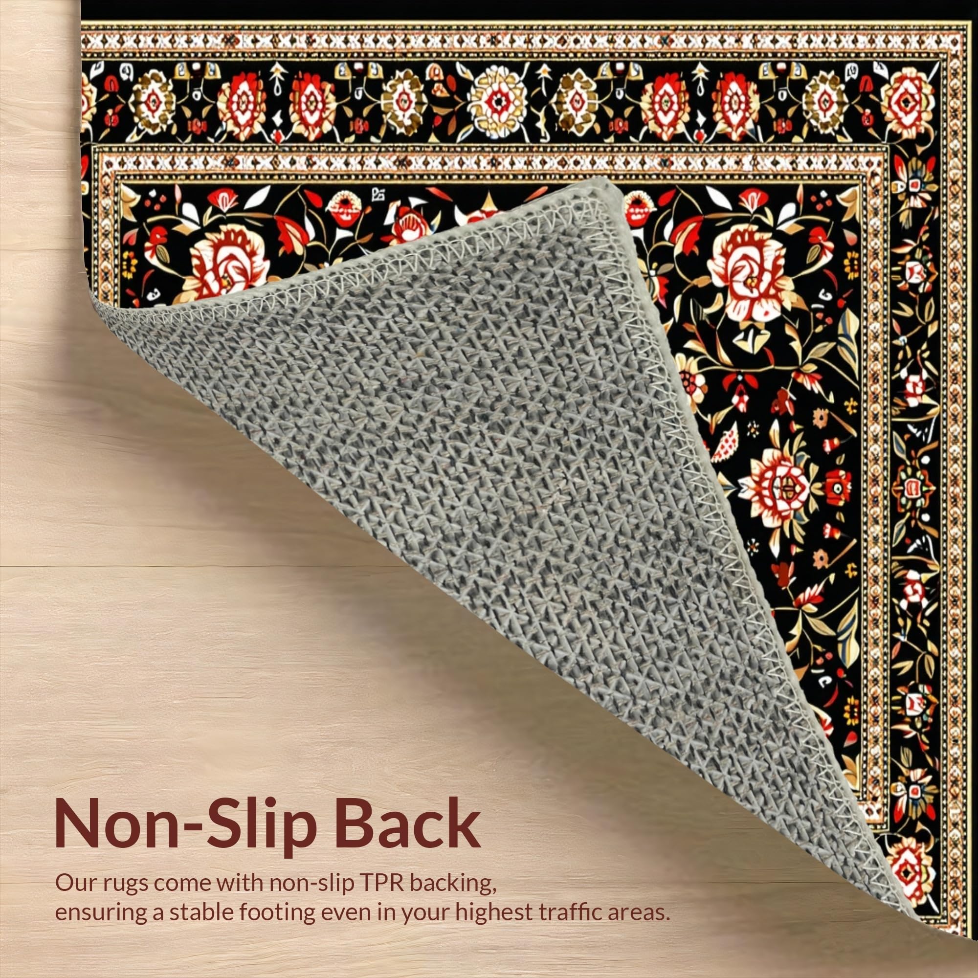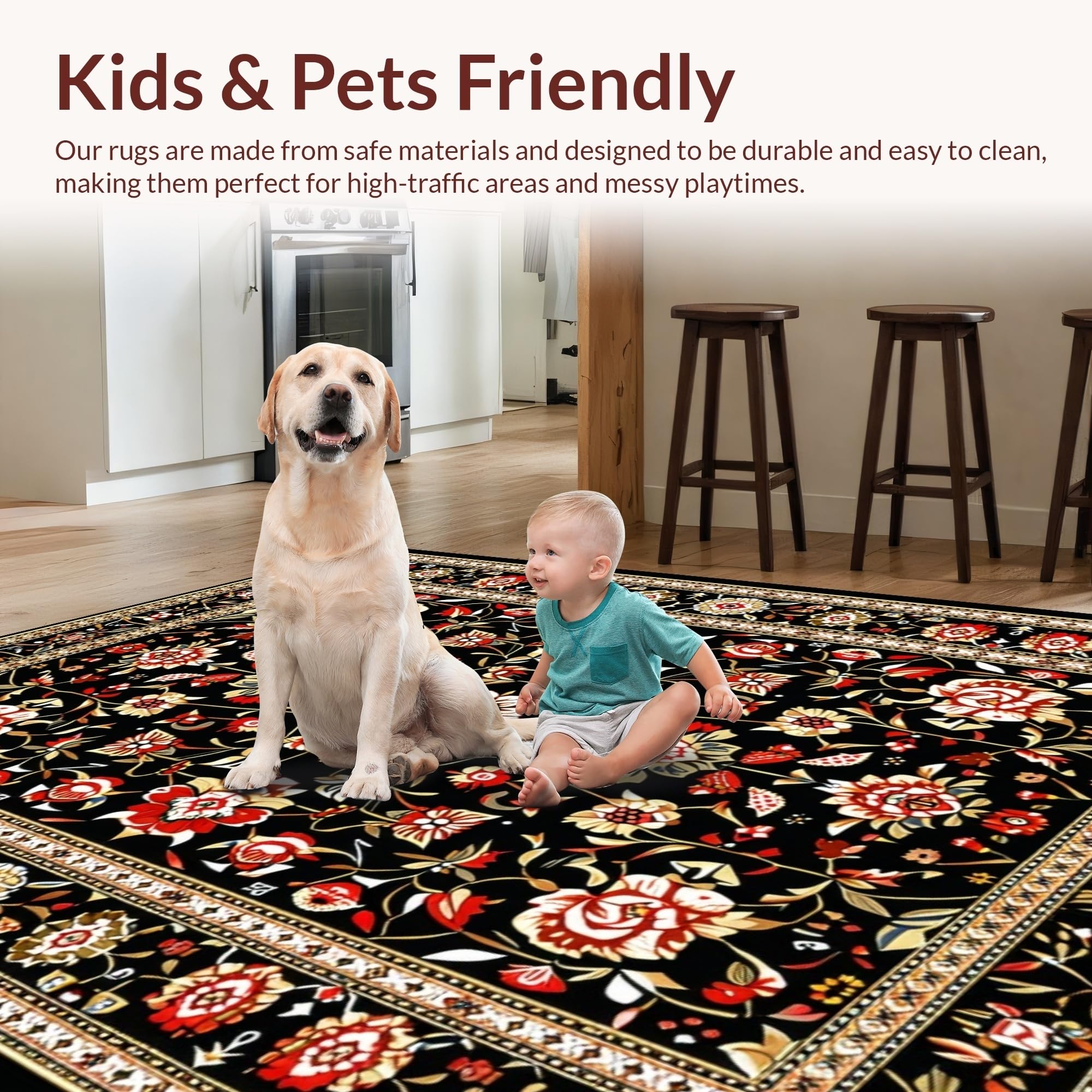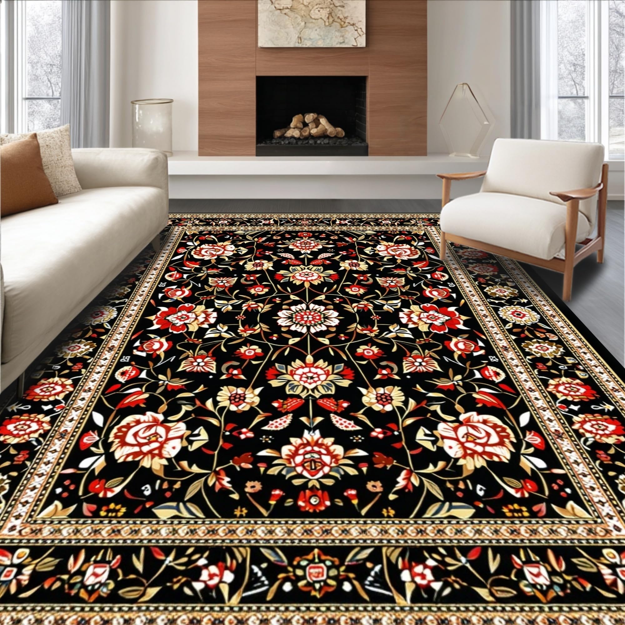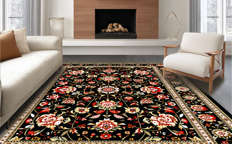Ultra Soft Area Rug, Non Slip, Stain Resistant, Washable Area Rugs for Living Room, Bedroom, Whimsical Colorful Floral Accents(Black) Overview: