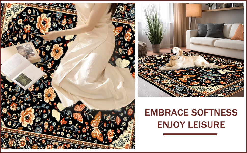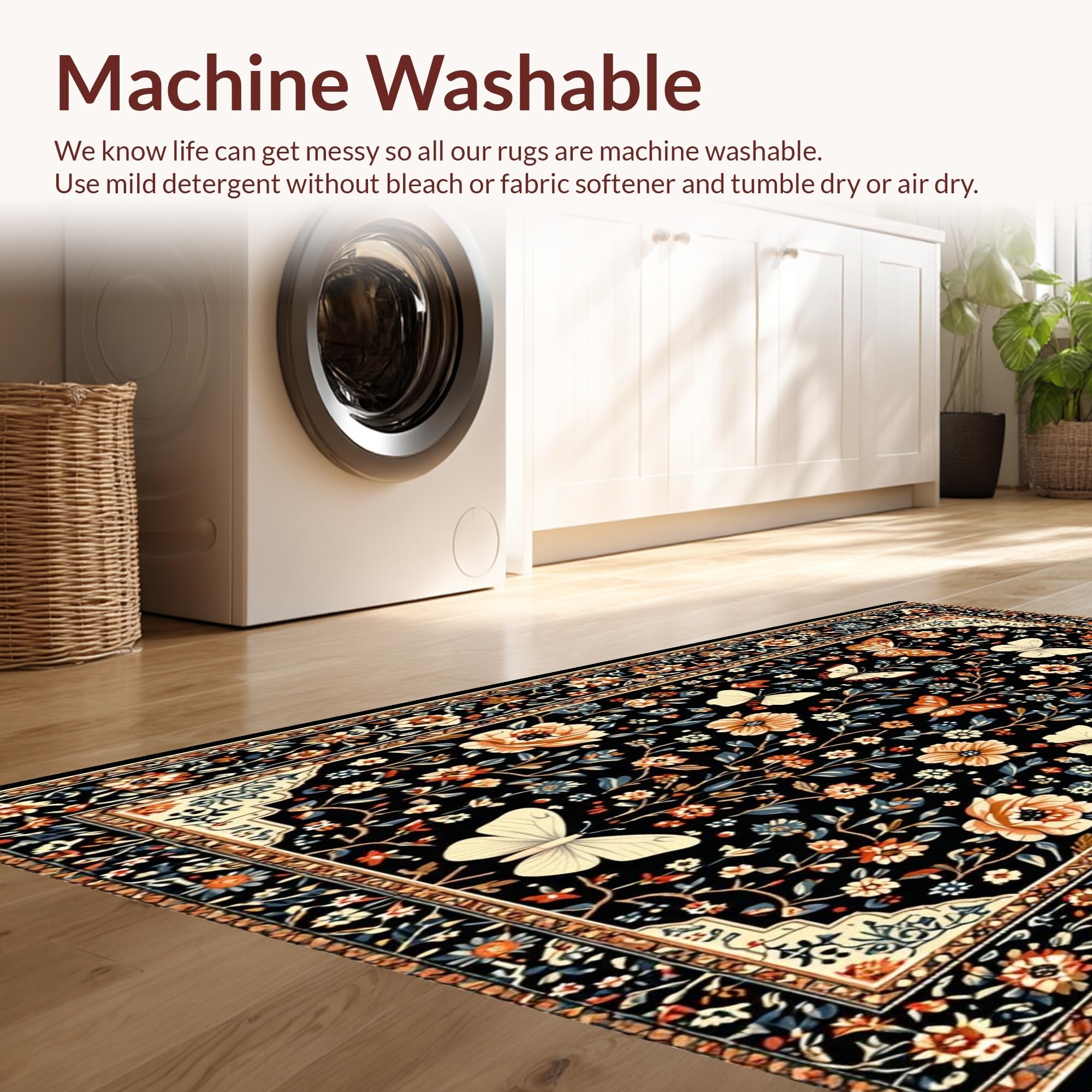 Ultra Soft Area Rug, Non Slip, Stain Resistant, Washable Area Rugs for Living Room, Bedroom, Whimsical Floral Insect Aesthetic(Black) Overview: