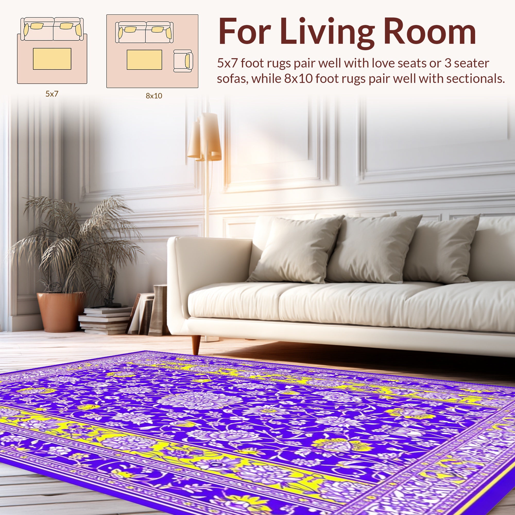 Flatwoven High Traffic Area Rug, Whimsical Floral Patterned, Non Slip, Stain Resistant, Washable Area Rugs for Living Room, Bedroom (Purple) Overview: