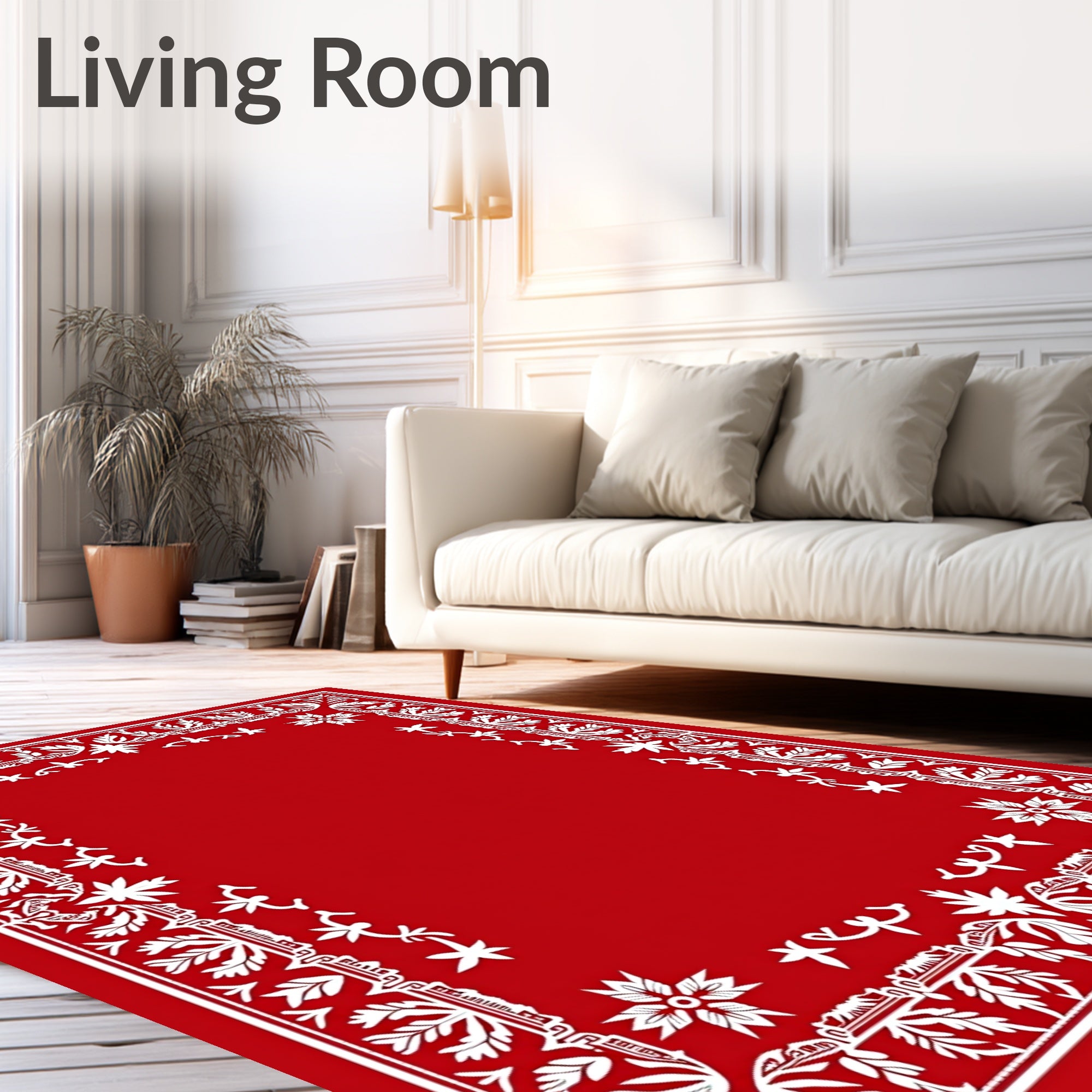 Ultra Soft Area Rug, Non Slip, Stain Resistant, Washable Area Rugs for Living Room, Bedroom, Whimsical Holiday Design Featuring Tipped Leaves and Bursts(Red) Overview: