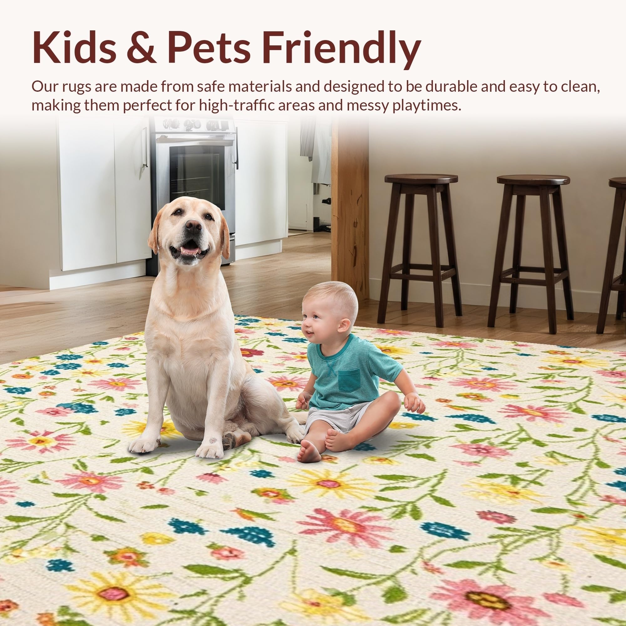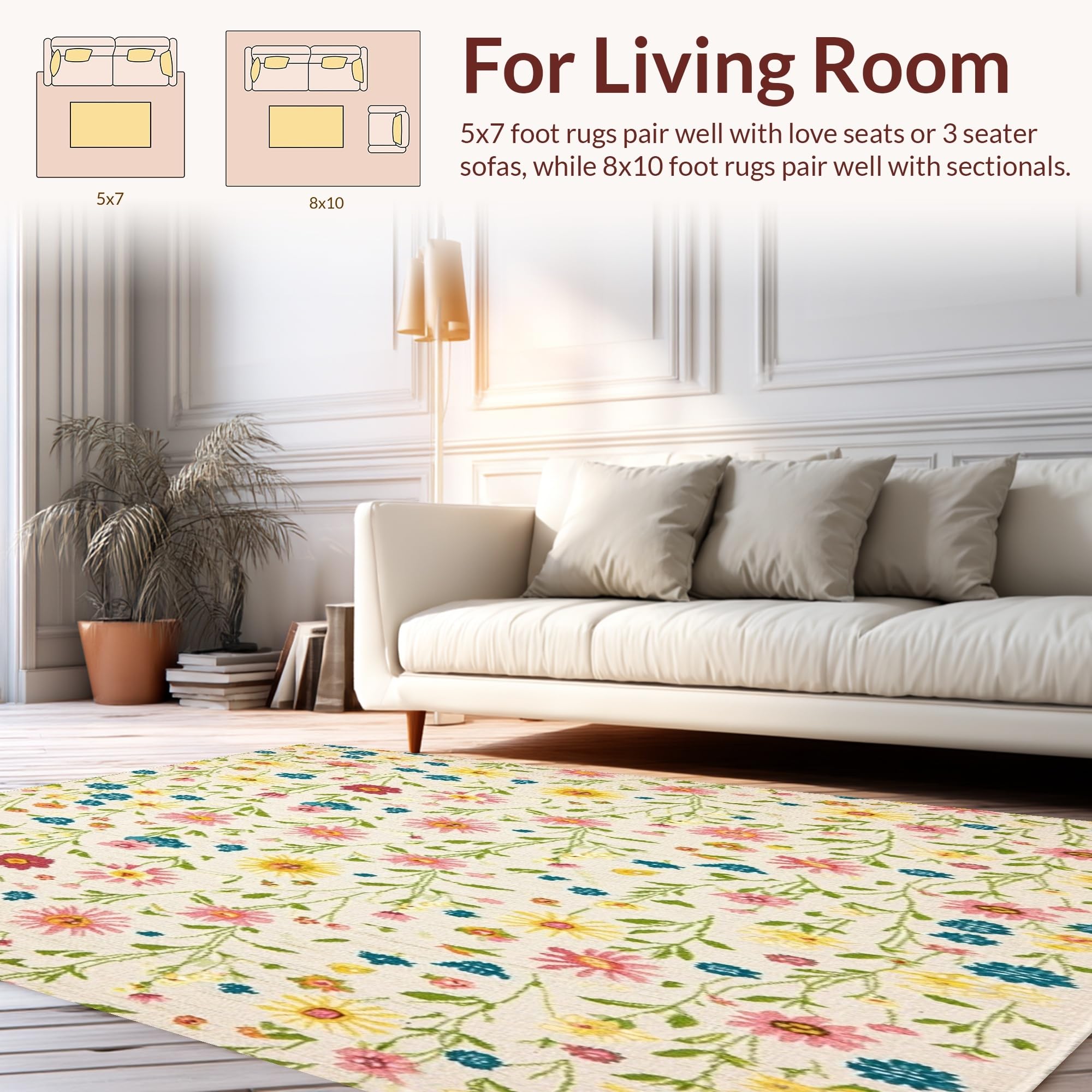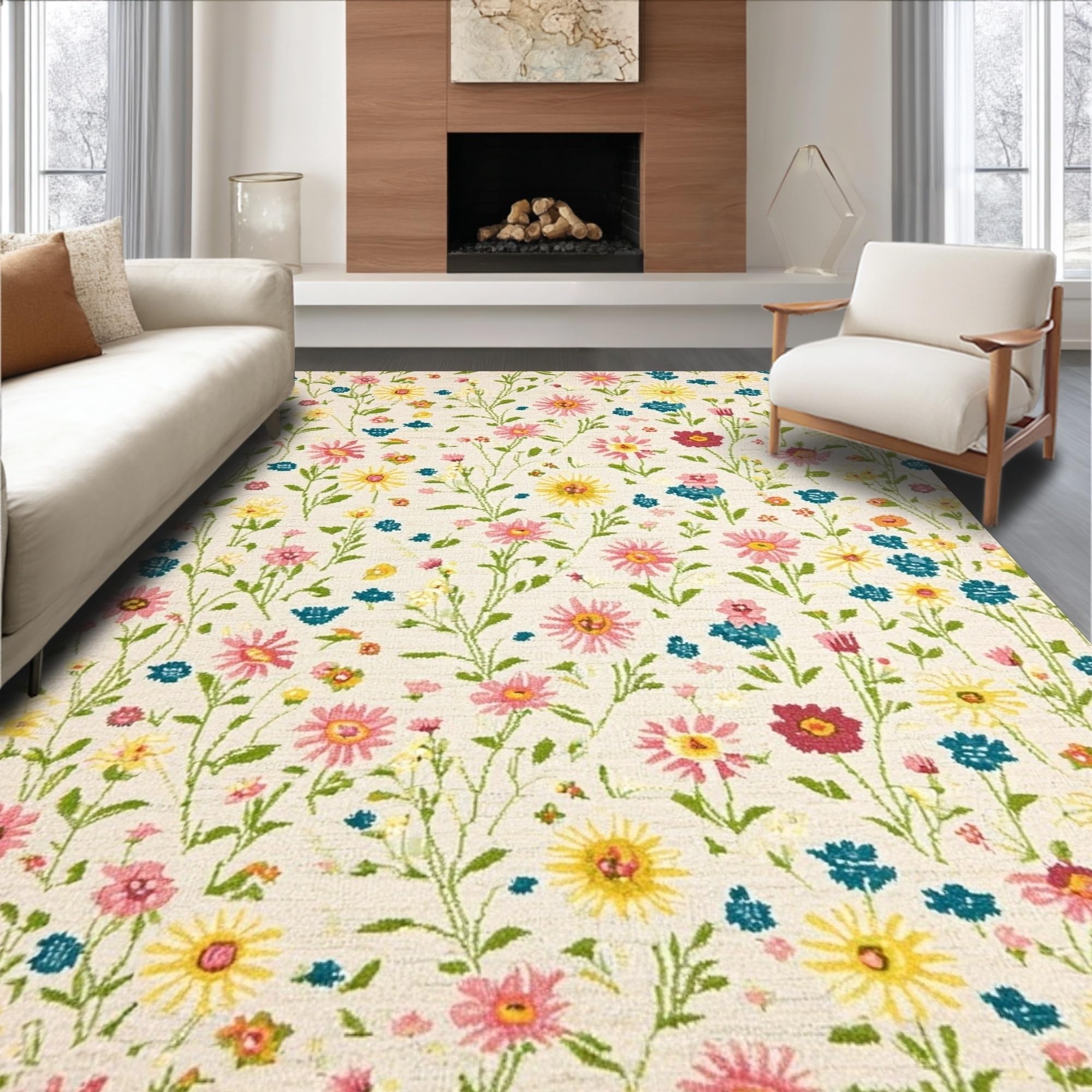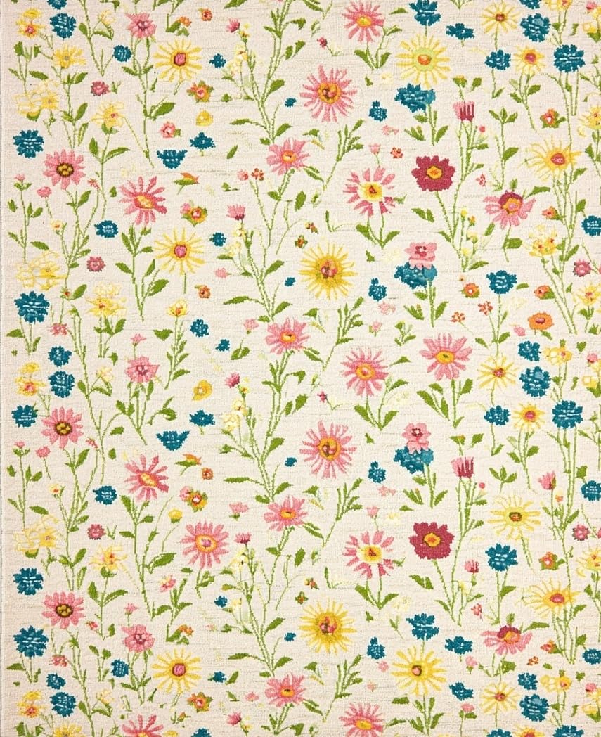 Ultra Soft Area Rug, Non Slip, Stain Resistant, Washable Area Rugs for Living Room, Bedroom, Wildflower Meadow with Whimsical Floral Print and Delicate Petals(Ivory) Overview: