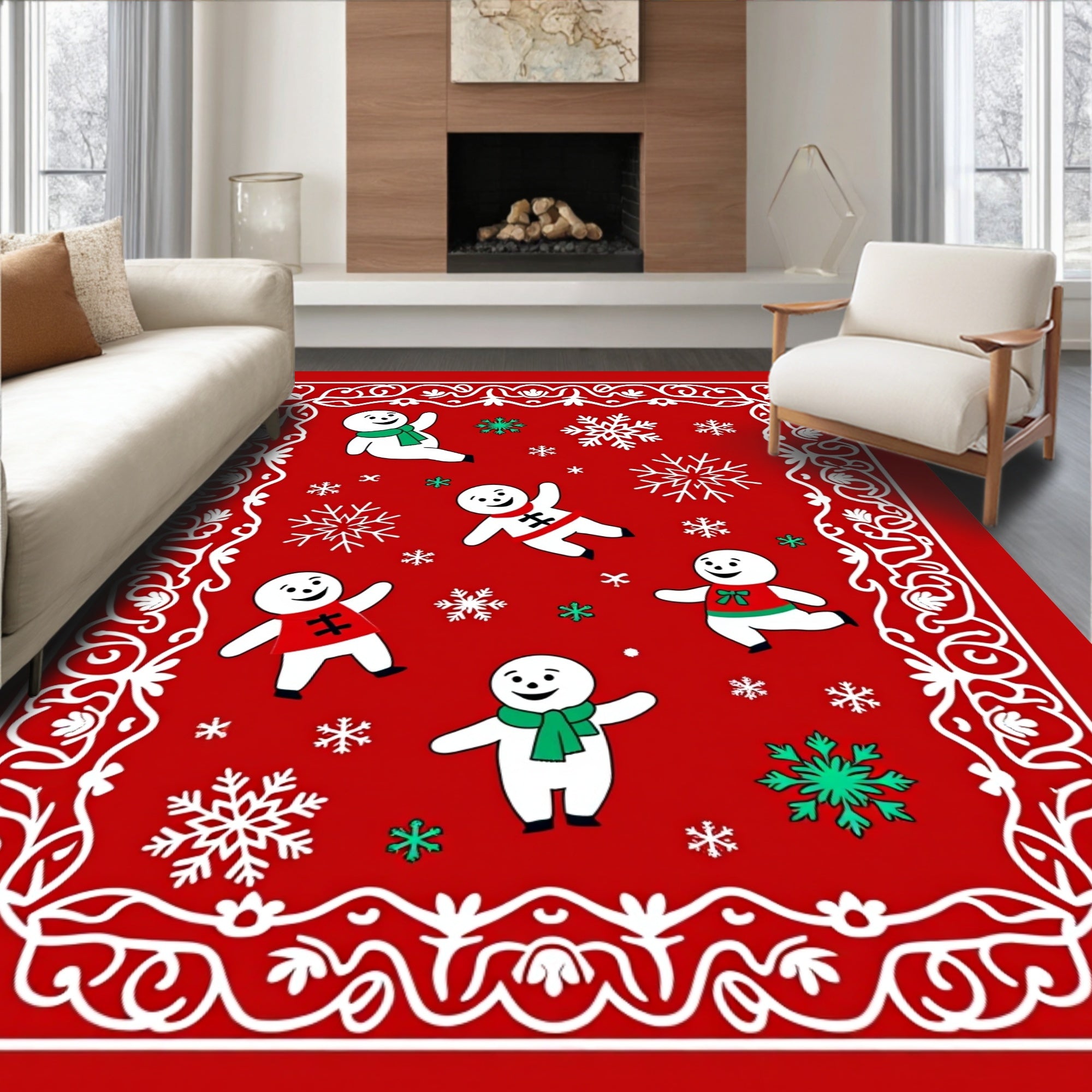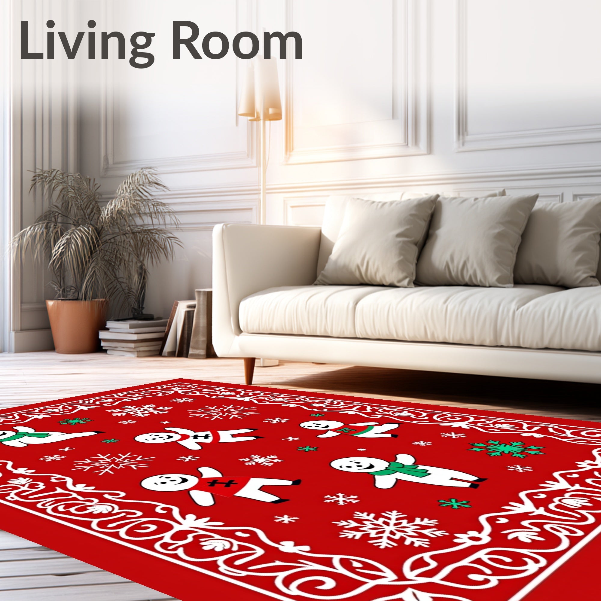 Ultra Soft Area Rug, Non Slip, Stain Resistant, Washable Area Rugs for Living Room, Bedroom, Winter Wonderland Scroll Featuring Dancing Snowflakes And Snowmen(Red) Overview: