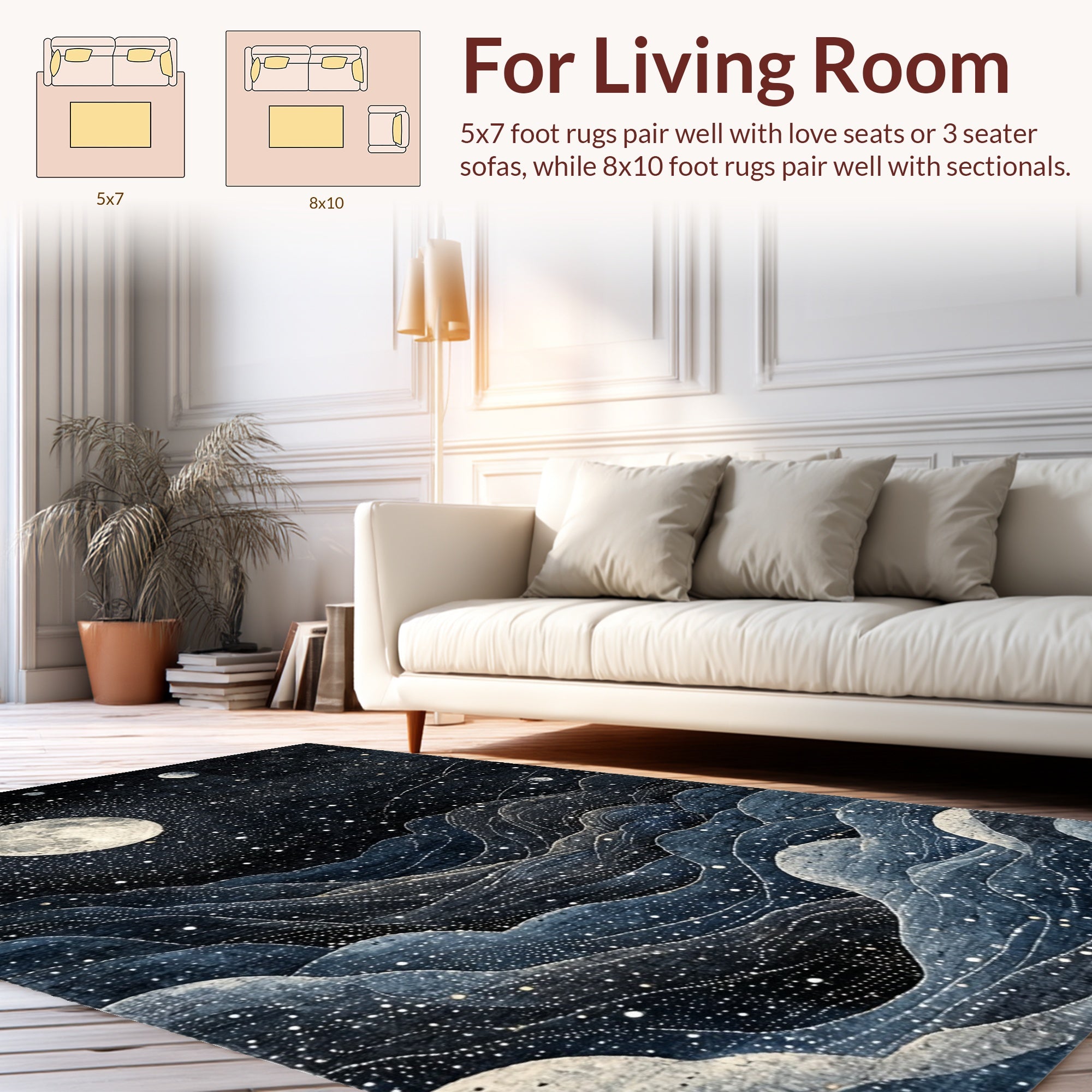 Ultra Soft Area Rug, Non Slip, Stain Resistant, Washable Area Rugs for Living Room, Bedroom, Witchy Cosmos Rug with Lunar Cycle Rings and Boho Star Map Accents(Blue) Overview: