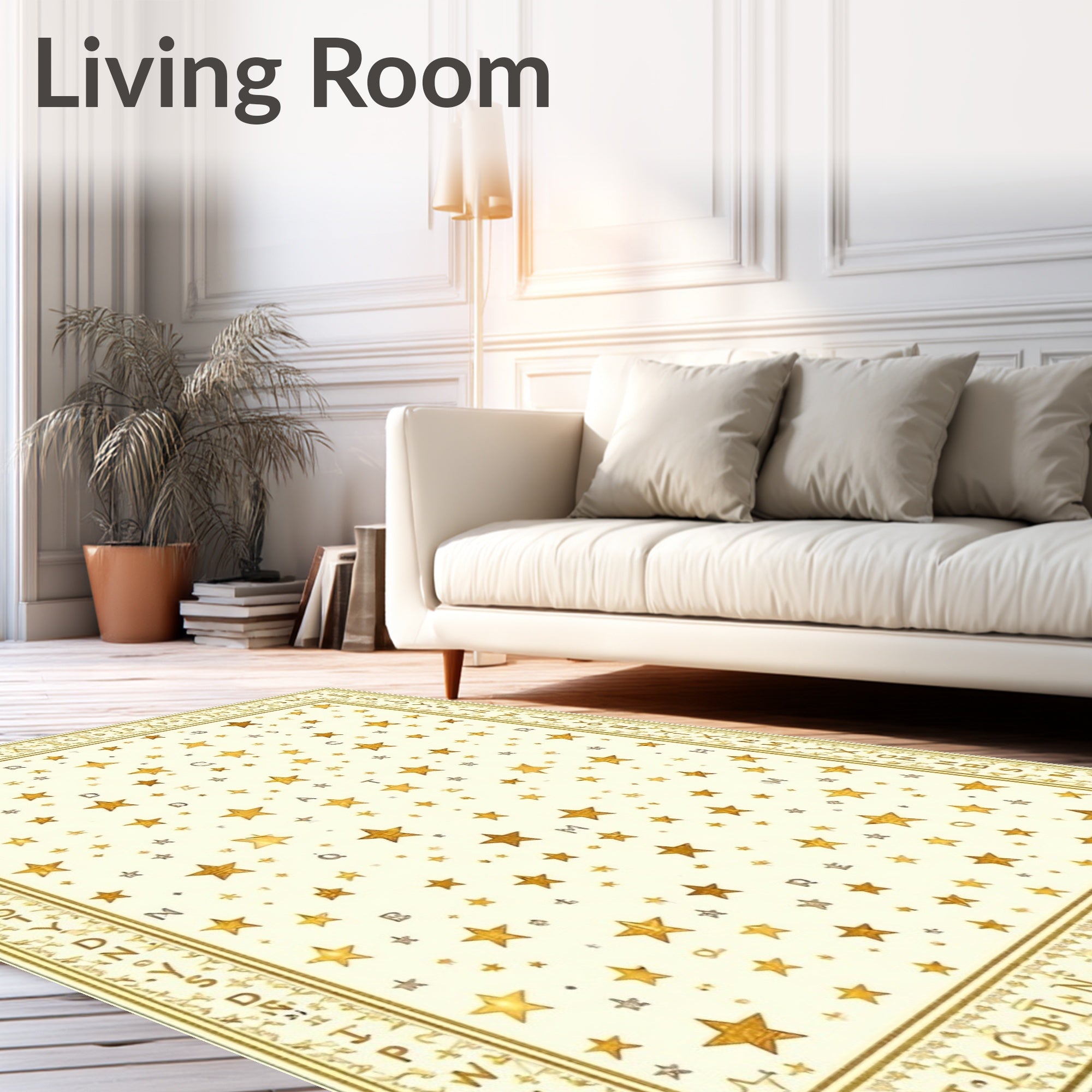 Ultra Soft Area Rug, Non Slip, Stain Resistant, Washable Area Rugs for Living Room, Bedroom, Wonderland Starry Letters Circle with Beige Hues and Storybook Motifs(Gold) Overview: