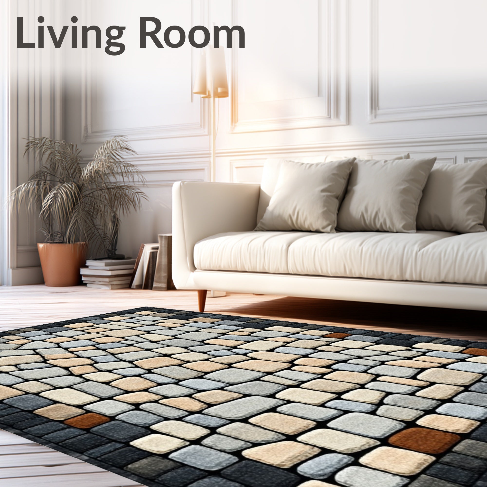 Flatwoven High Traffic Area Rug, Zen Stone Mosaic with Cobblestone Inspired Boho Geometric Motifs, Non Slip, Stain Resistant, Washable Area Rugs for Living Room, Bedroom (Beige) Overview: