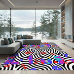 This rug channels the audacious spirit of 1970s Memphis Design, where bold geometry and unexpected color combinations challenged the quietude of modernist interiors. The black and white zebra print, a classic motif reimagined with a contemporary edge, serves as a vibrant backdrop for the playfully scattered abstract letters and playful accent shapes. It's a visual symphony of contrasting rhythms, where the familiar wilderness of animal prints meets the liberated whimsy of Neo-Pop graphics. Imagine this rug as a portal, transforming your room into a whimsical studio space or a lively salon—a testament to unapologetic self-expression. For the individual who believes color is an attitude and pattern is a story, this design speaks volumes. It's for the home that thrives on joy, the space that dares to be different. This is not just a rug; it's a declaration of fun, a reminder that even the most functional spaces can be infused with personality and boundless creativity. Anchor your world with a splash of audacious delight.