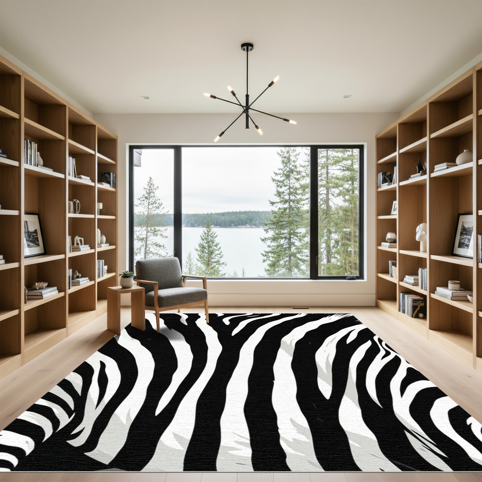 Echoing the untamed elegance of African savannas, this design captures the primal rhythm of the zebra's iconic stripes. It's a nod to the bold graphic sensibilities of early 20th-century Art Deco, reimagined with a contemporary edge. The sharp contrast of void-black against stark white creates a visual siren song, a testament to nature's raw, unadulterated artistry. This rug doesn't just occupy a space; it commands it, transforming floors into stages for the drama of the wild. Imagine stepping onto this tableau, the familiar textures of your home reinterpreted through a bold, modern lens. It is for the soul that finds beauty in contrast, the spirit drawn to powerful patterns and unapologetic style. For the home builder who believes statement pieces are not just decor, but declarations of self. This is more than a rug; it's an invitation to embrace the wild within, to live boldly, and to find sanctuary in striking design.