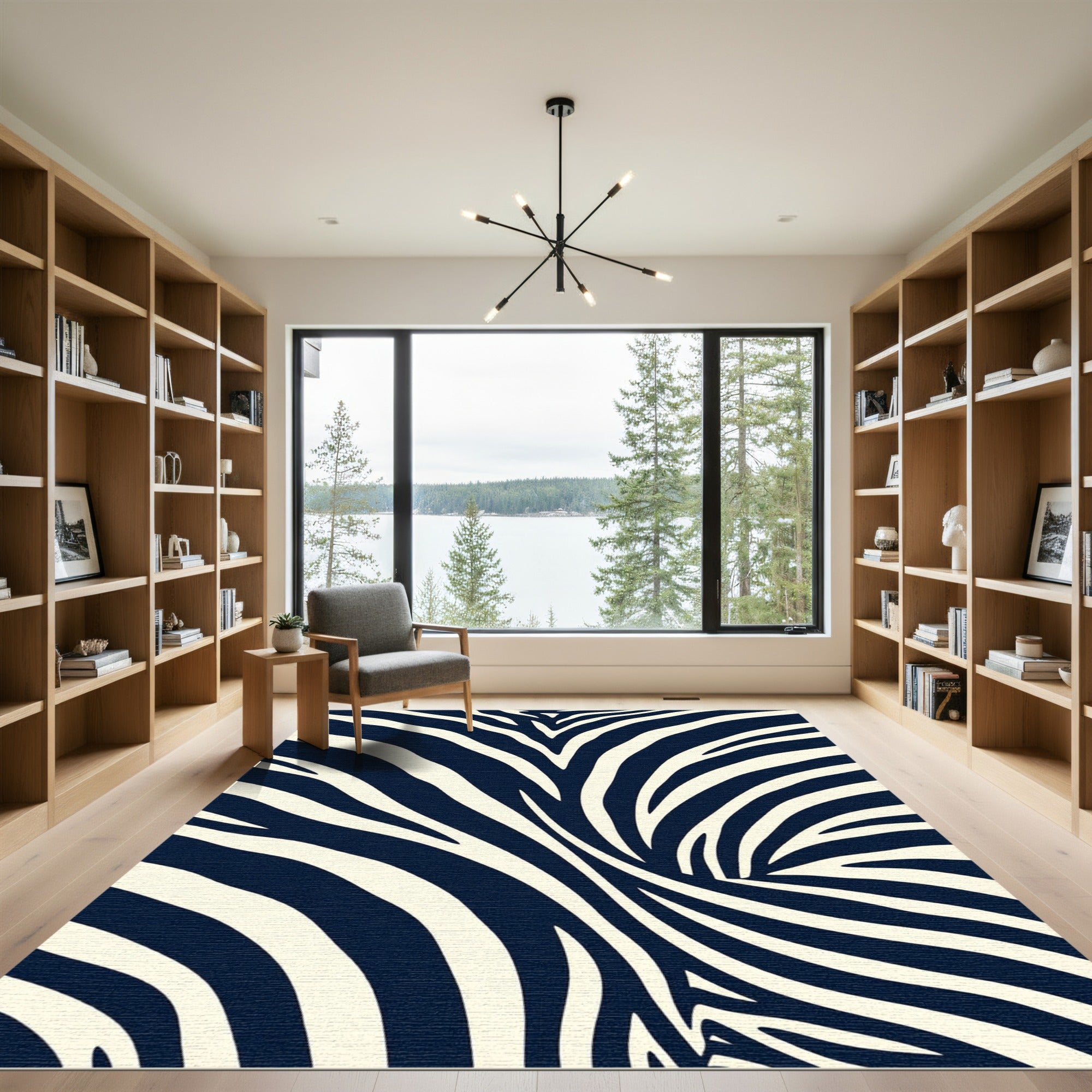 Rooted in the high-octane glamour of midcentury Hollywood Regency and the wild, untamed spirit of the savannah, this design is a masterful study in rhythmic movement. Think of the bold, inky currents of a midnight ocean meeting the stark clarity of architectural geometry. These striking stripes pull the eye into a swirling vortex of deep navy and cream, transforming the floor into a living, breathing motif that evokes the pulse of urban jungle life. This rug is not merely a floor covering; it is a declaration of confidence for the homebuilder who believes design should be both daring and serene. When you anchor your room with these sweeping, hypnotic lines, the surrounding space shifts—walls seem to inhale, and the room gains a vibrant, rhythmic energy. It is an invitation to walk upon art, to invite the wild into the refined, and to live in constant, beautiful motion.