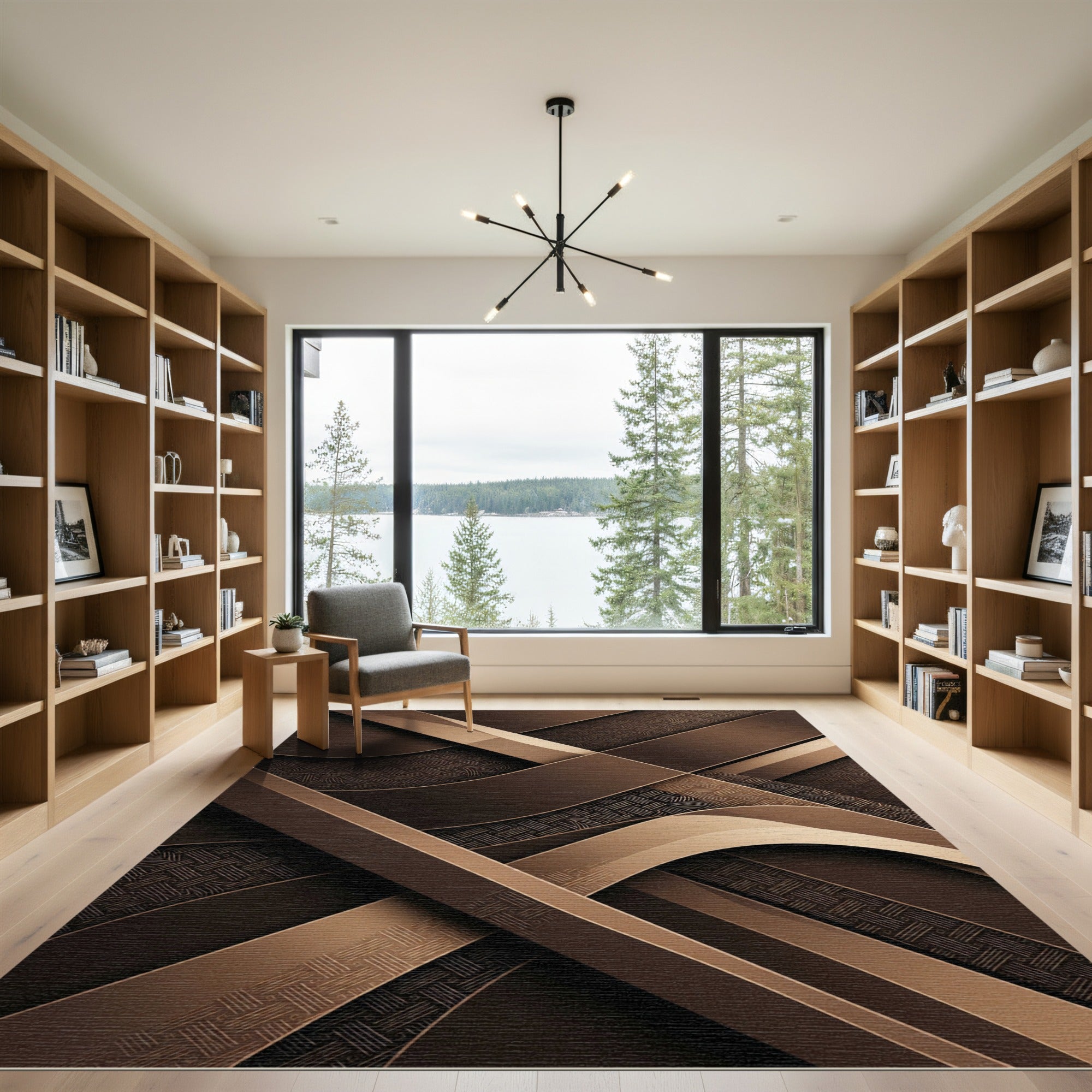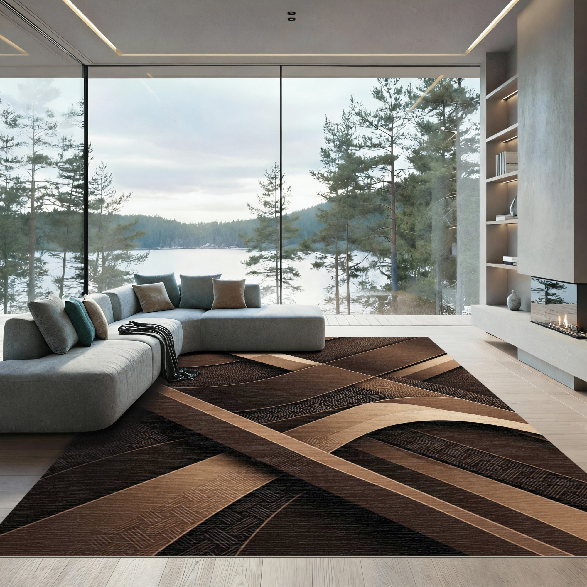Drawing inspiration from the structural rigor of Bauhaus minimalism and the fluidity of midcentury modernist architecture, this rug is a reimagining of space and shadow. Think of it as a spatial composition where sweeping, sun-drenched bronze ribbons intersect with deep, obsidian-hued woven valleys. This is not just a floor covering; it is a nod to the precision of early 20th-century geometric abstraction, evoking the layered complexity of Brutalist steel beams softened by a rich, earthy palette. When laid out, the room undergoes a profound metamorphosis: hard surfaces seem to recede into a warm, hushed stillness, while the floor becomes an invitation to slow, intentional movement. For the soul that finds solace in order and the heart-led homebuilder who values quiet drama over noise, this design anchors the domestic landscape in grounded elegance. Walk upon this poetry; inhabit a space defined by balance and lasting depth.