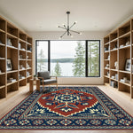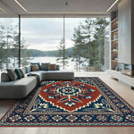 Drawing deeply from the storied lineage of Persian textile heritage and the sharp, disciplined geometry of Anatolian kilims, this design is a bridge across time. It echoes the historical elegance of Ottoman saz motifs while embracing a crisp, rhythmic clarity that suits the modern home. The deep navy backdrop acts as a midnight sky, against which crimson blossoms bloom with bold, unwavering intent. Every floral medallion sits within jagged, fortress-like peaks, creating a tension between the hallowed nature of ancient floral art and the structural, masculine strength of tribal weave. When placed in your room, the space undergoes a transformation; the floor ceases to be merely a surface and becomes a grounded anchor. For the heart-led decorator who balances a reverence for history with a need for modern utility, this is a sanctuary underfoot. Do not just furnish your room; anchor it with a legacy. Walk upon poetry. Live in reverence.