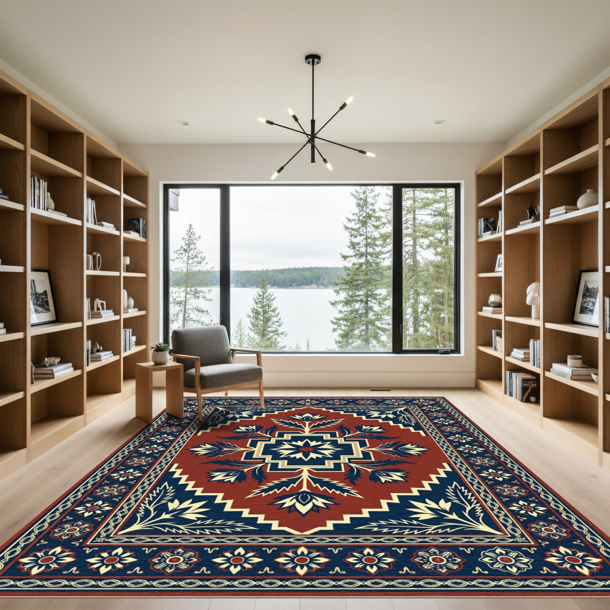 Elevate your home with this stunning area rug, blending timeless traditional charm with modern convenience. Featuring a rich palette of deep navy, crimson red, and warm cream, the intricate floral medallion design creates a sophisticated focal point for any living room or dining space. Beyond its striking visual appeal, the rug is incredibly durable, engineered to withstand high-traffic areas while maintaining its plush appearance. Designed for your busy lifestyle, it is fully machine washable for effortless cleaning. Every piece is OEKO-TEX Standard 100 certified, ensuring it is free from harmful substances for your peace of mind. With a low pile height that sits perfectly under furniture and doors, this rug combines classic Persian-inspired artistry with the practical performance today's homes demand.
